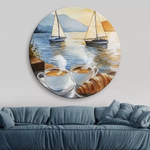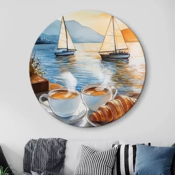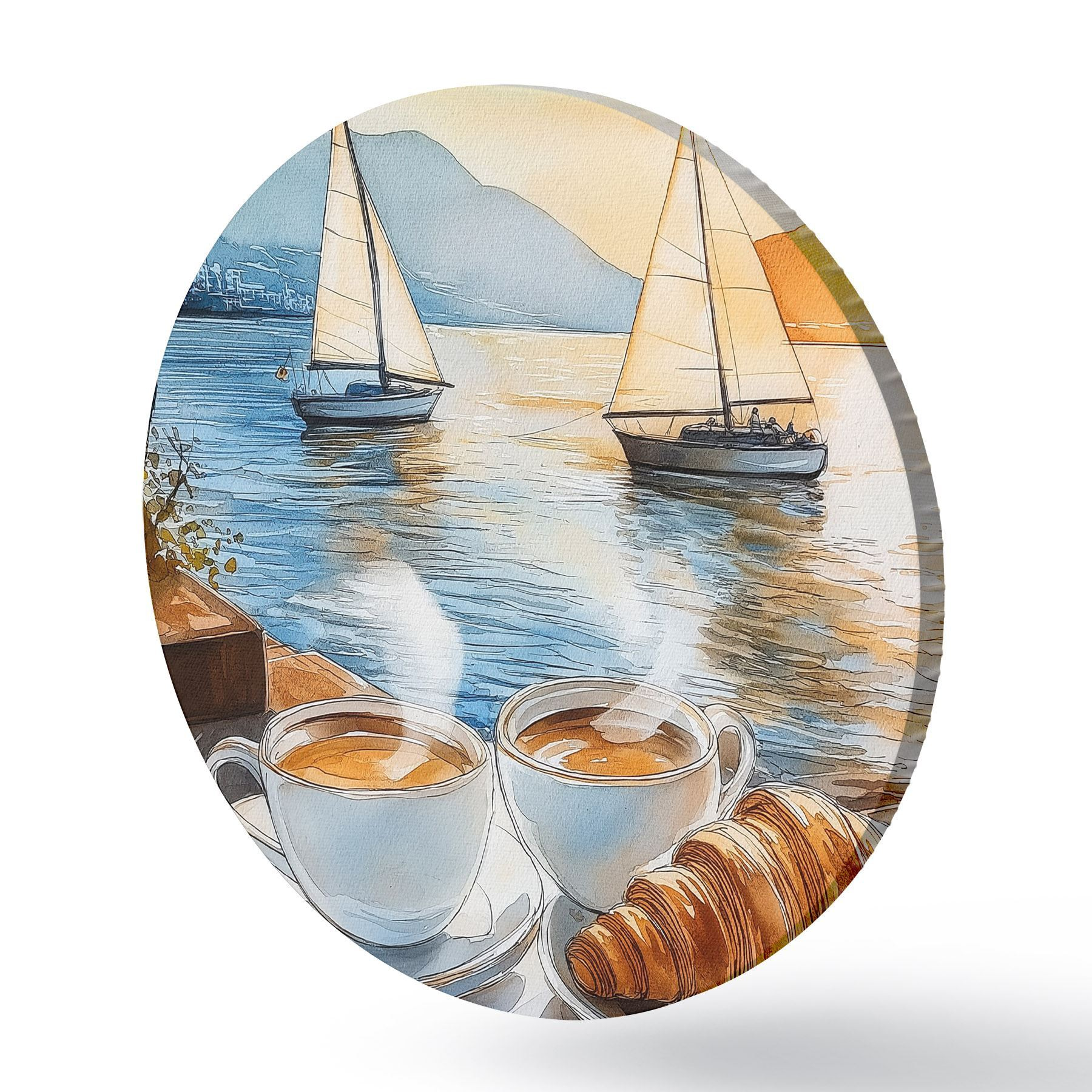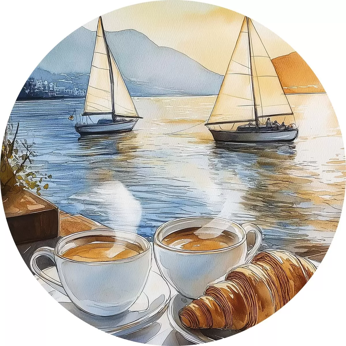Cuadros redondos Puesta de sol en el lago, veleros, tazas de café, estilo acuarela r42442