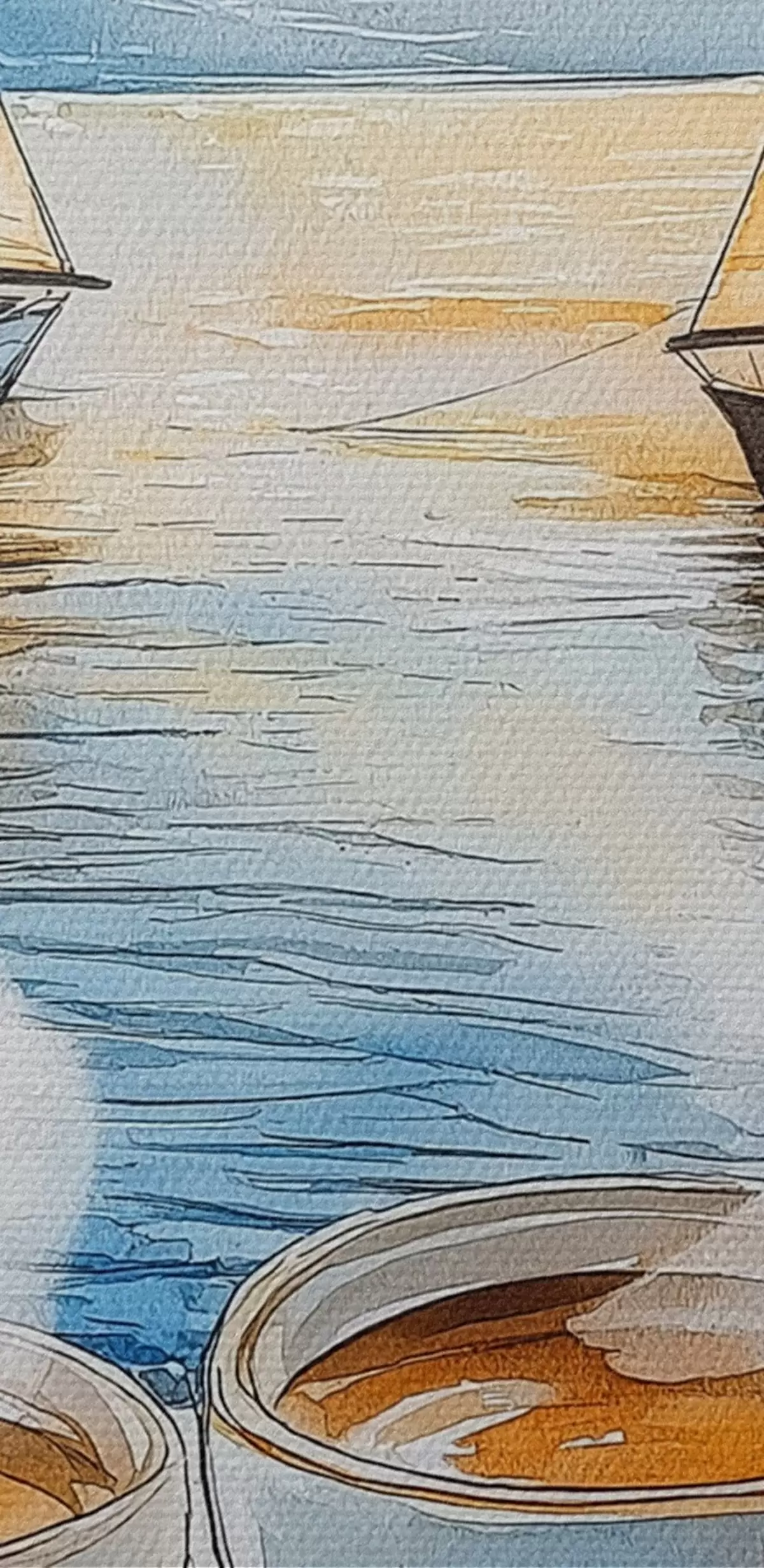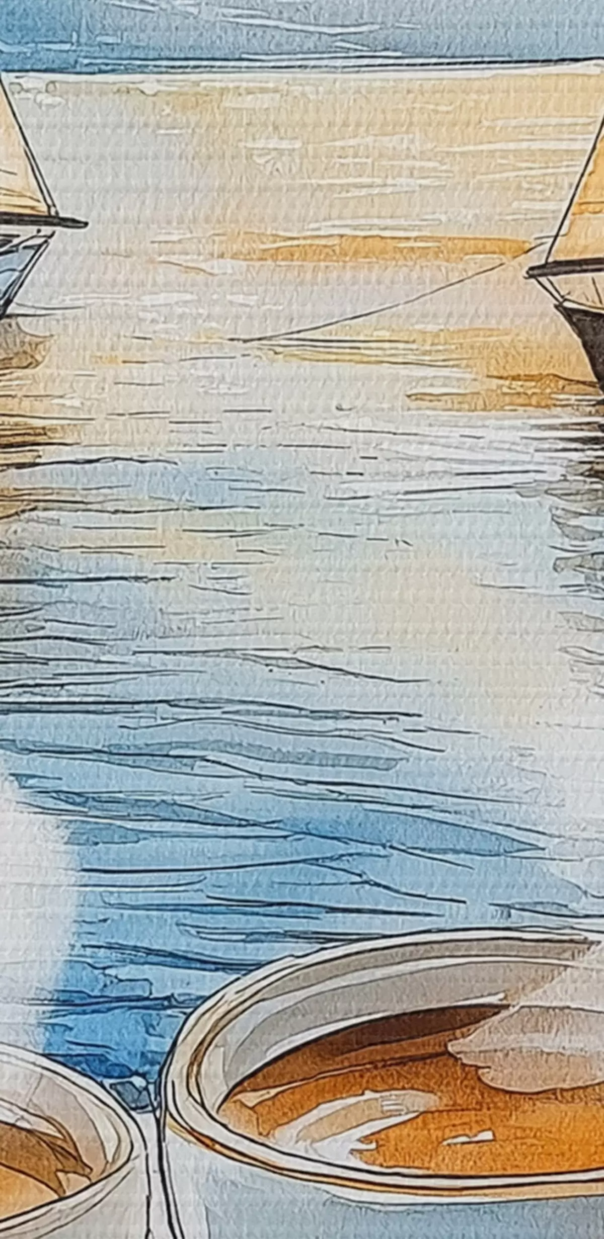 Foto Puesta de sol en el lago, veleros, tazas de café, estilo acuarela Nr r42442