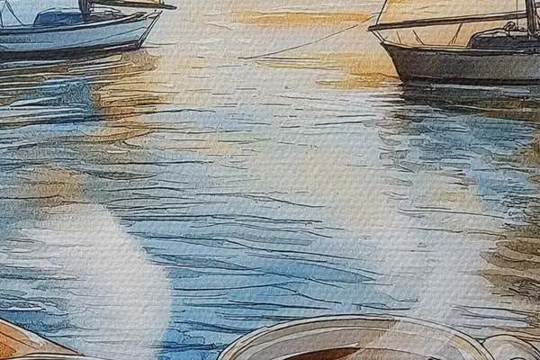 Foto Puesta de sol en el lago, veleros, tazas de café, estilo acuarela Nr r42442