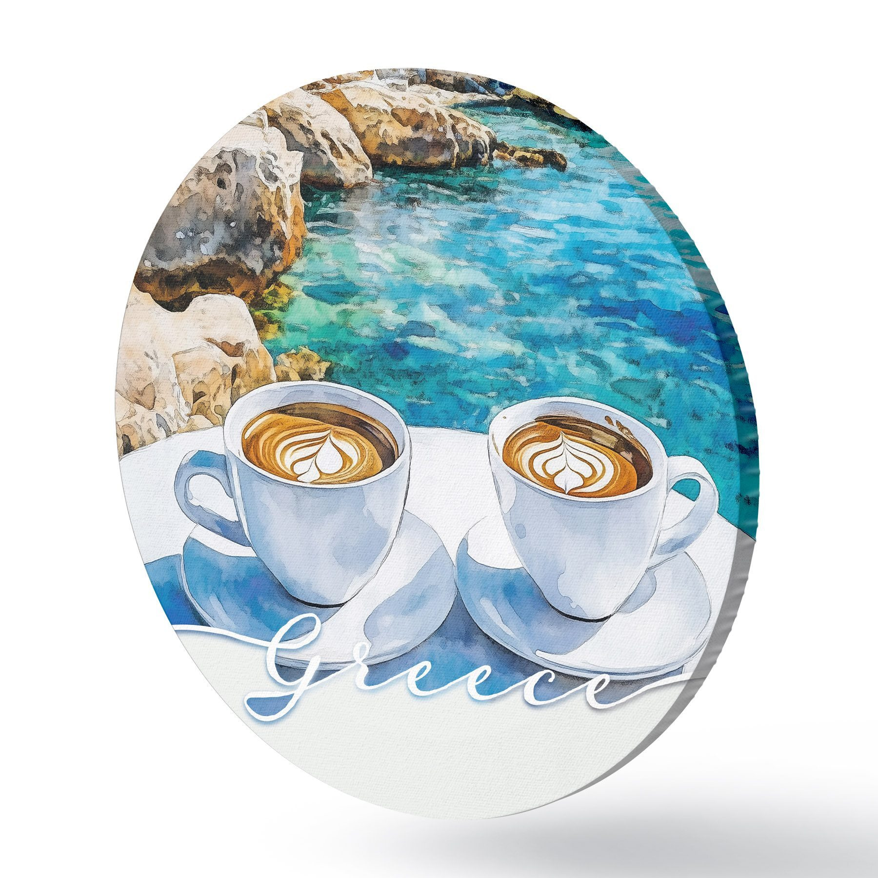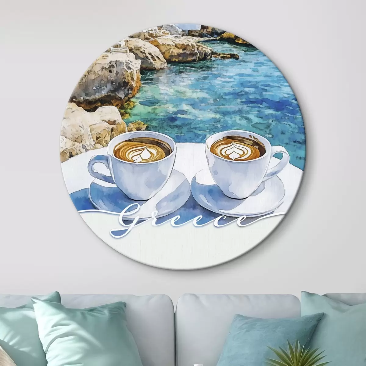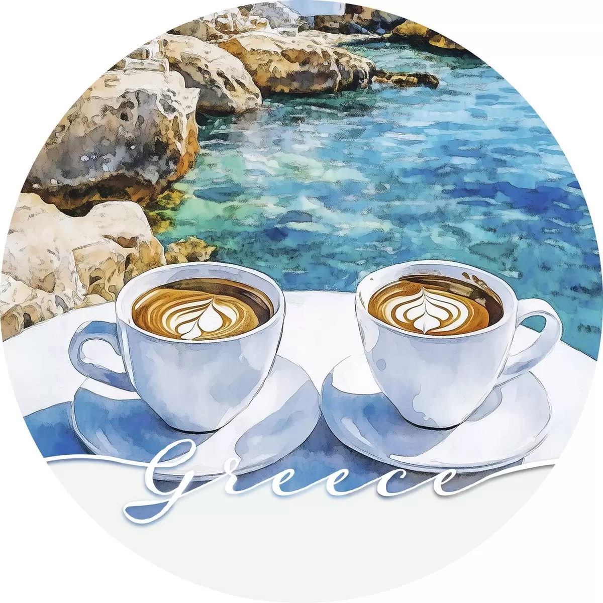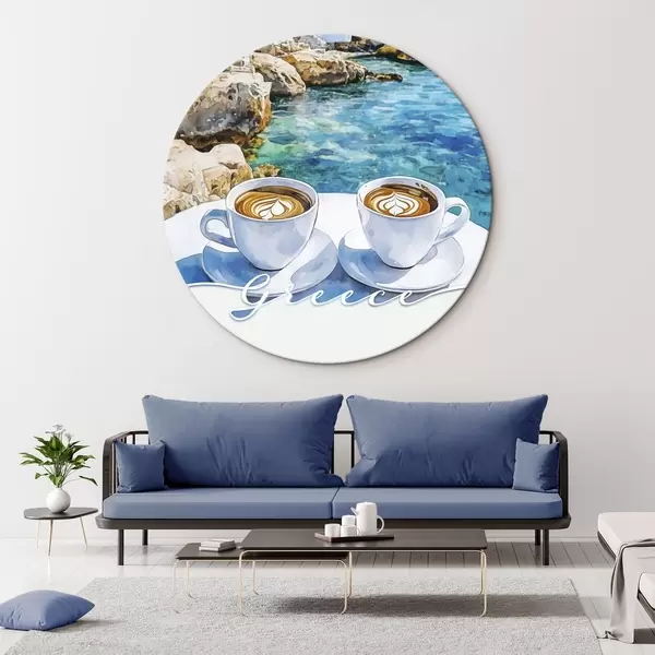 Cuadros redondos Grecia estética, tazas de café, mar azul, casco antiguo, viajes r42447