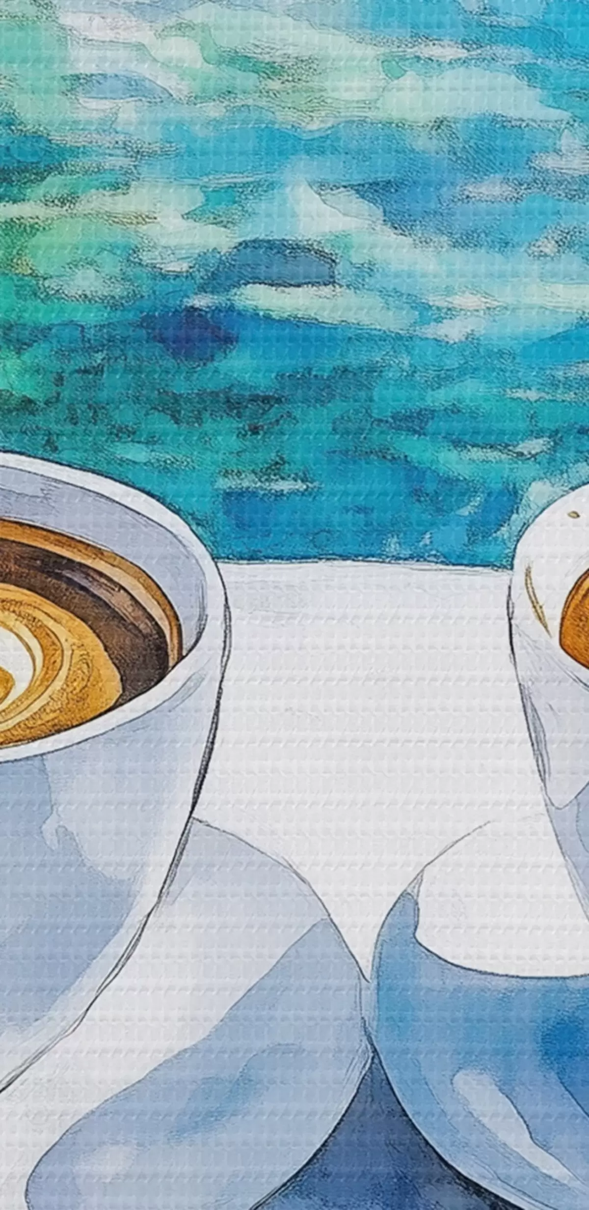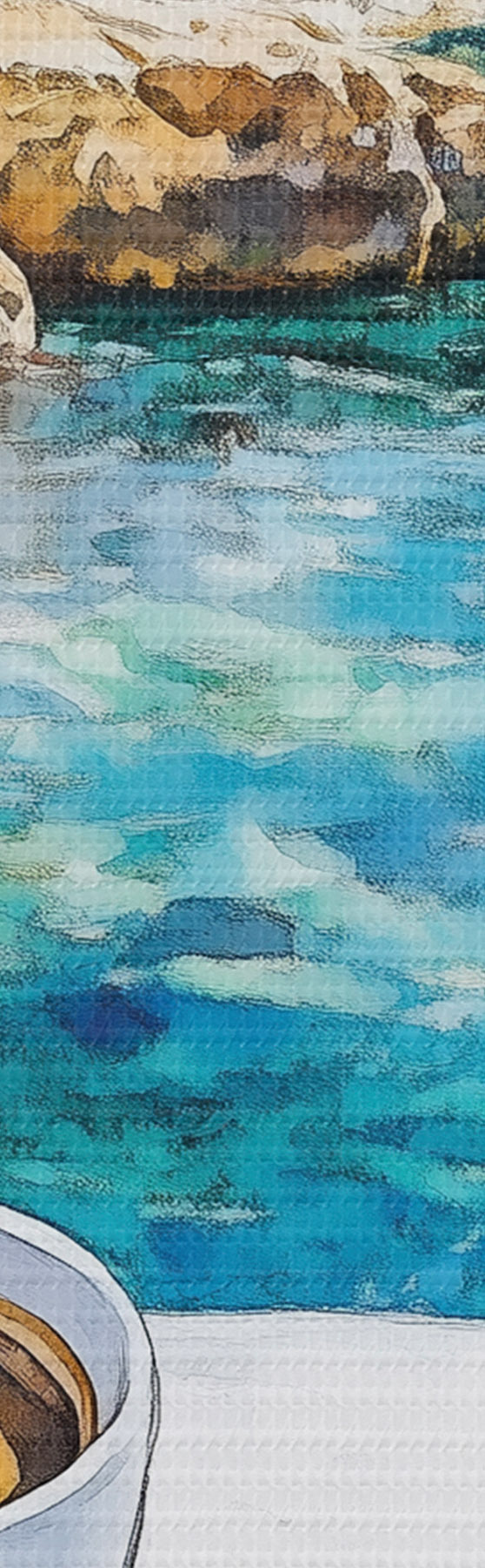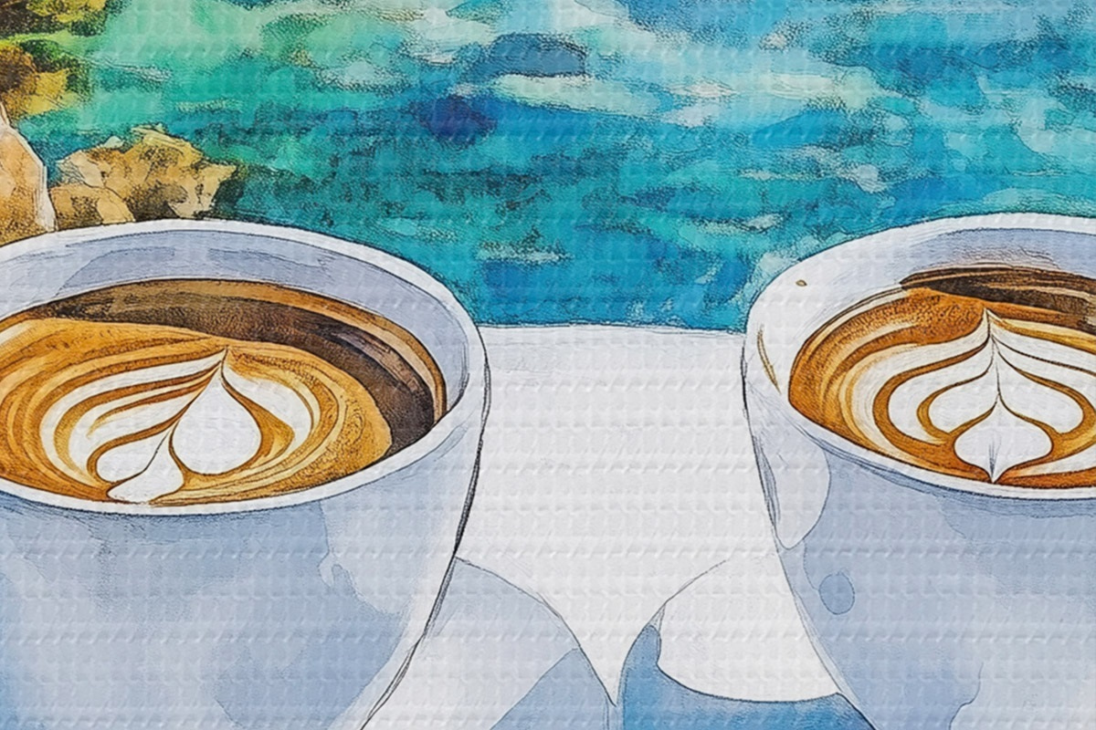 Cuadros redondos Grecia estética, tazas de café, mar azul, casco antiguo, viajes r42447