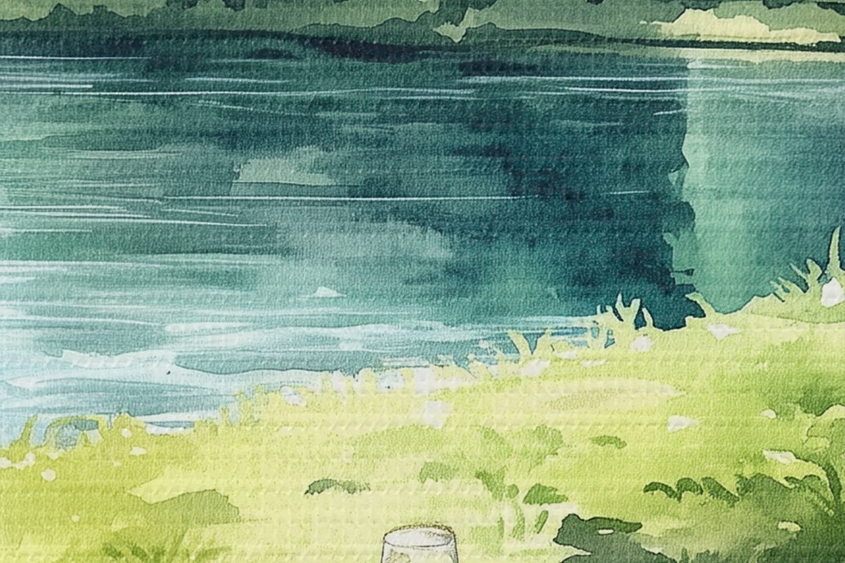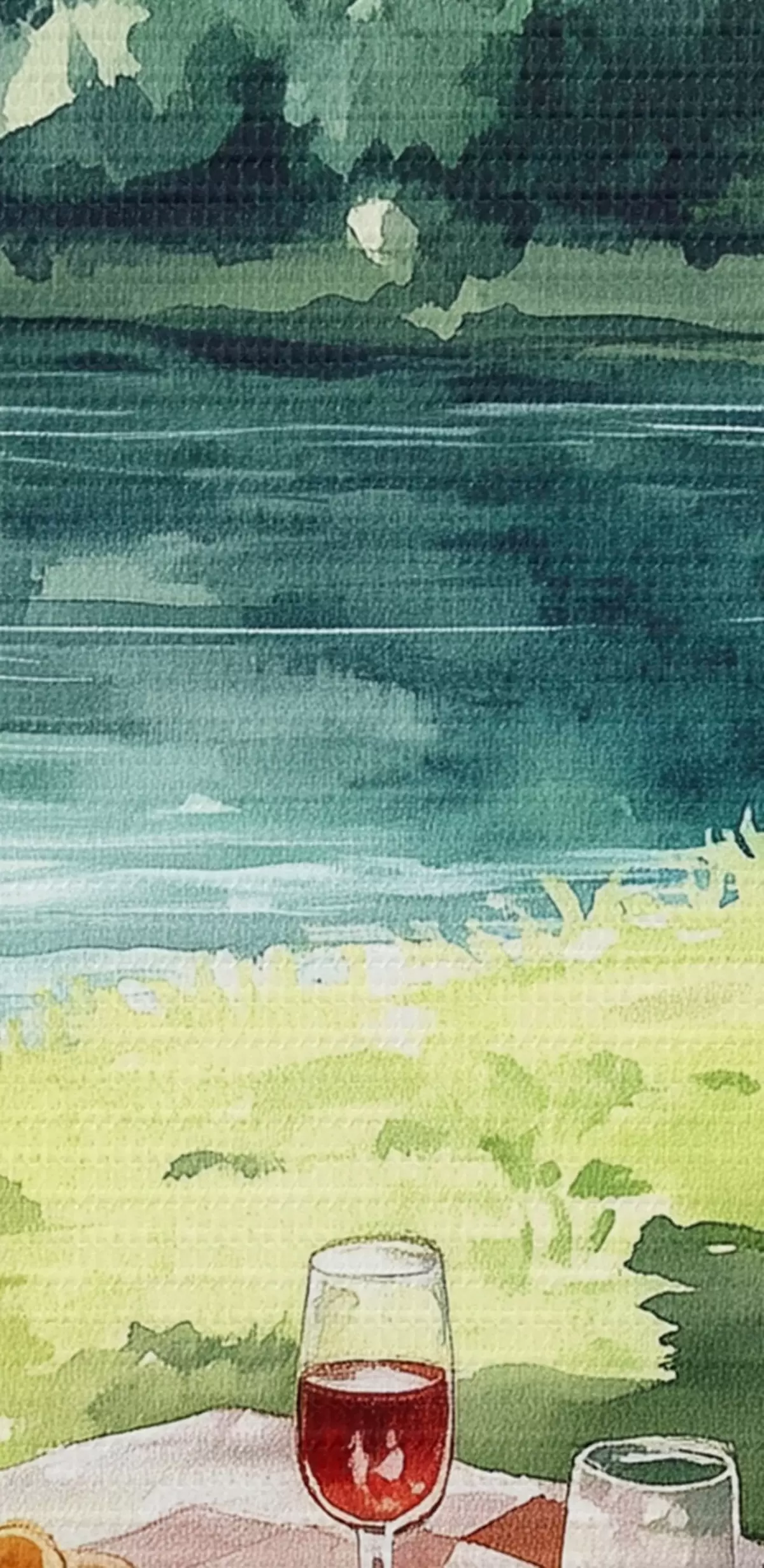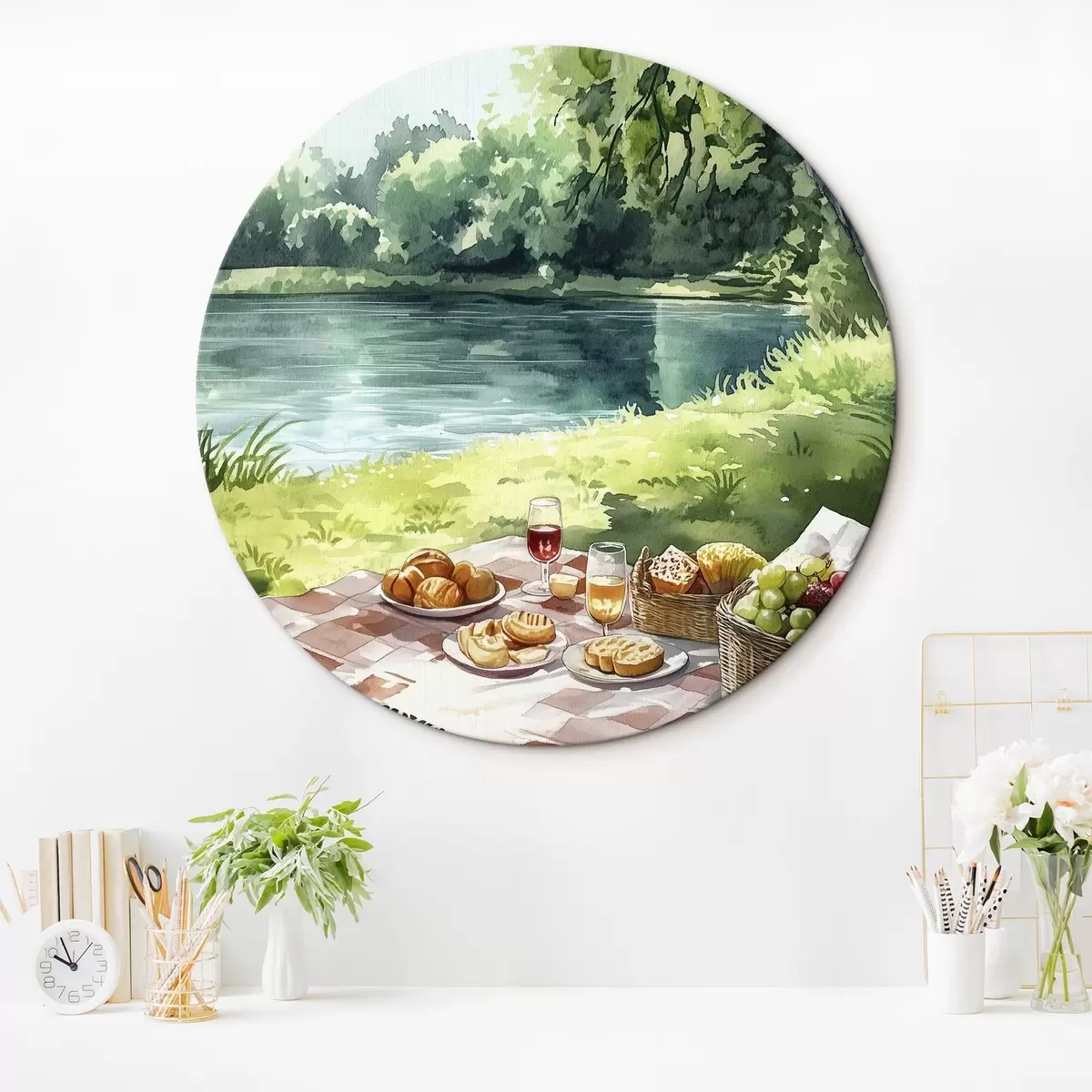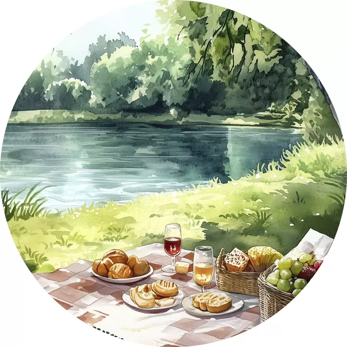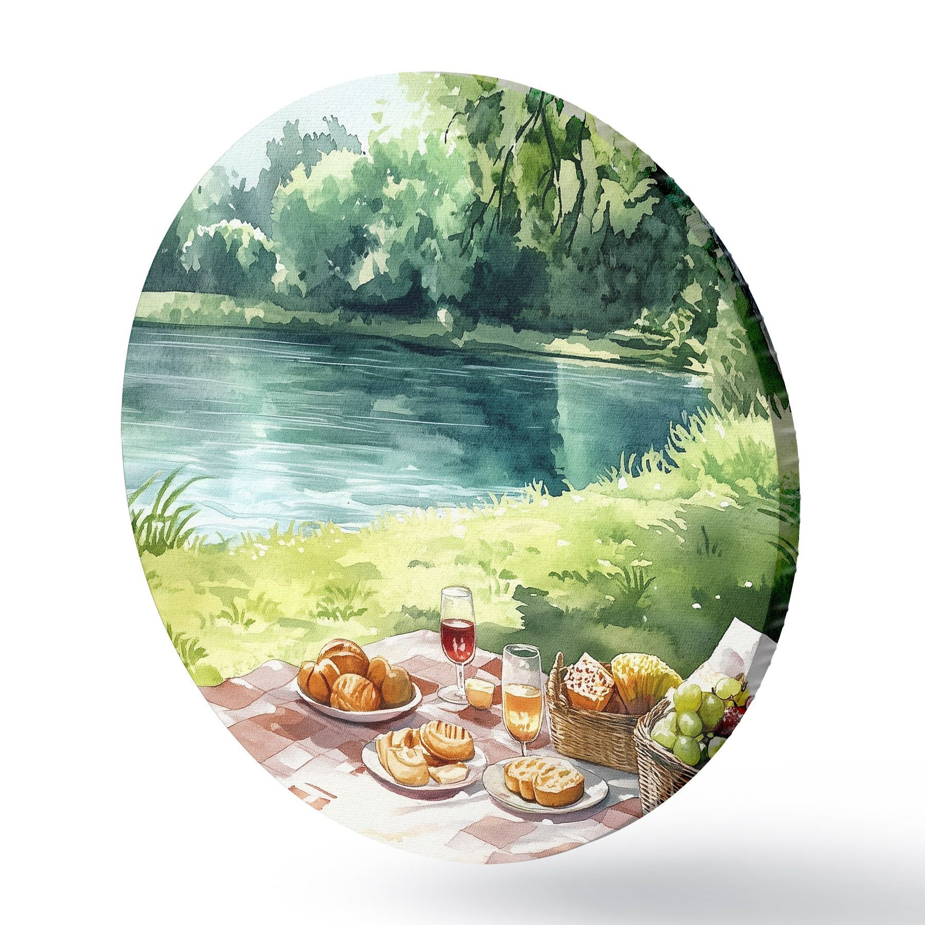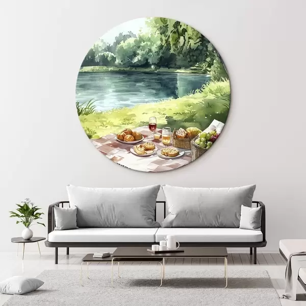 Cuadros redondos Hermoso picnic romántico por el lago de verano, frutas, vegetación r42451