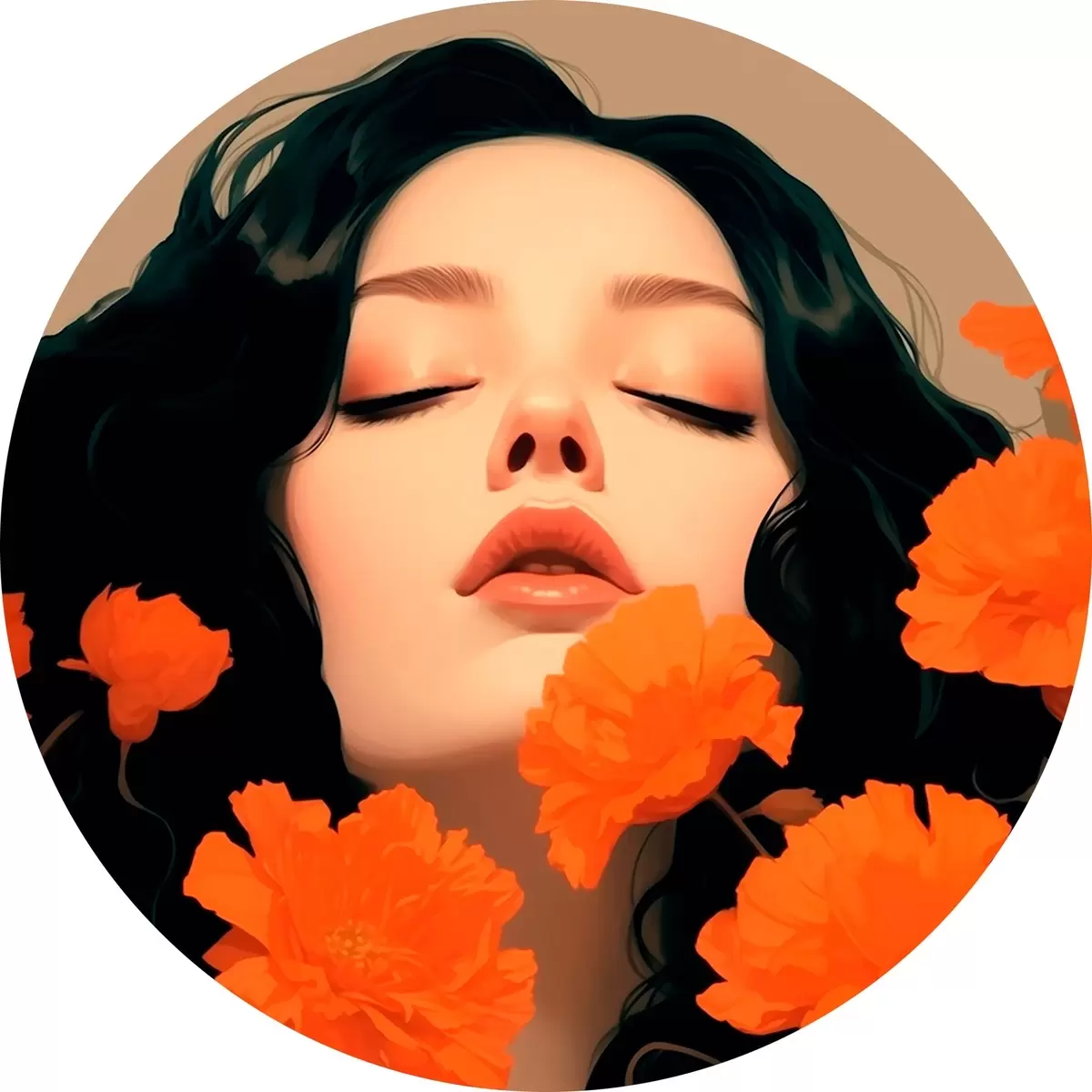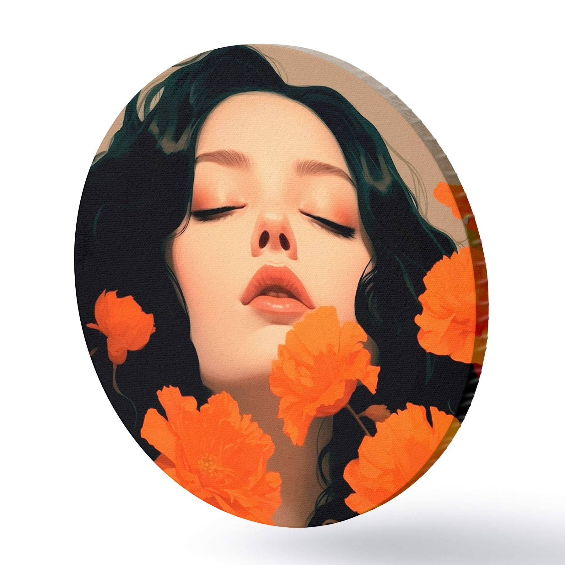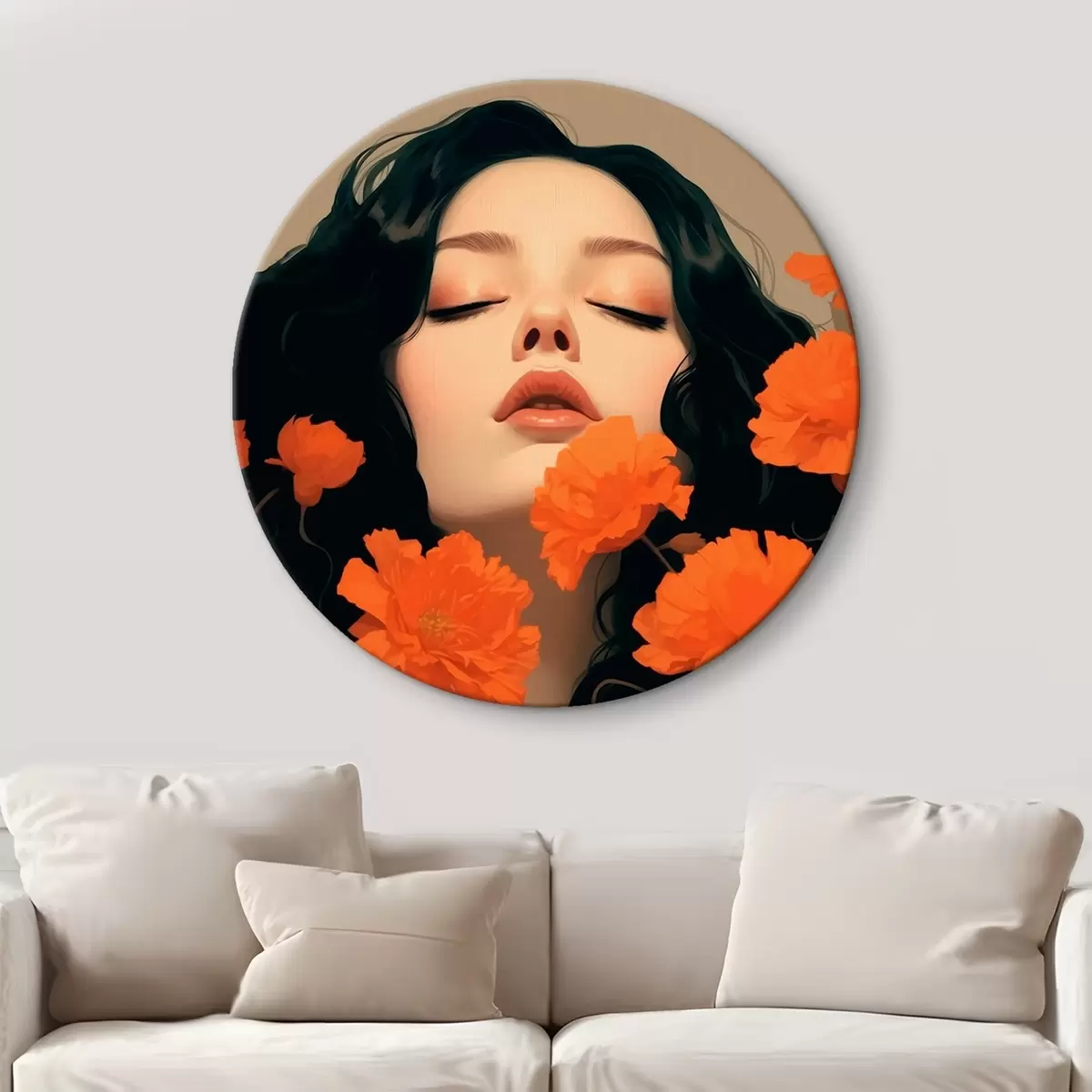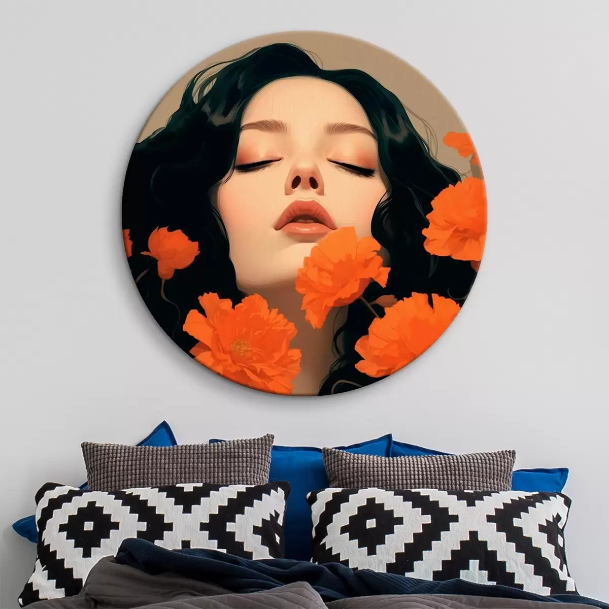Cuadros redondos Retrato femenino entre flores rojas r42478