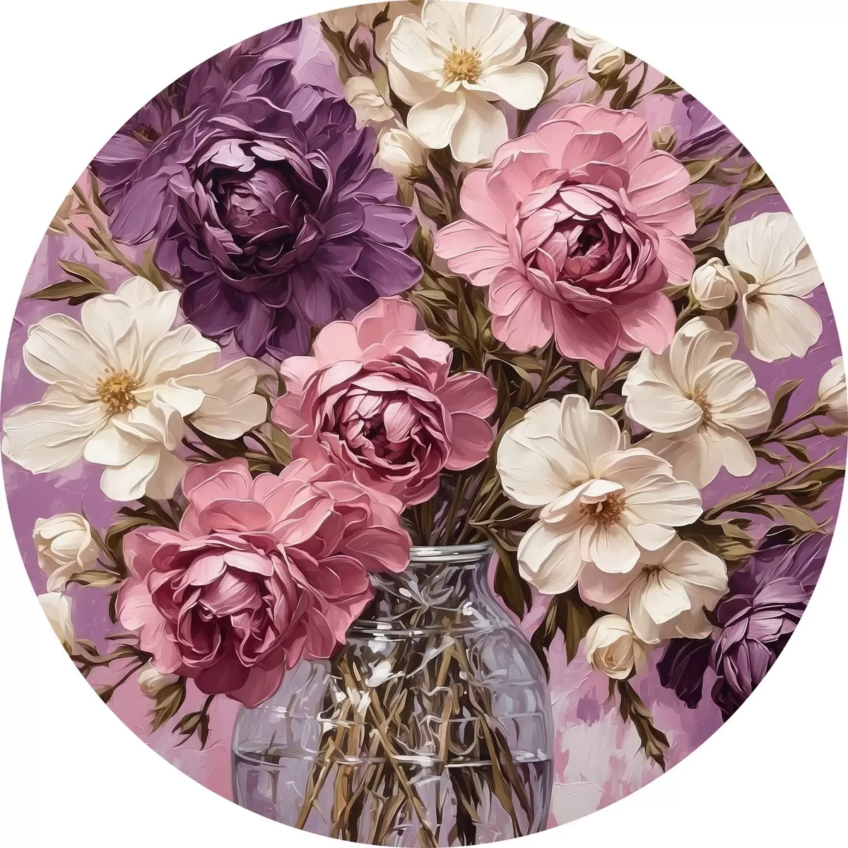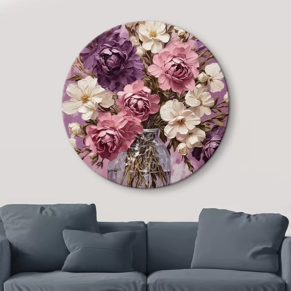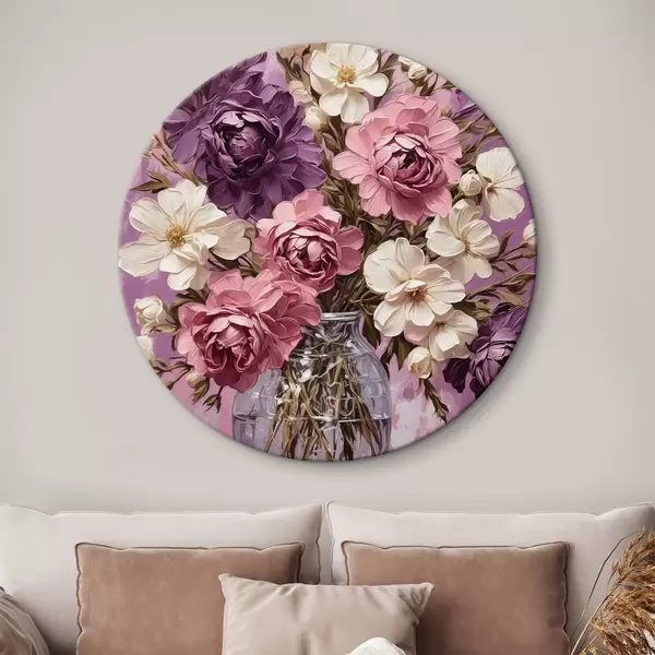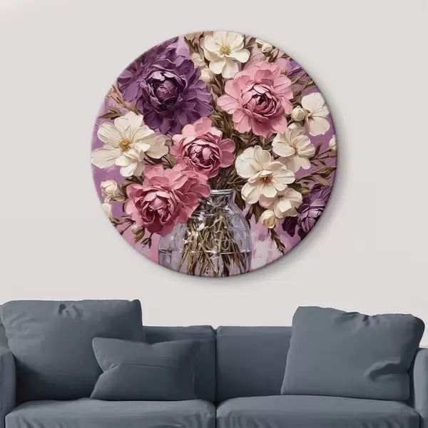 Cuadros redondos Flores en jarrón transparente sobre fondo morado r42535