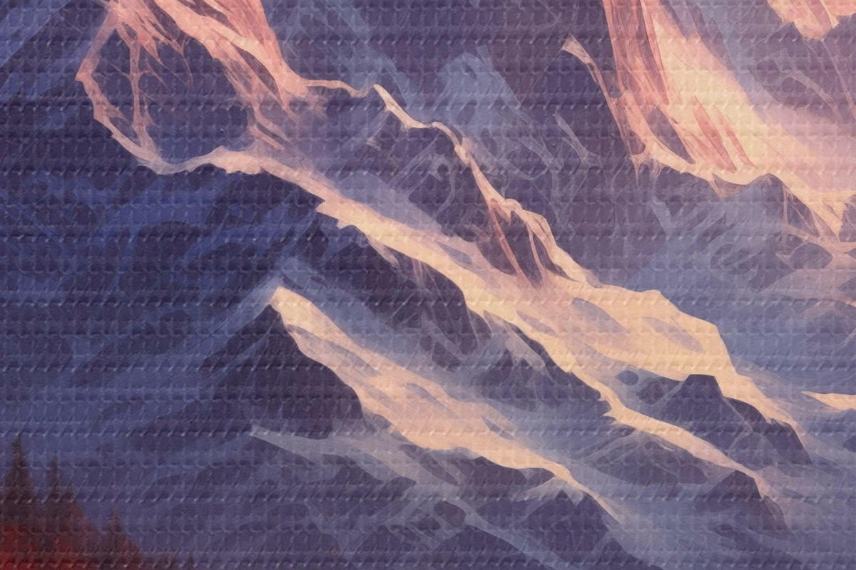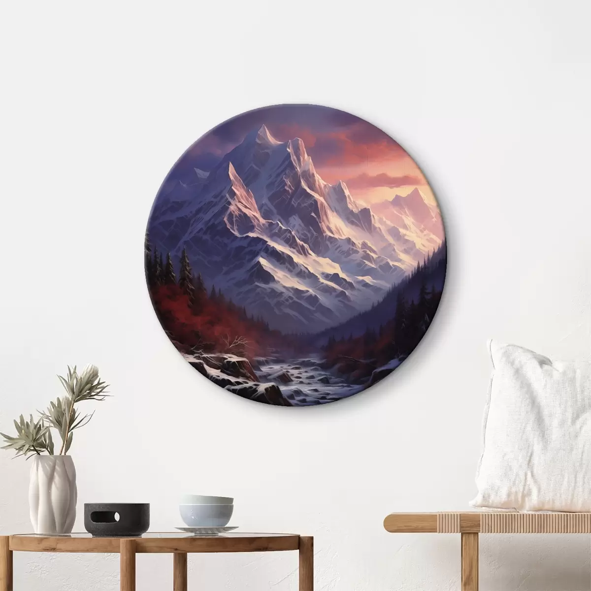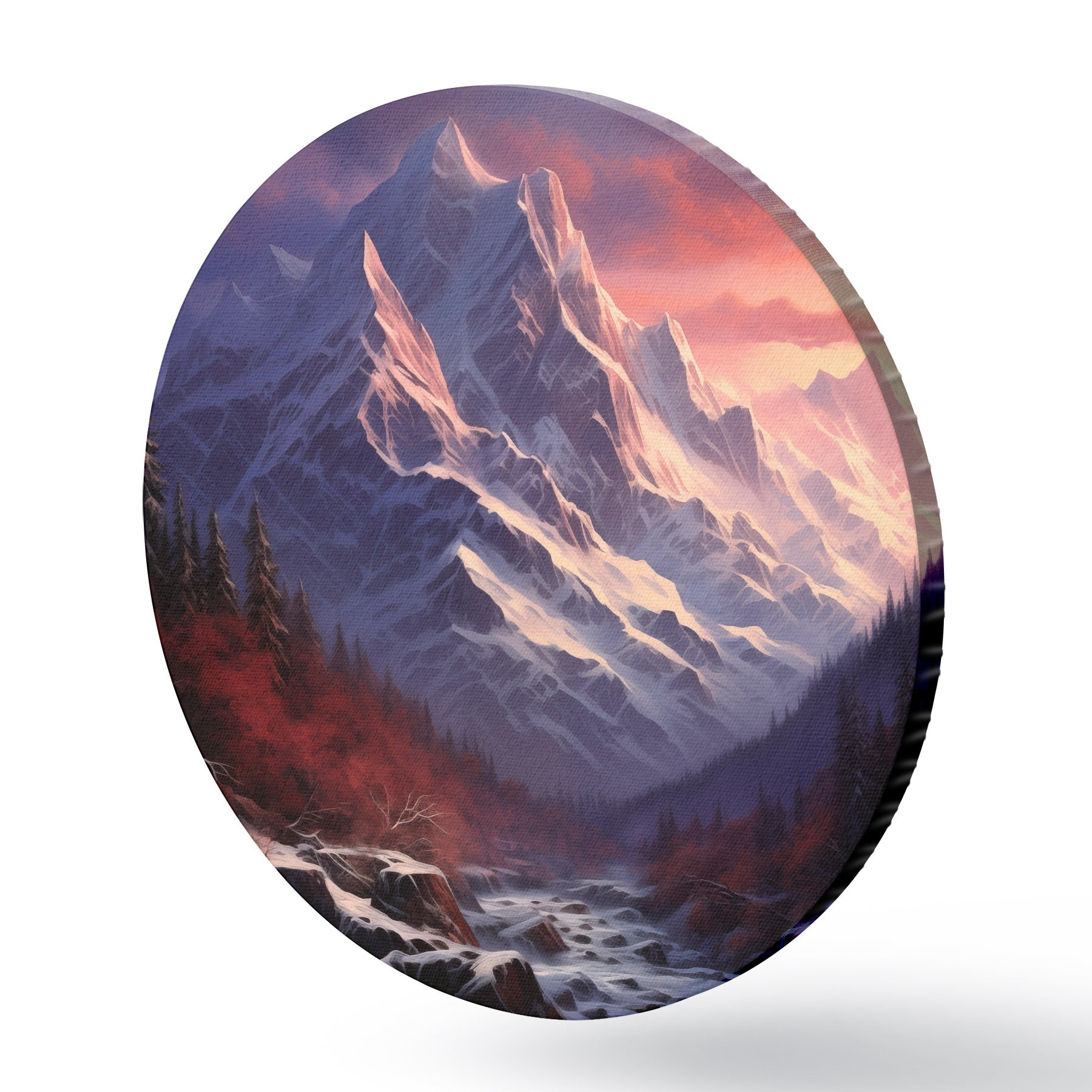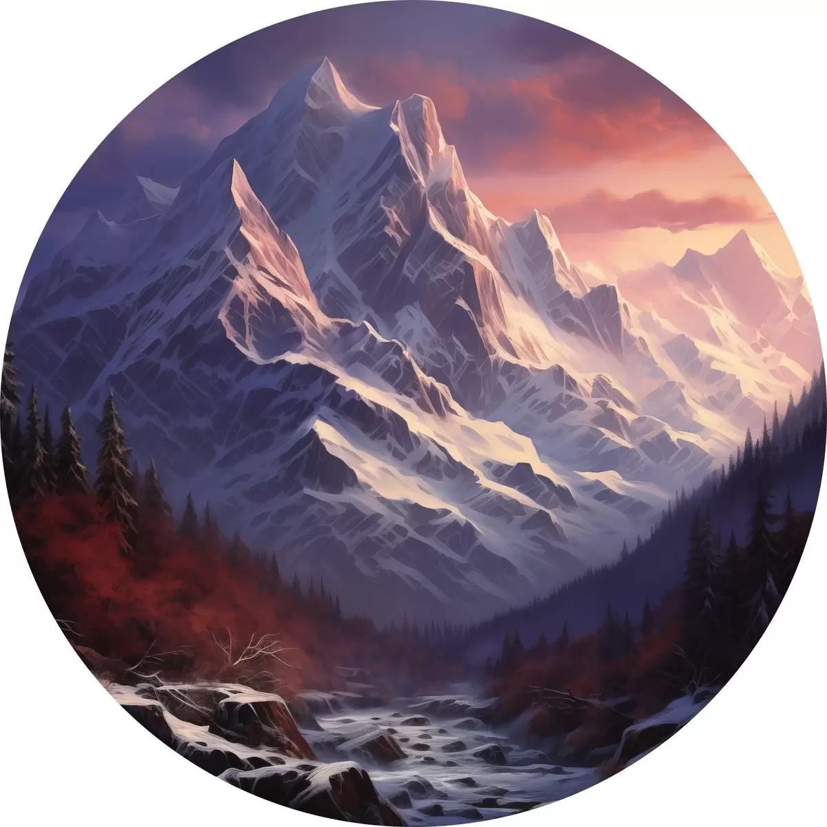 Cuadros redondos Un impresionante paisaje de montaña al atardecer, con picos nevados, pinos oscuros y suaves tonos rosas y morados en el cielo r42566