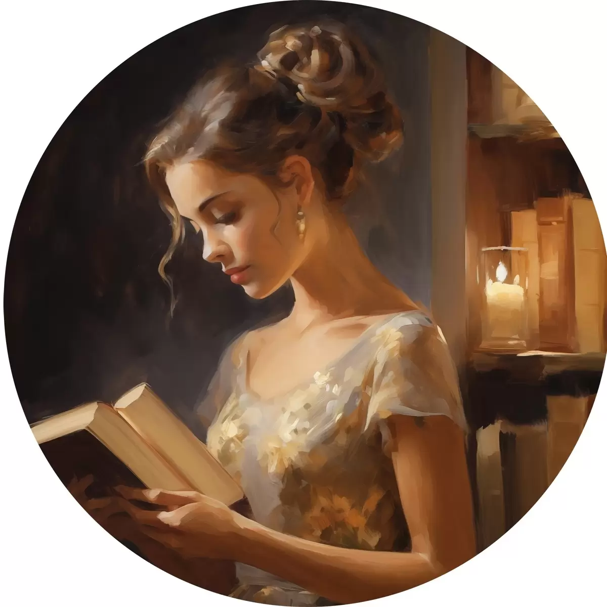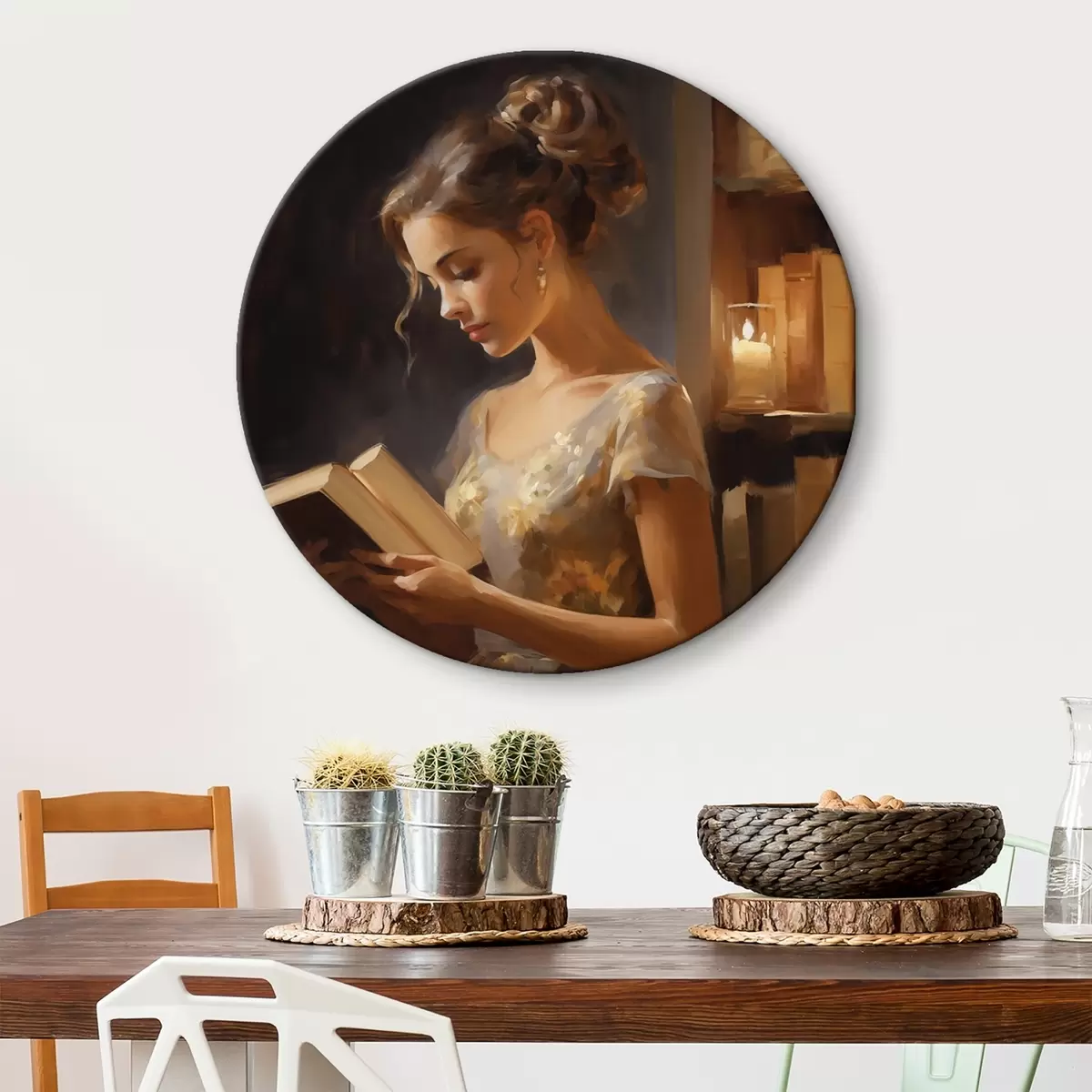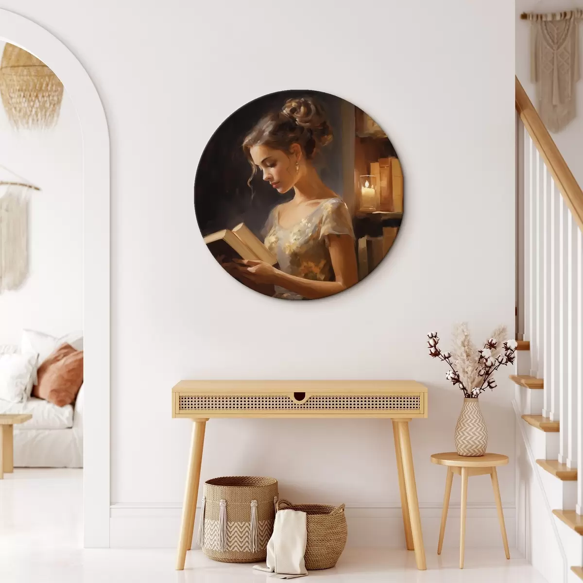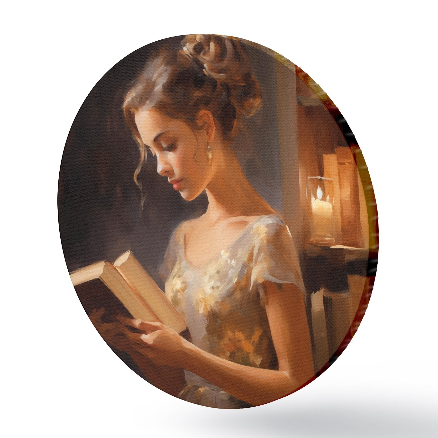 Cuadros redondos Una mujer joven con un vestido elegante lee un libro en un ambiente iluminado, rodeada de estanterías y del suave resplandor de las velas r42570