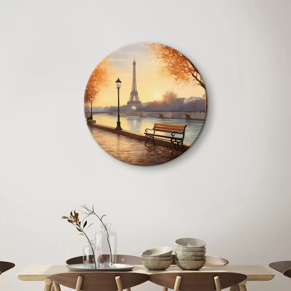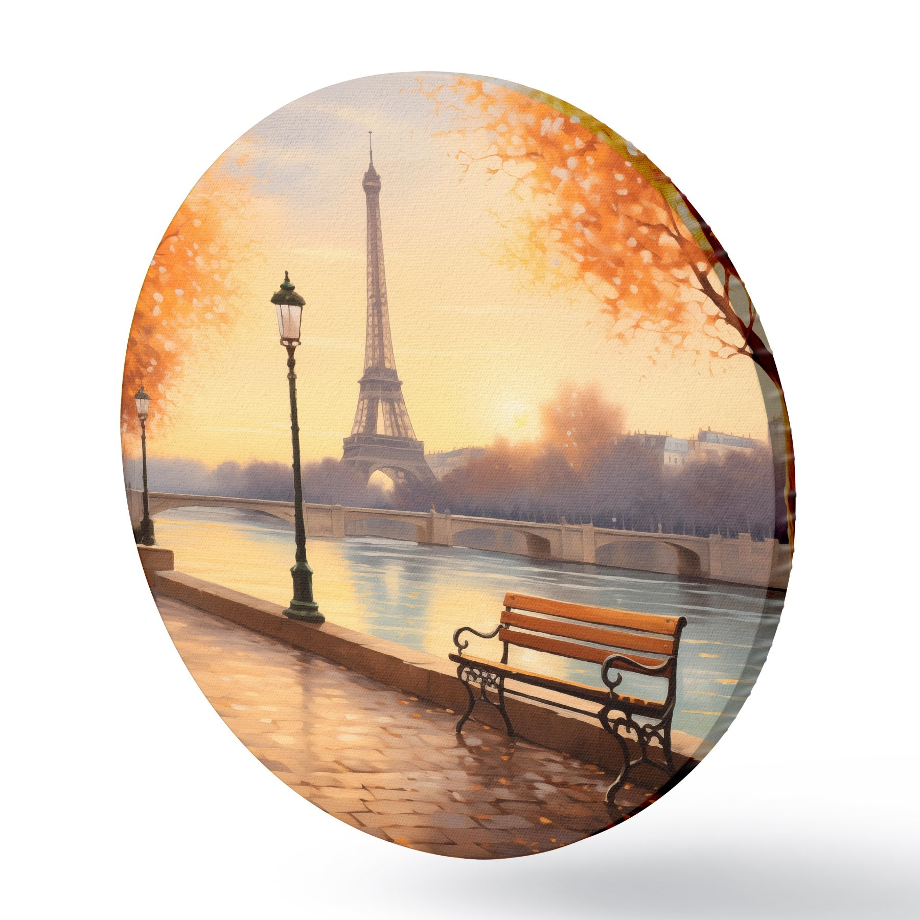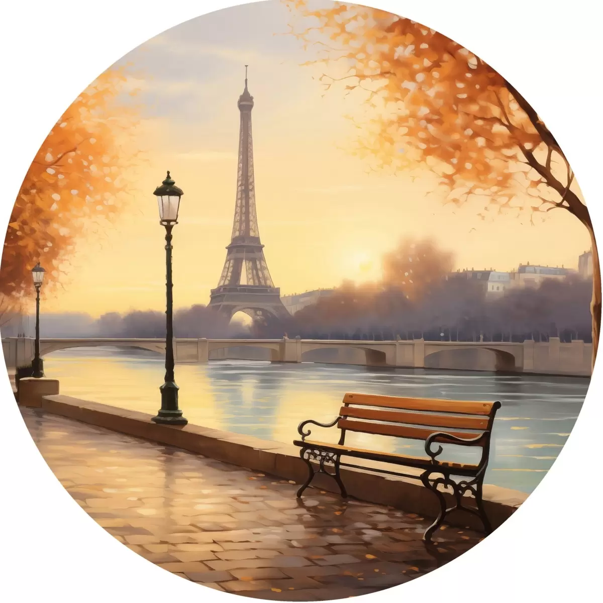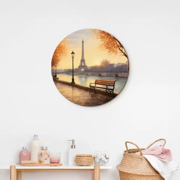 Cuadros redondos Otoño en París con vistas a la Torre Eiffel, el Sena cubierto de hojas doradas, bancos y farolas que añaden un ambiente romántico r42577