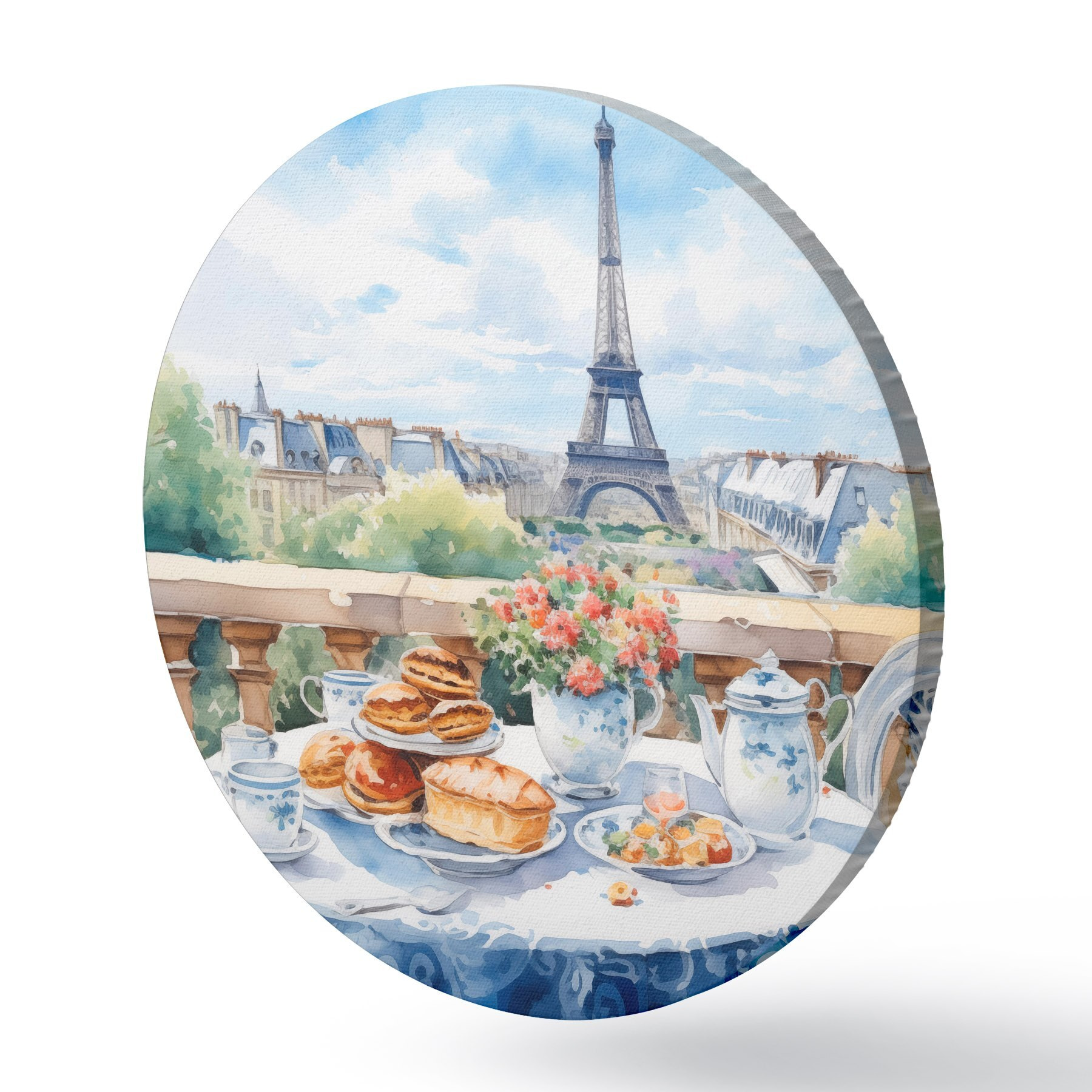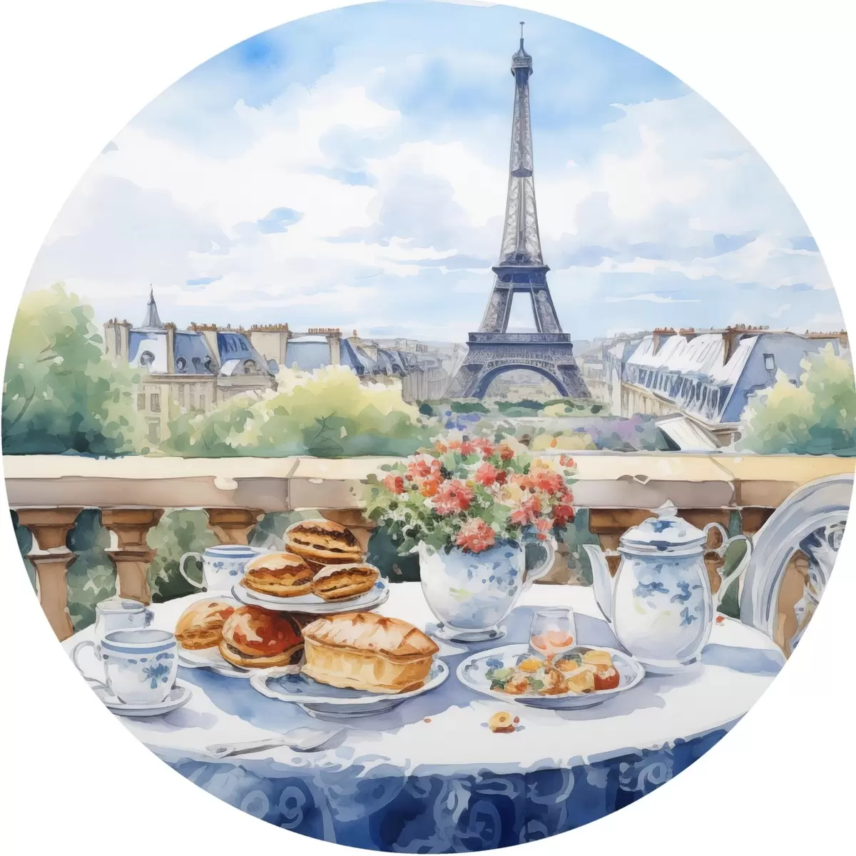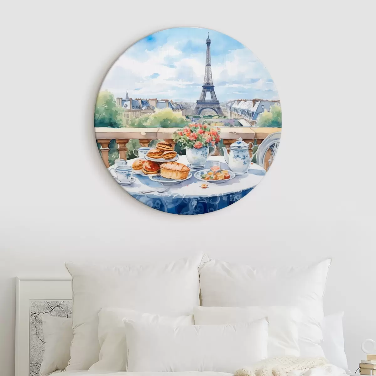 Cuadros redondos Una romántica vista de la Torre Eiffel desde un balcón con una mesa puesta con postres, té y flores en un ambiente veraniego r42579