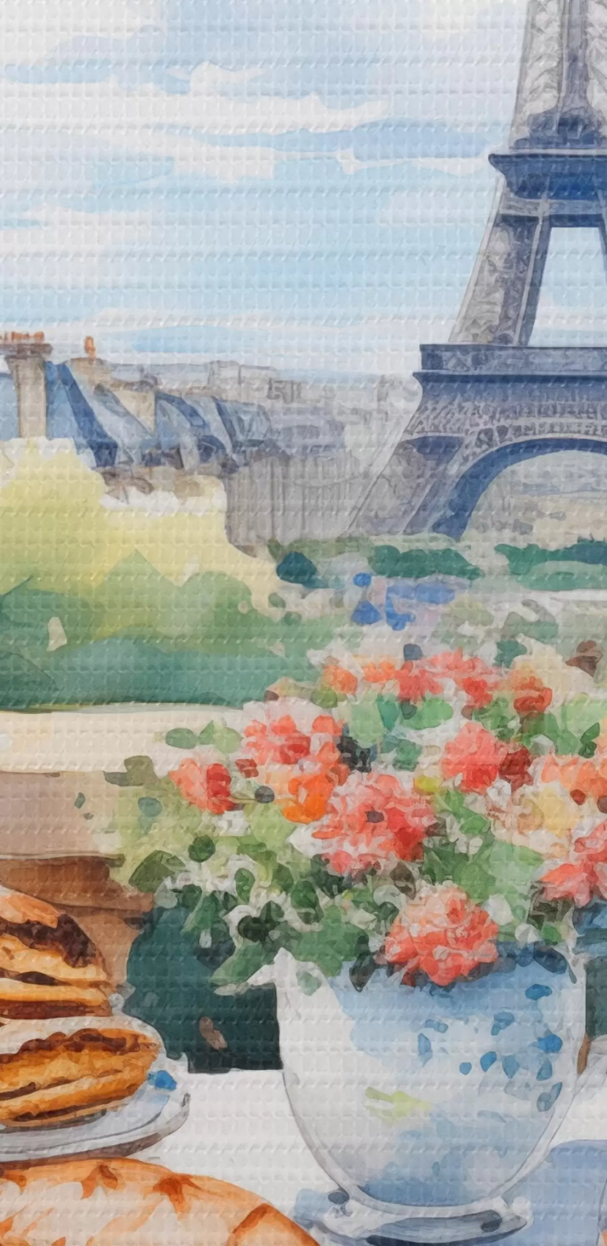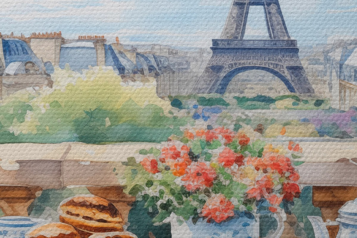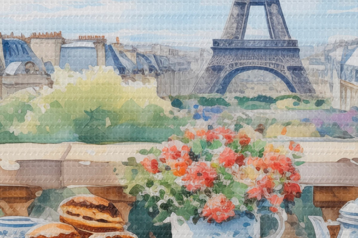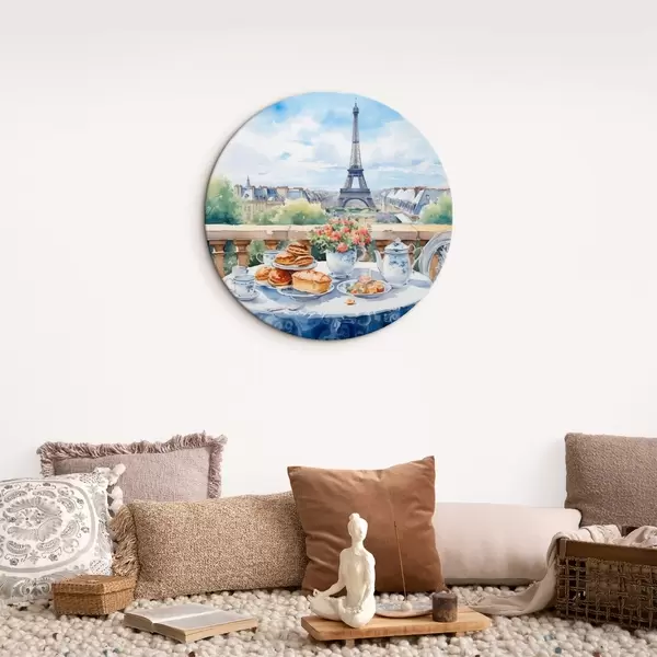 Cuadros redondos Una romántica vista de la Torre Eiffel desde un balcón con una mesa puesta con postres, té y flores en un ambiente veraniego r42579