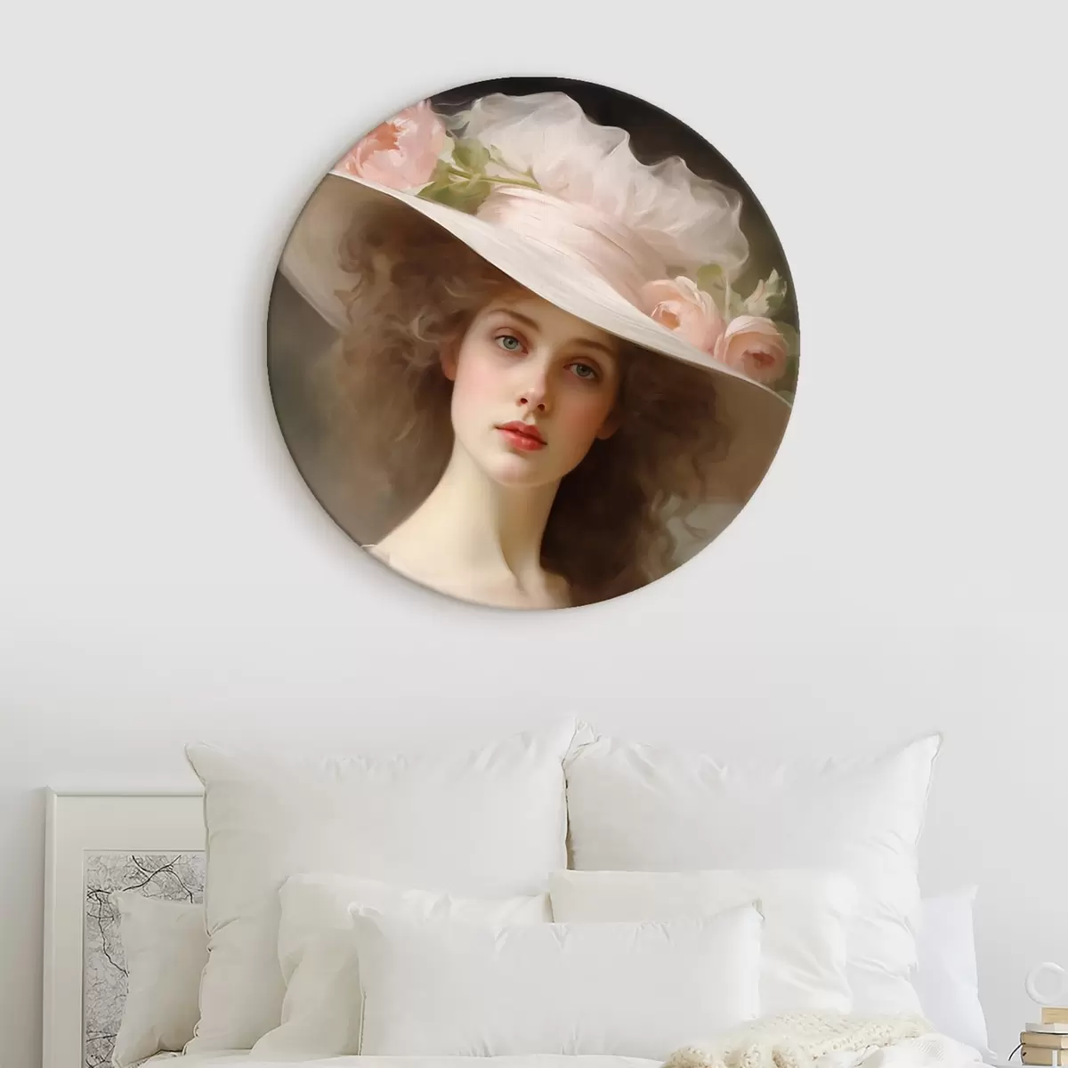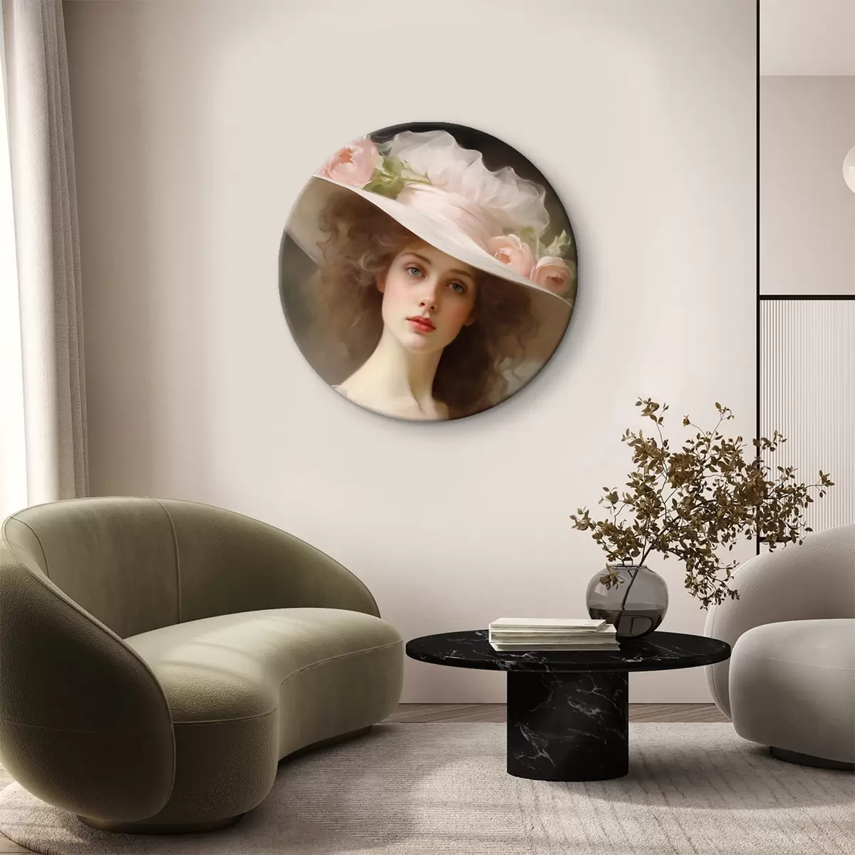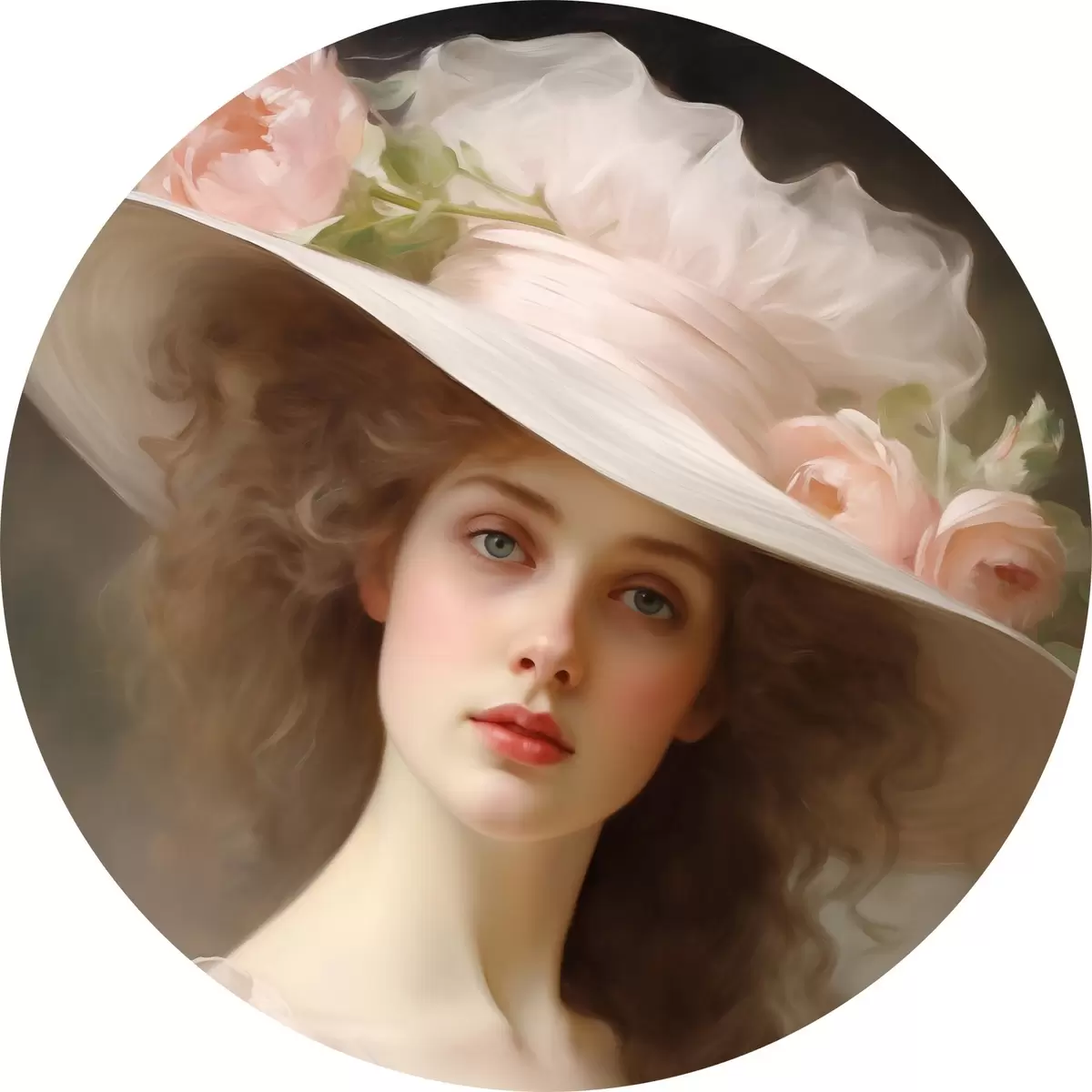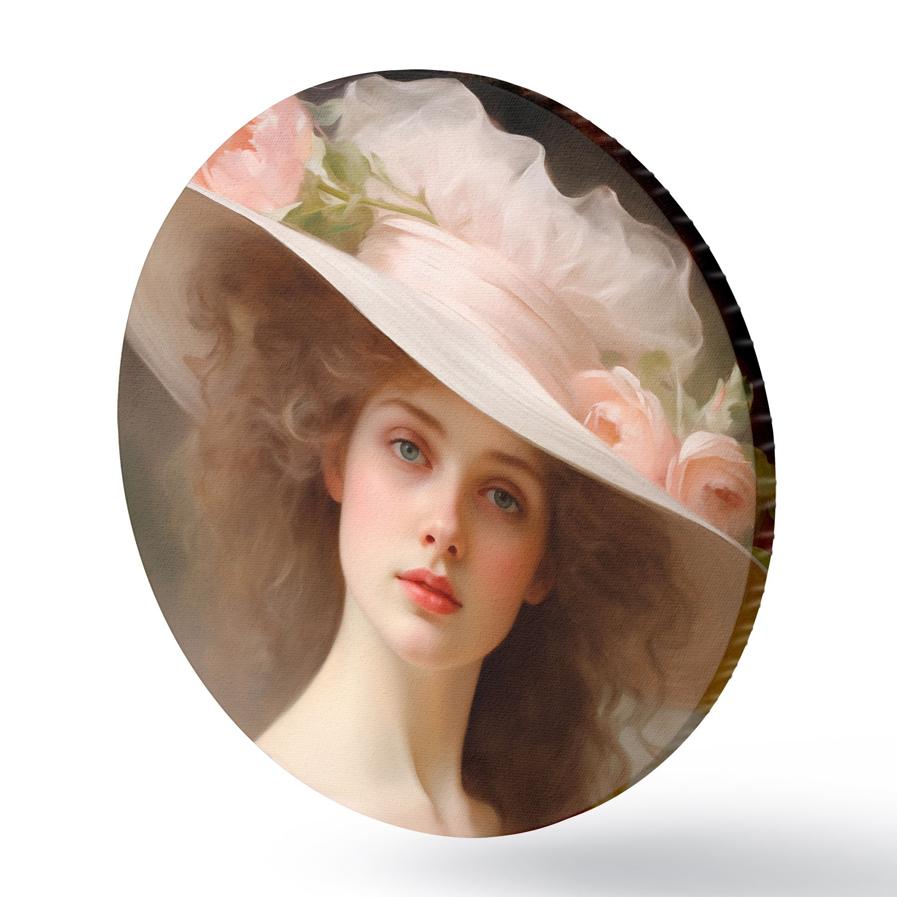 Cuadros redondos Retrato de una joven con un delicado vestido rosa y un sombrero adornado con flores, de expresión romántica y refinada r42581