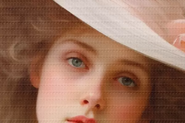 Foto Retrato de una joven con un delicado vestido rosa y un sombrero adornado con flores, de expresión romántica y refinada Nr r42581