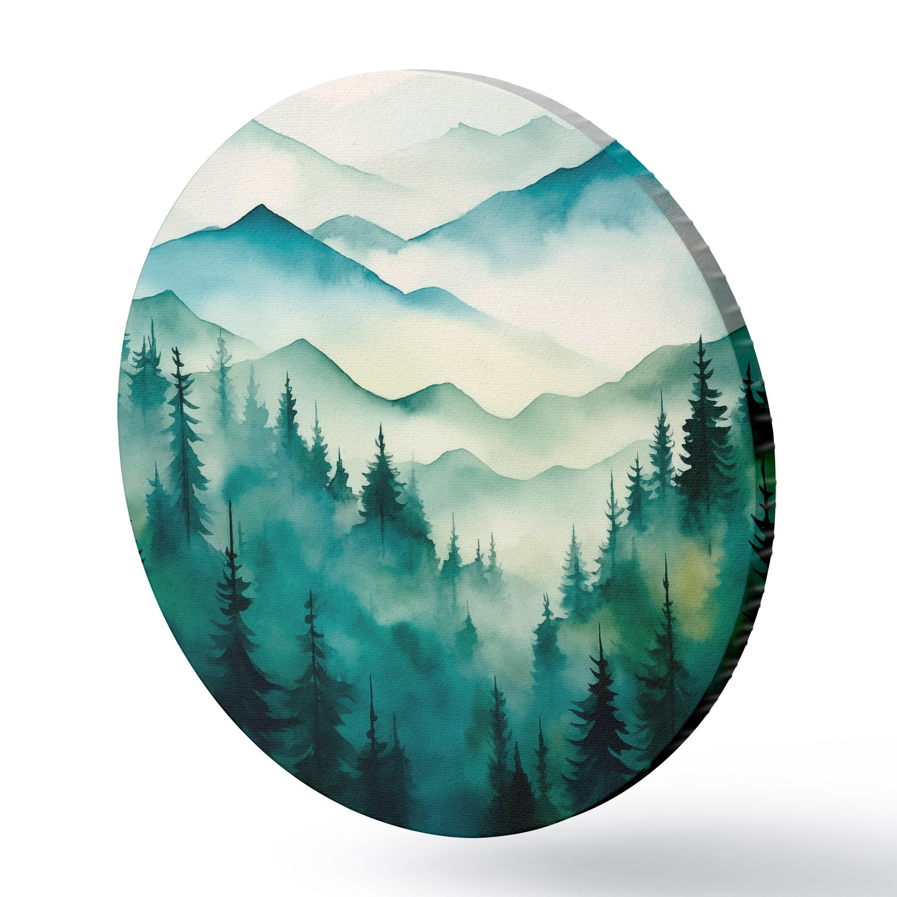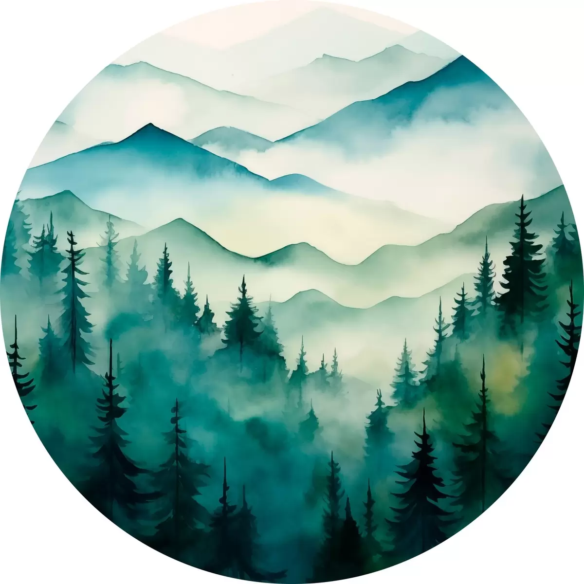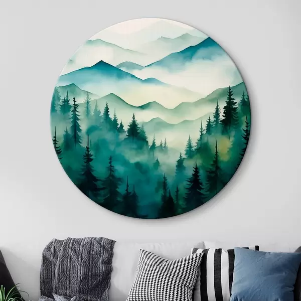 Cuadros redondos Paisaje brumoso con montañas y bosque r42662