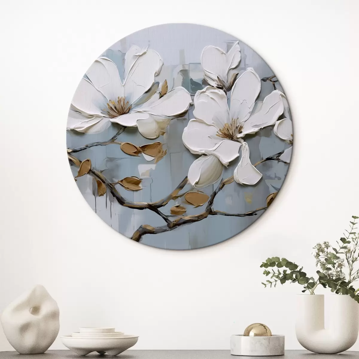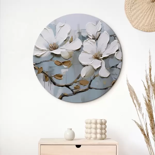 Cuadros redondos Flores de magnolia blanca con pétalos texturizados y hojas marrones sobre un fondo azul suave imitación pintura al óleo r42711