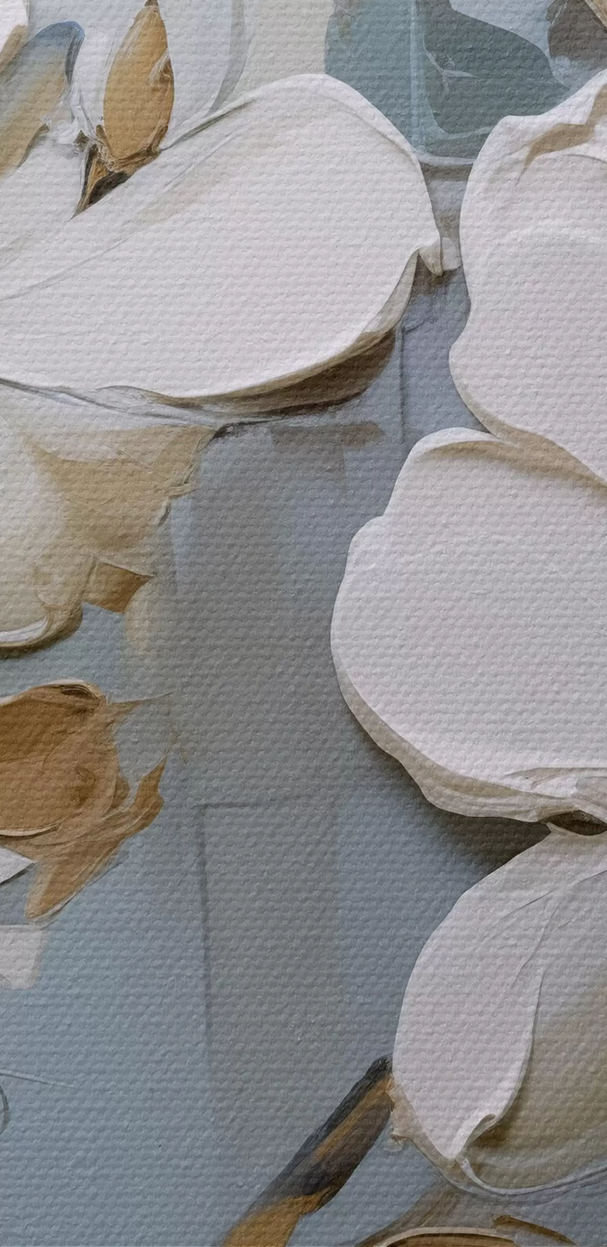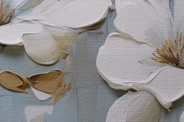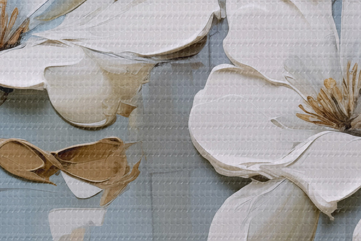Foto Flores de magnolia blanca con pétalos texturizados y hojas marrones sobre un fondo azul suave imitación pintura al óleo Nr r42711