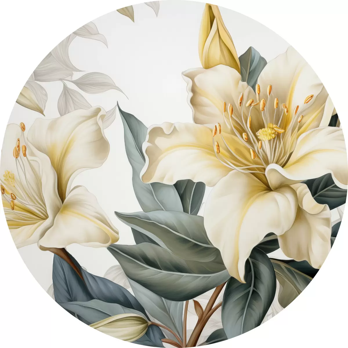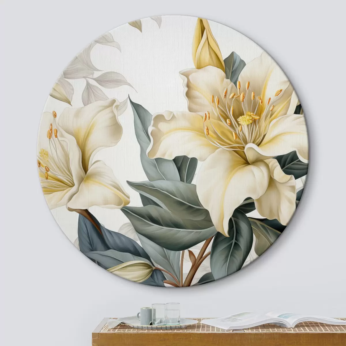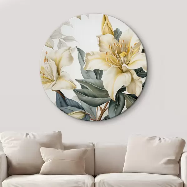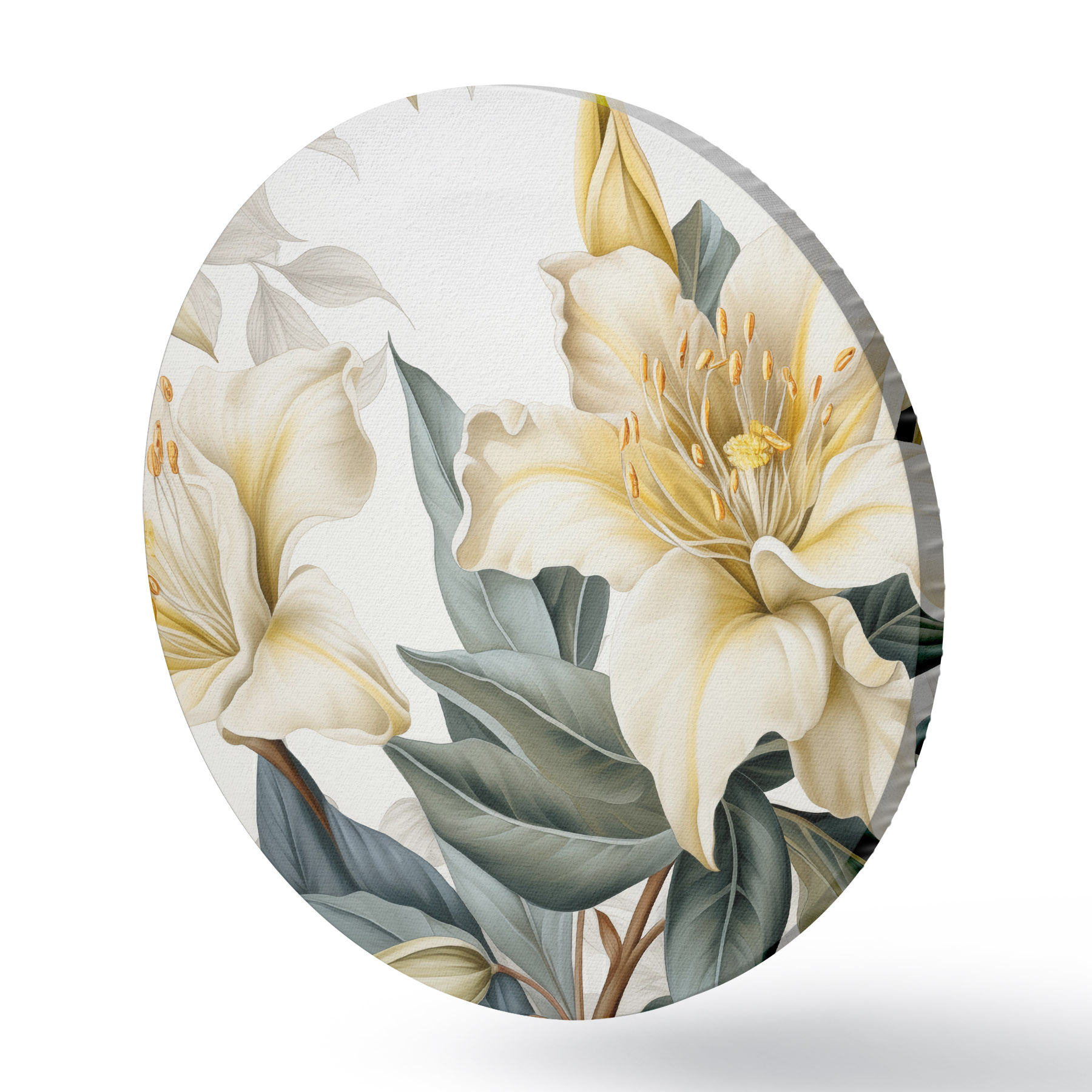 Cuadros redondos Ilustración botánica de flores blancas y amarillo pálido con intrincados pétalos, rodeadas de hojas verdes r42712
