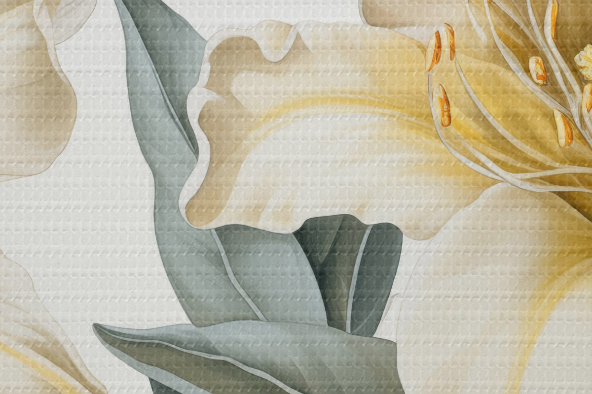 Foto Ilustración botánica de flores blancas y amarillo pálido con intrincados pétalos, rodeadas de hojas verdes Nr r42712