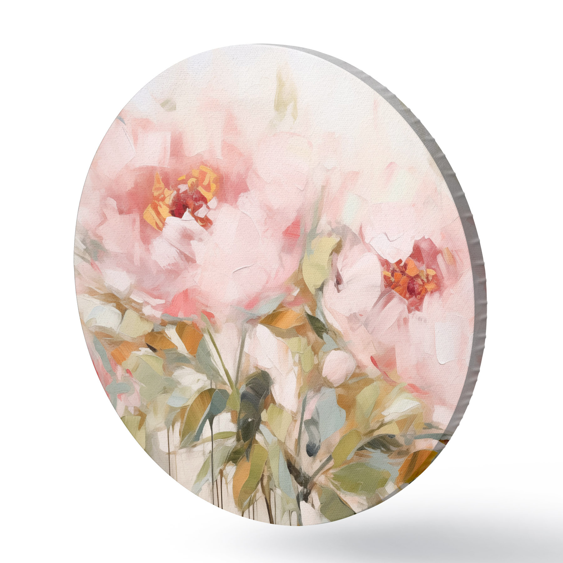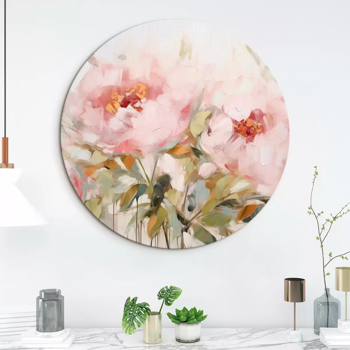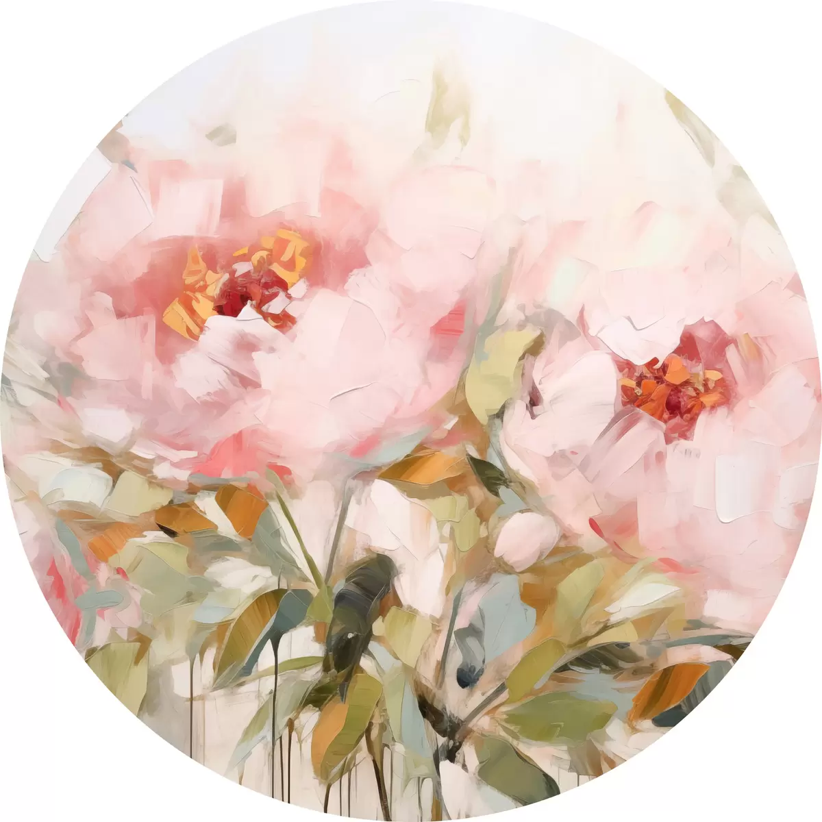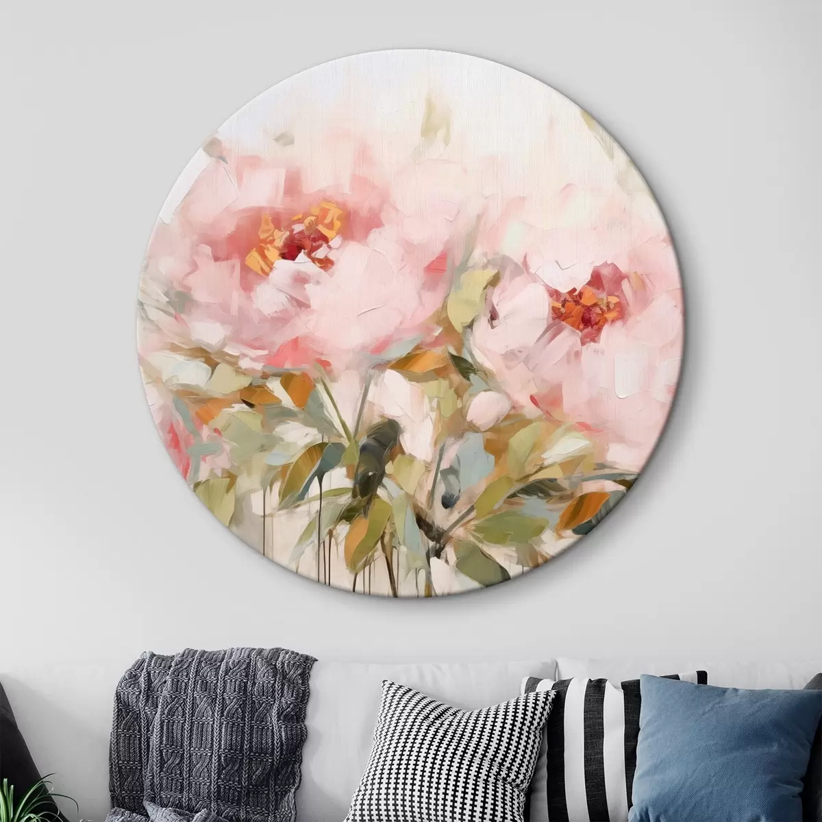 Cuadros redondos Pintura al óleo imitación de grandes peonías rosas con pétalos suaves y centros amarillos, rodeadas de hojas verdes r42720