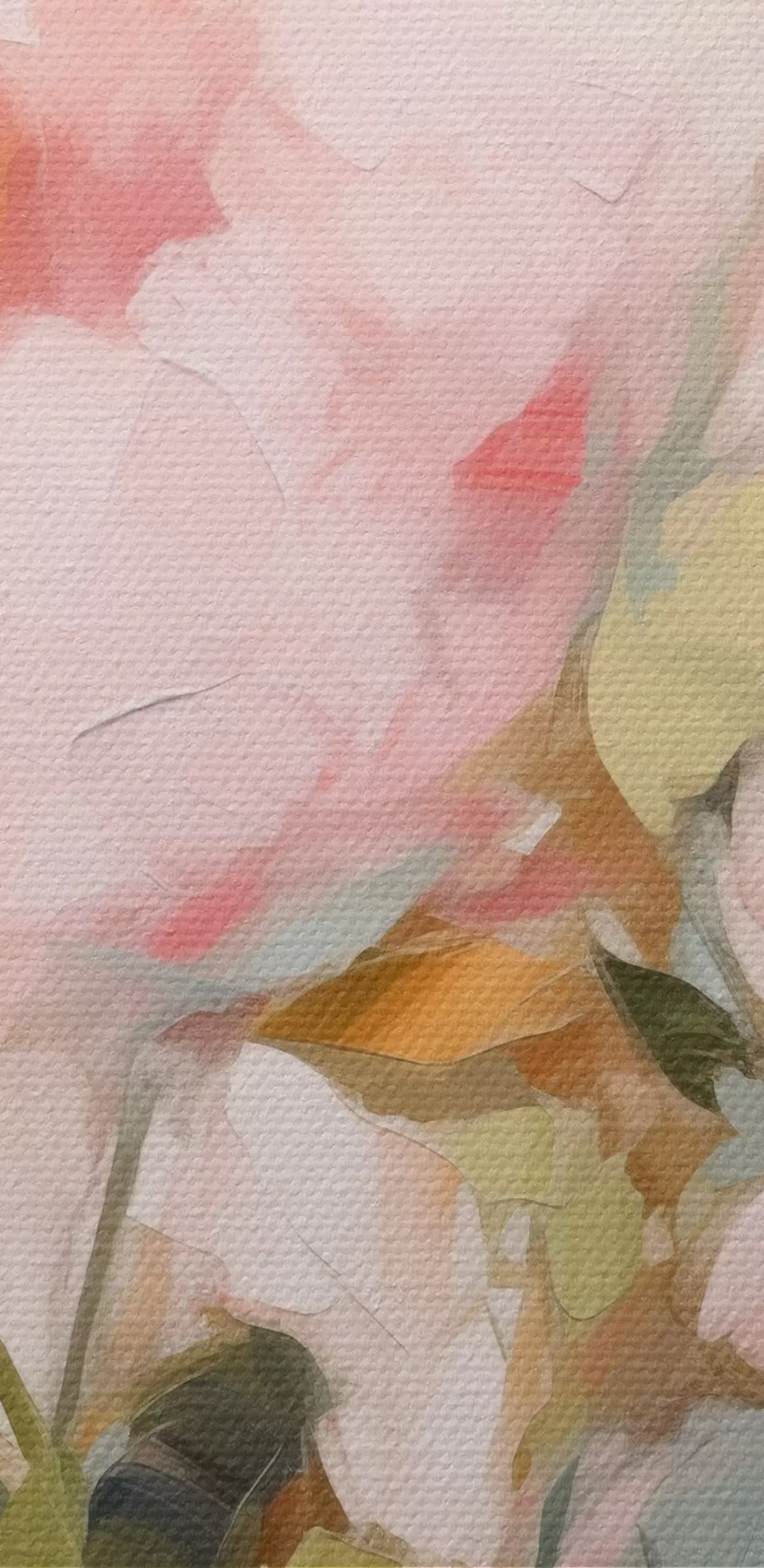 Foto Pintura al óleo imitación de grandes peonías rosas con pétalos suaves y centros amarillos, rodeadas de hojas verdes Nr r42720