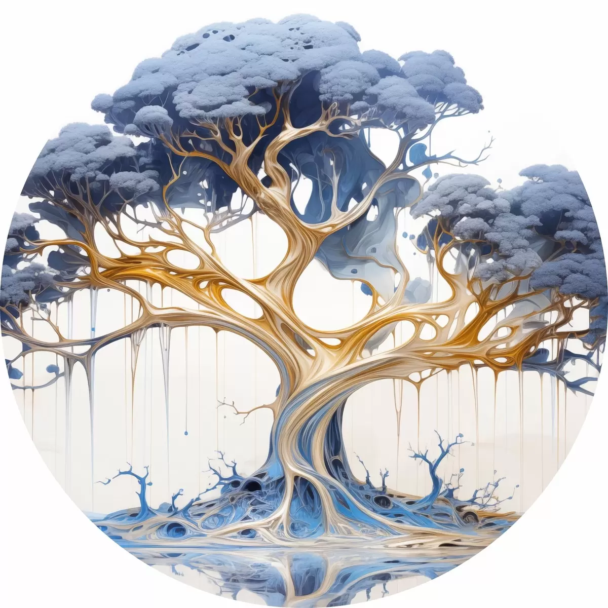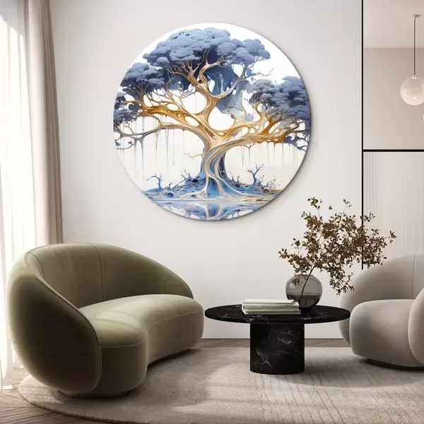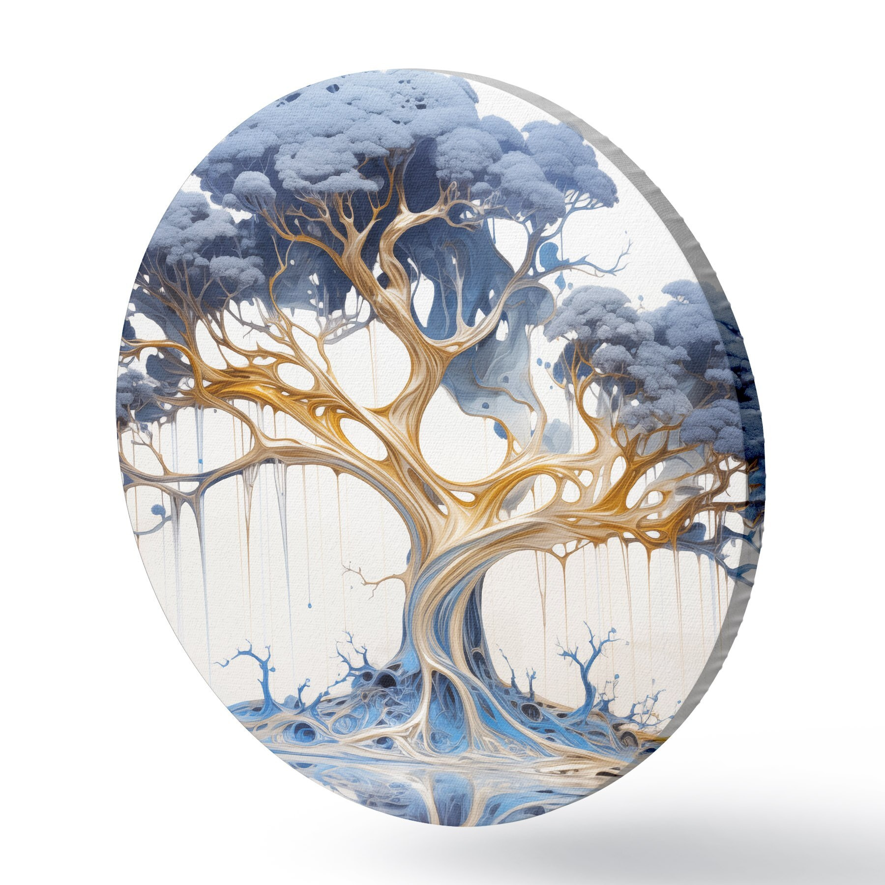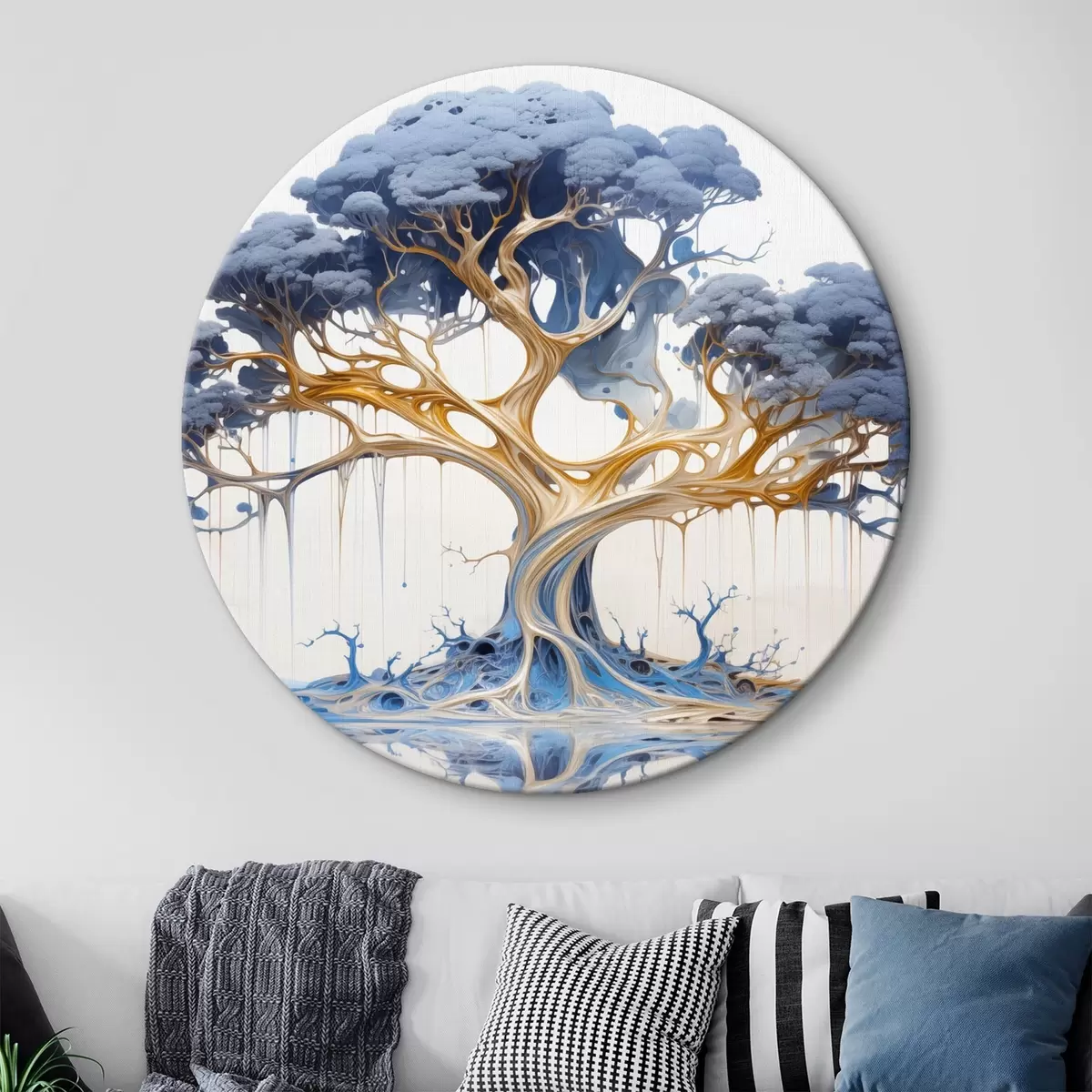 Cuadros redondos Un árbol estilizado con ramas y follaje intrincados, con una mezcla de tonos azules y amarillos r42722