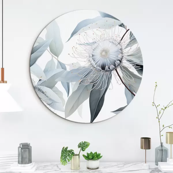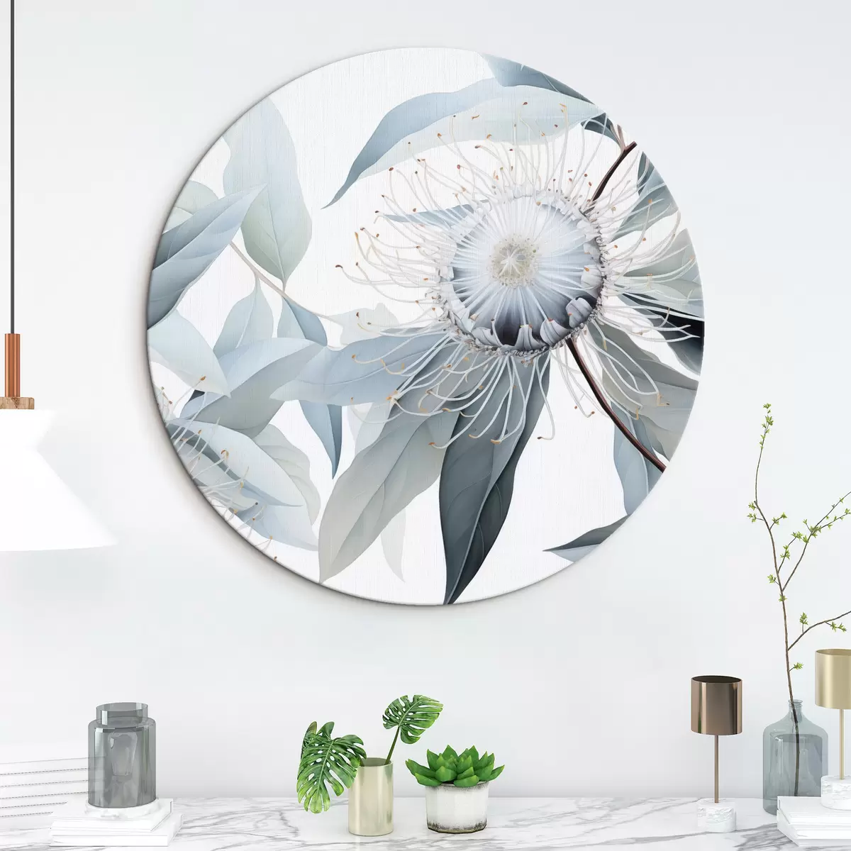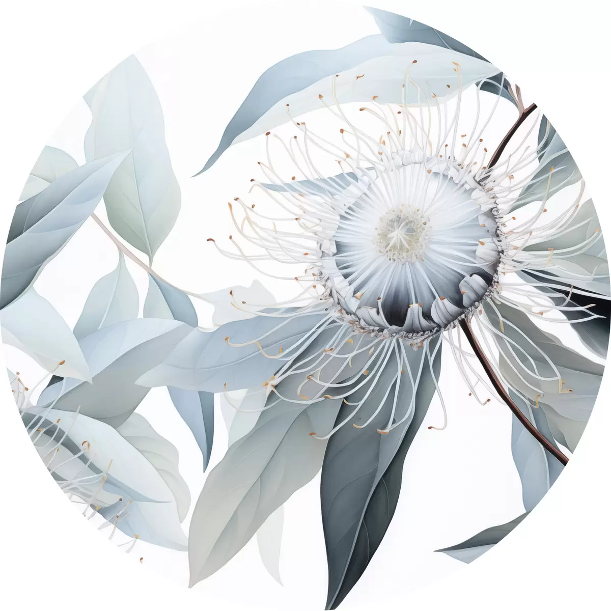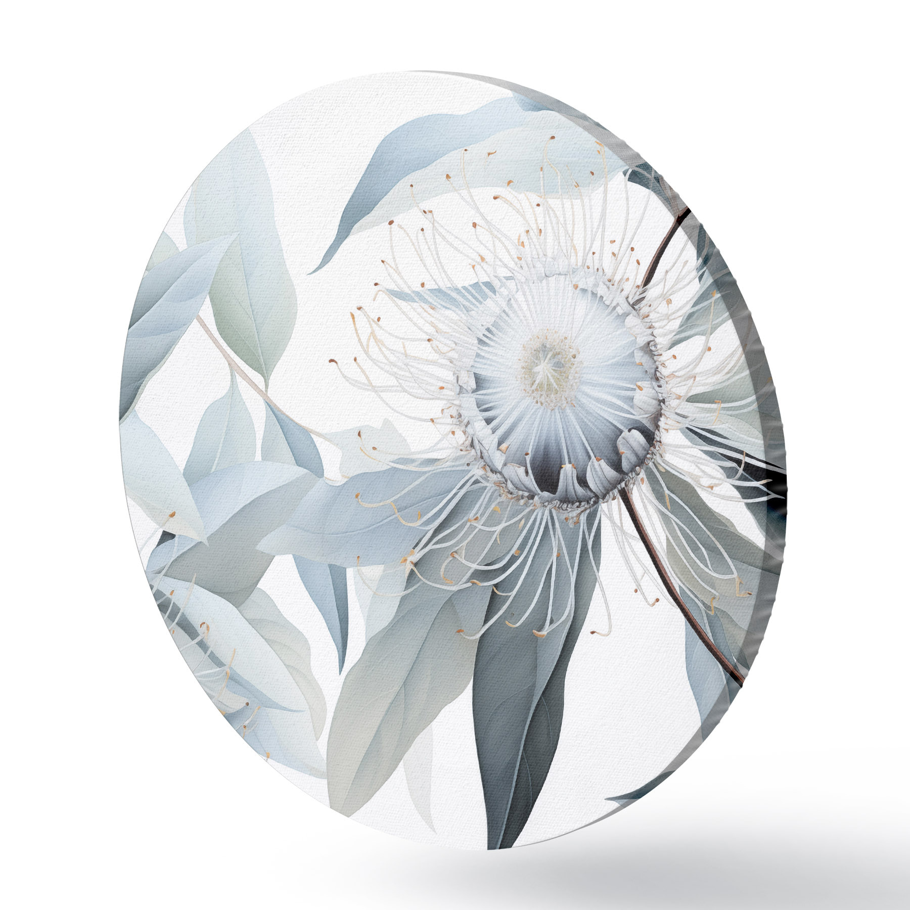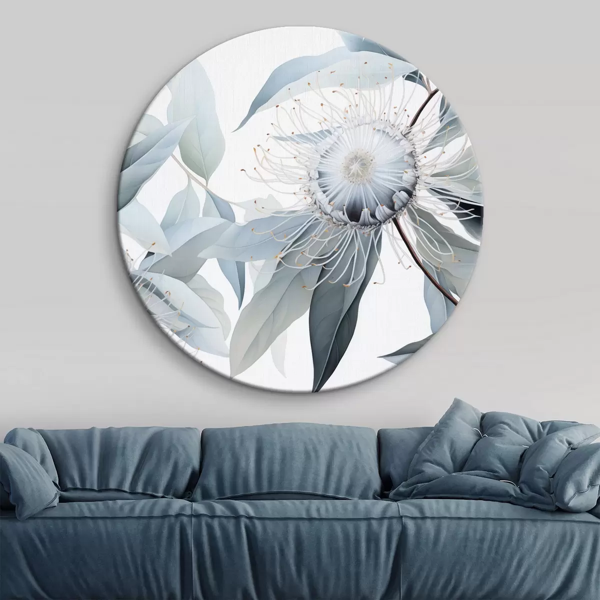 Cuadros redondos Ilustración botánica detallada de flores de eucalipto con filamentos blancos, rodeadas de suaves hojas de color verde claro r42725