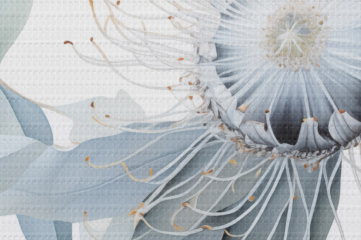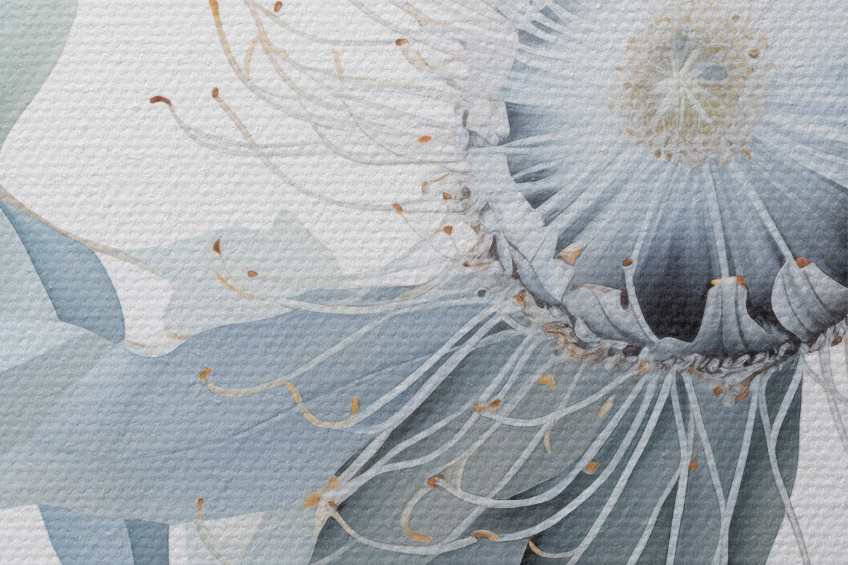 Foto Ilustración botánica detallada de flores de eucalipto con filamentos blancos, rodeadas de suaves hojas de color verde claro Nr r42725