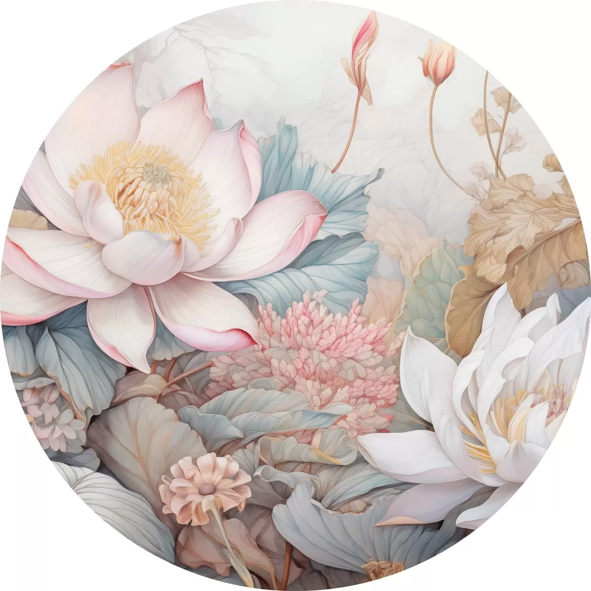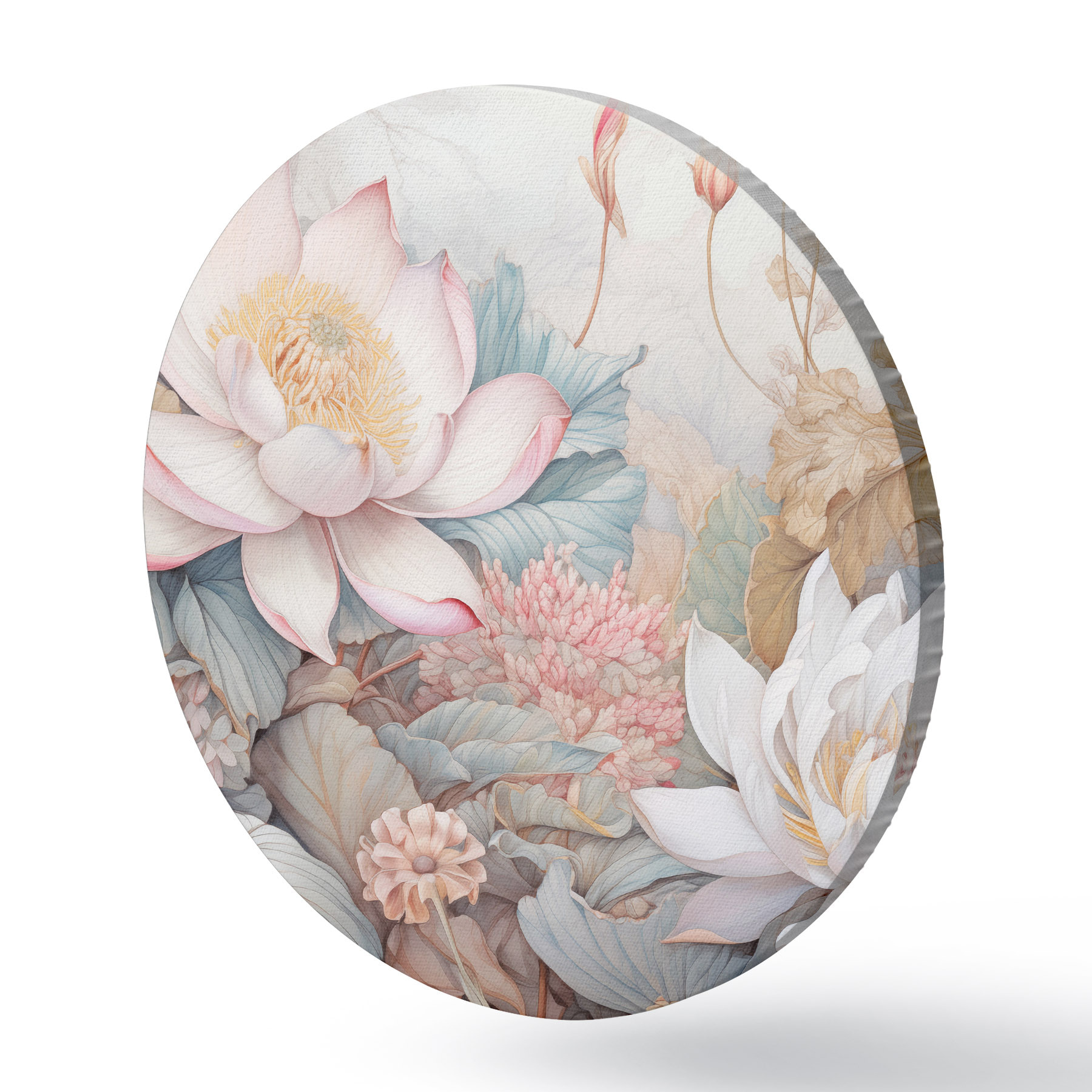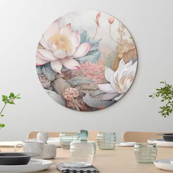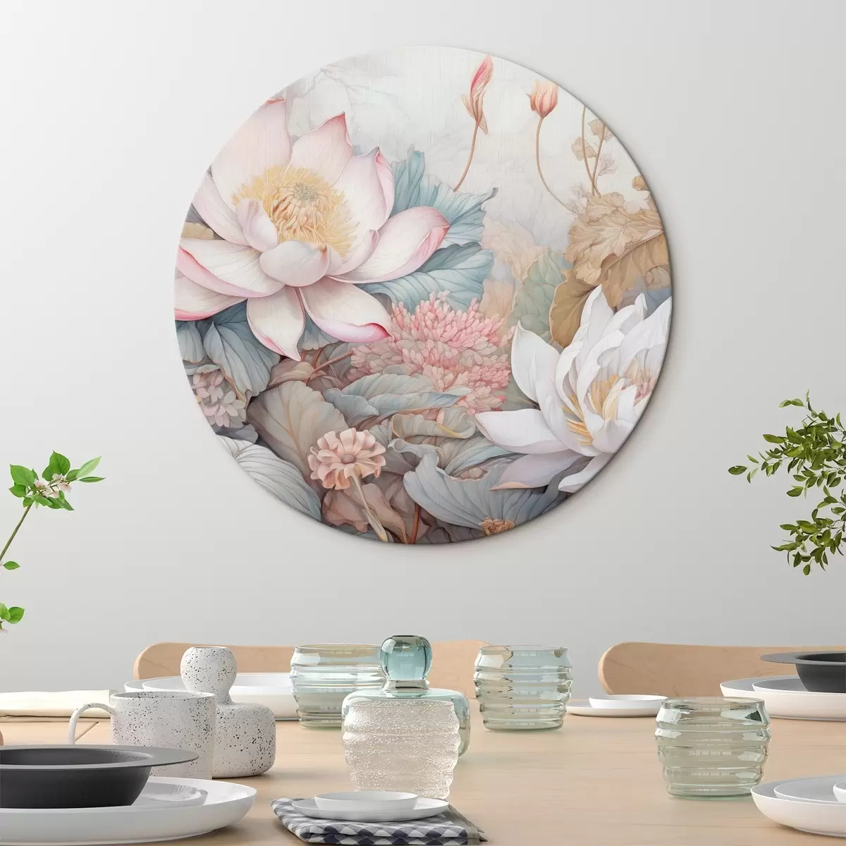 Cuadros redondos Grandes flores de loto en tonos rosas y blancos, rodeadas de hojas verdes y un delicado follaje rosa r42729