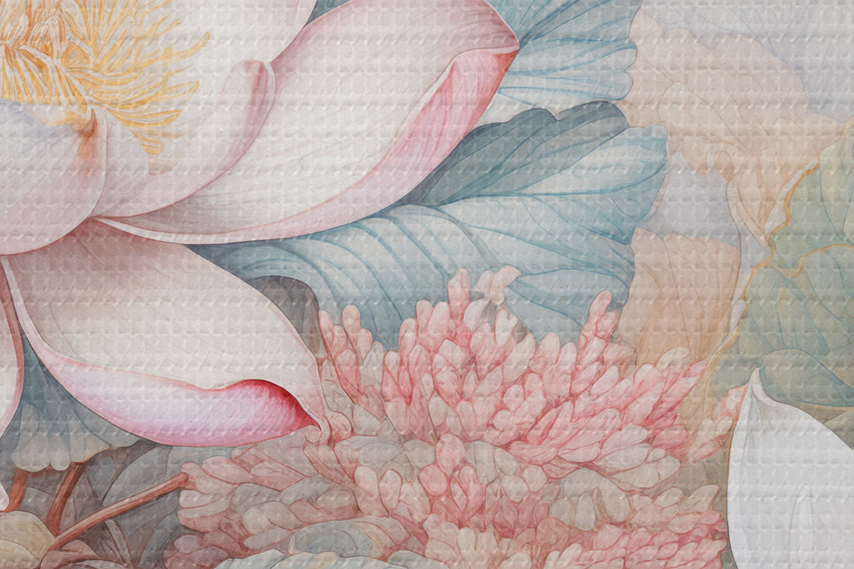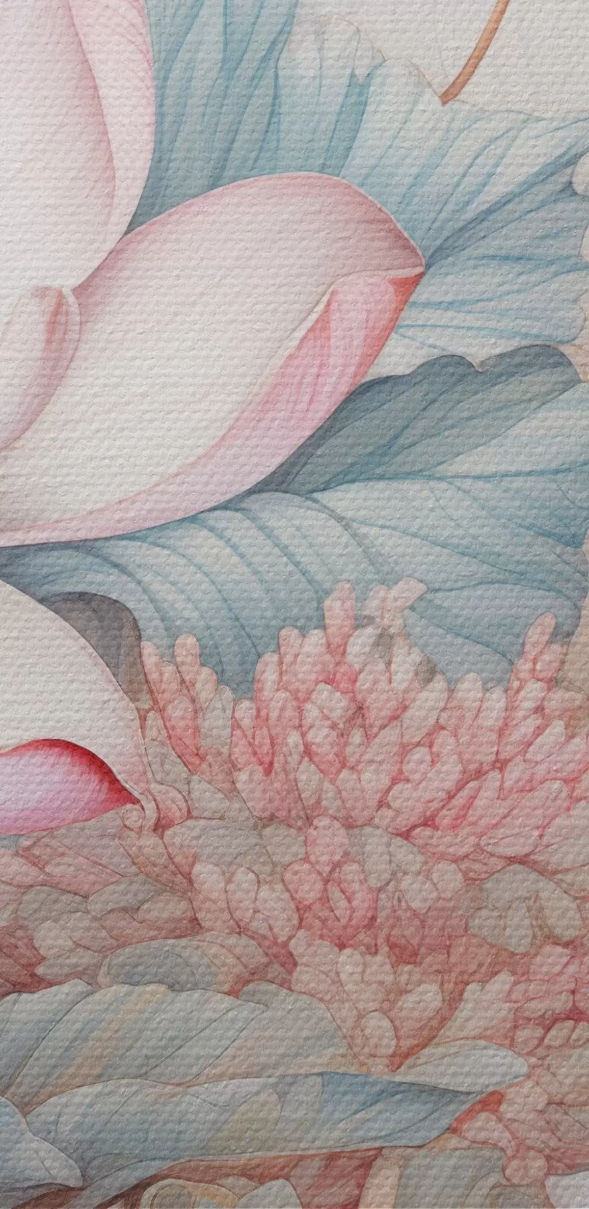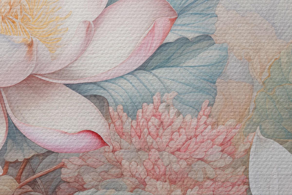 Foto Grandes flores de loto en tonos rosas y blancos, rodeadas de hojas verdes y un delicado follaje rosa Nr r42729
