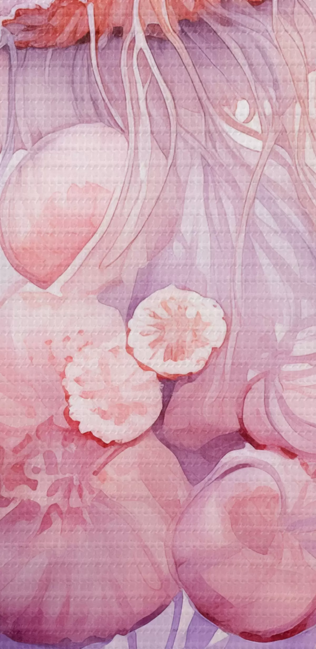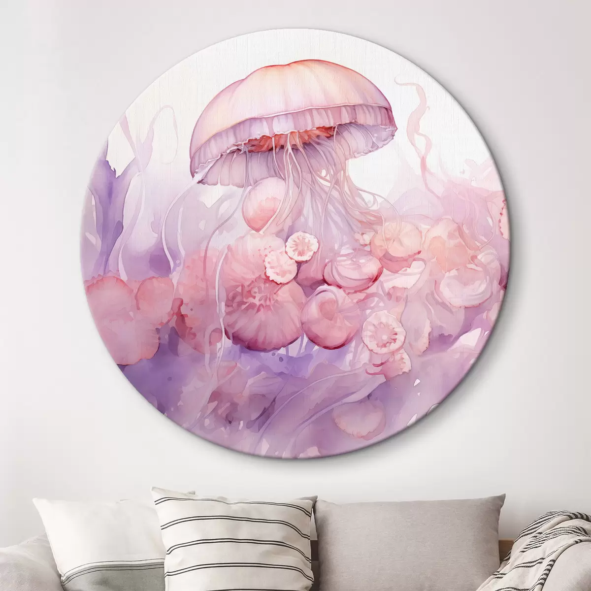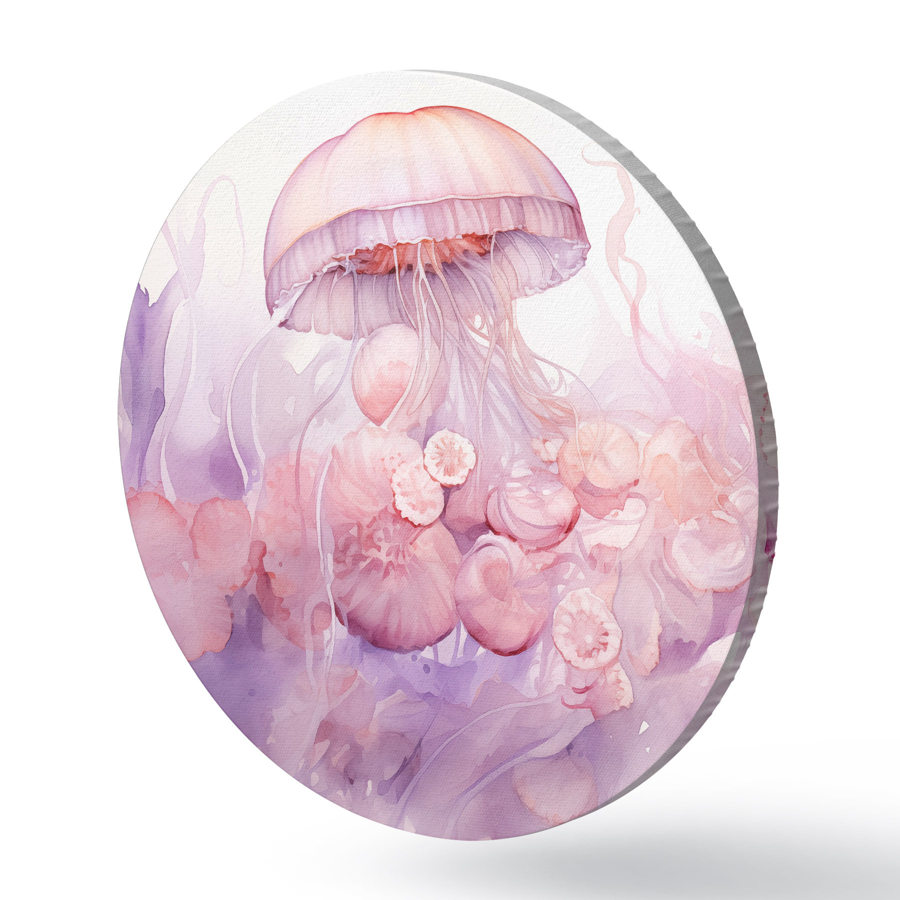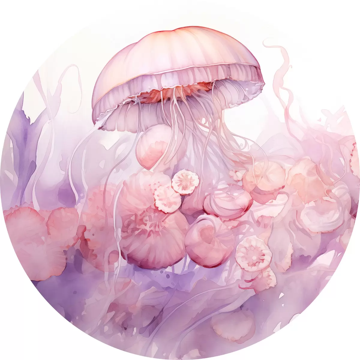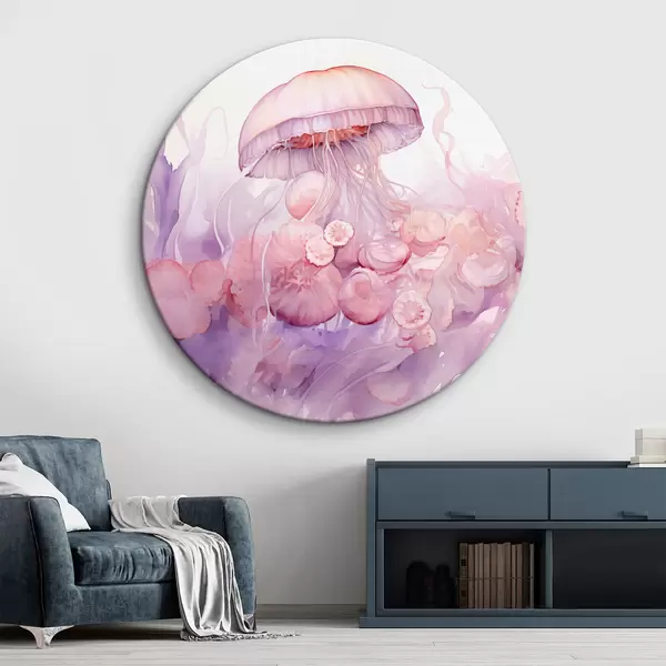 Cuadros redondos Medusas rosas flotando en medio de un remolino de suaves tonos rosas y morados, rodeadas de formas abstractas r42730