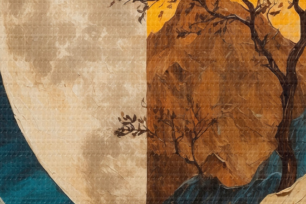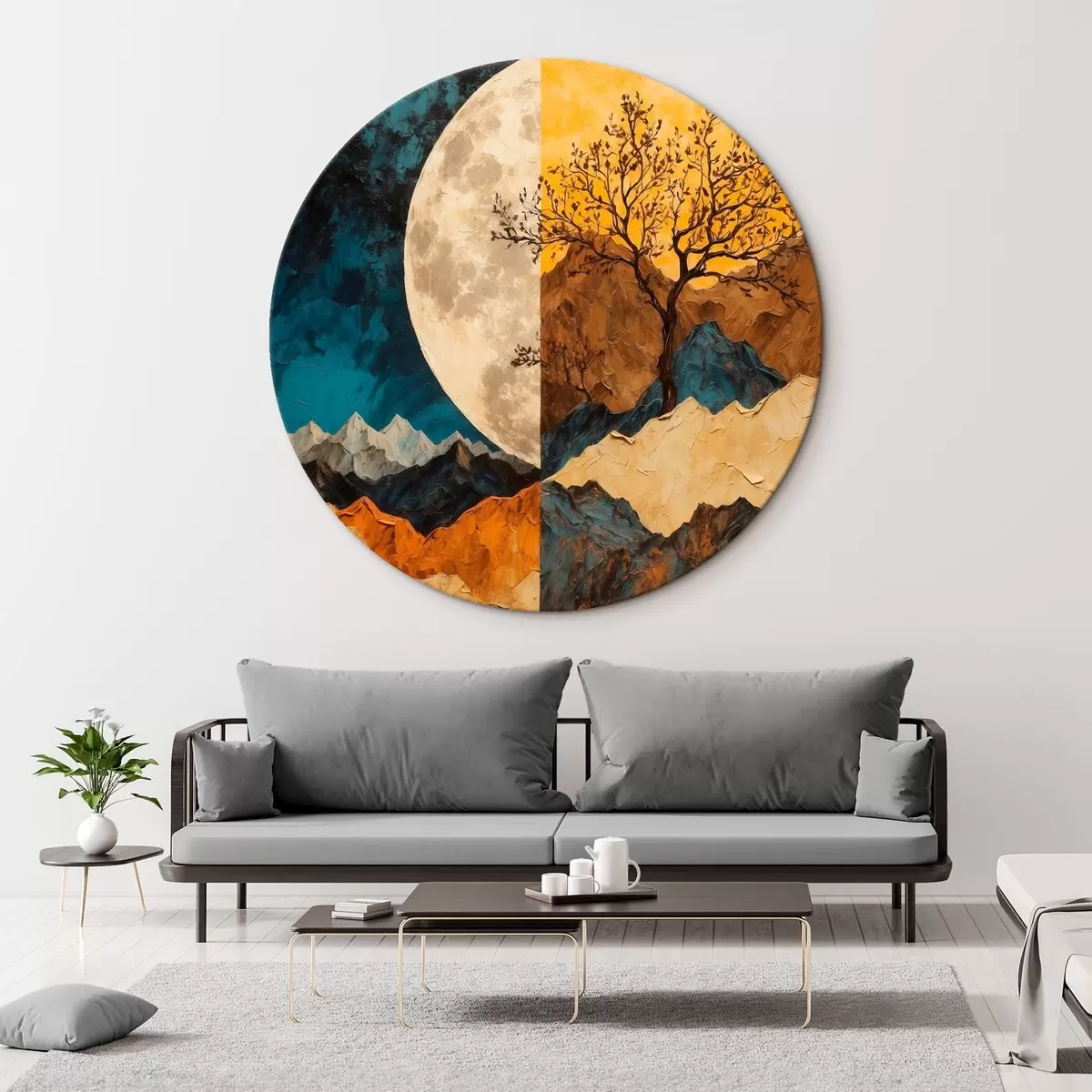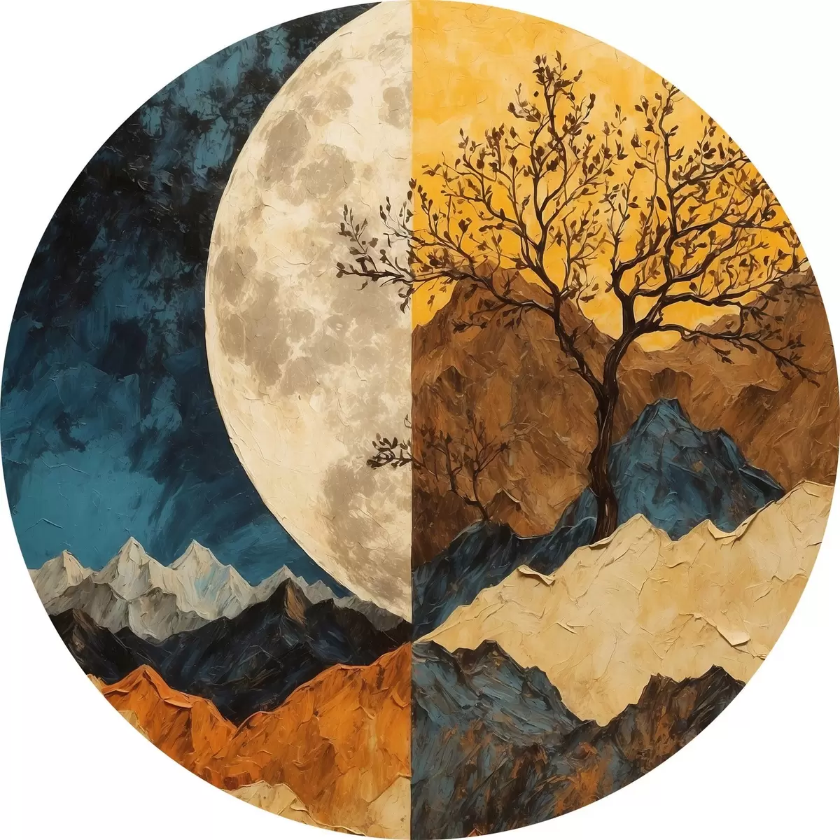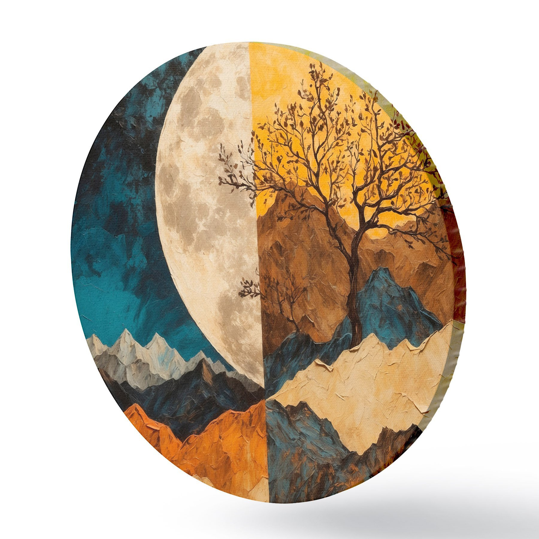Cuadros redondos Montaña multicolor sobre fondo lunar en pintura acrílica rtyle r42770