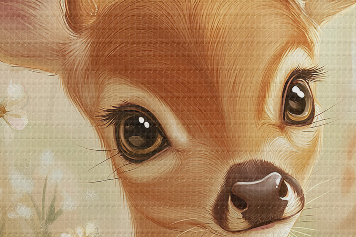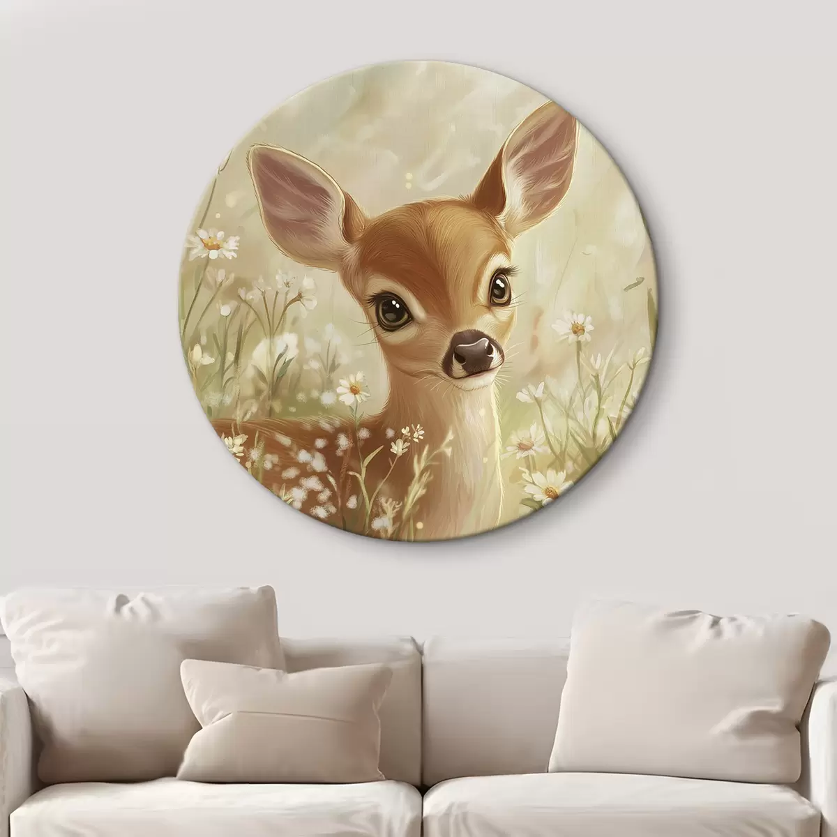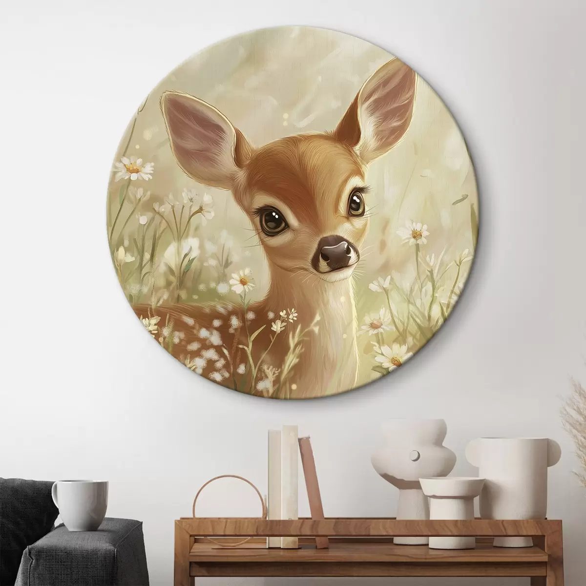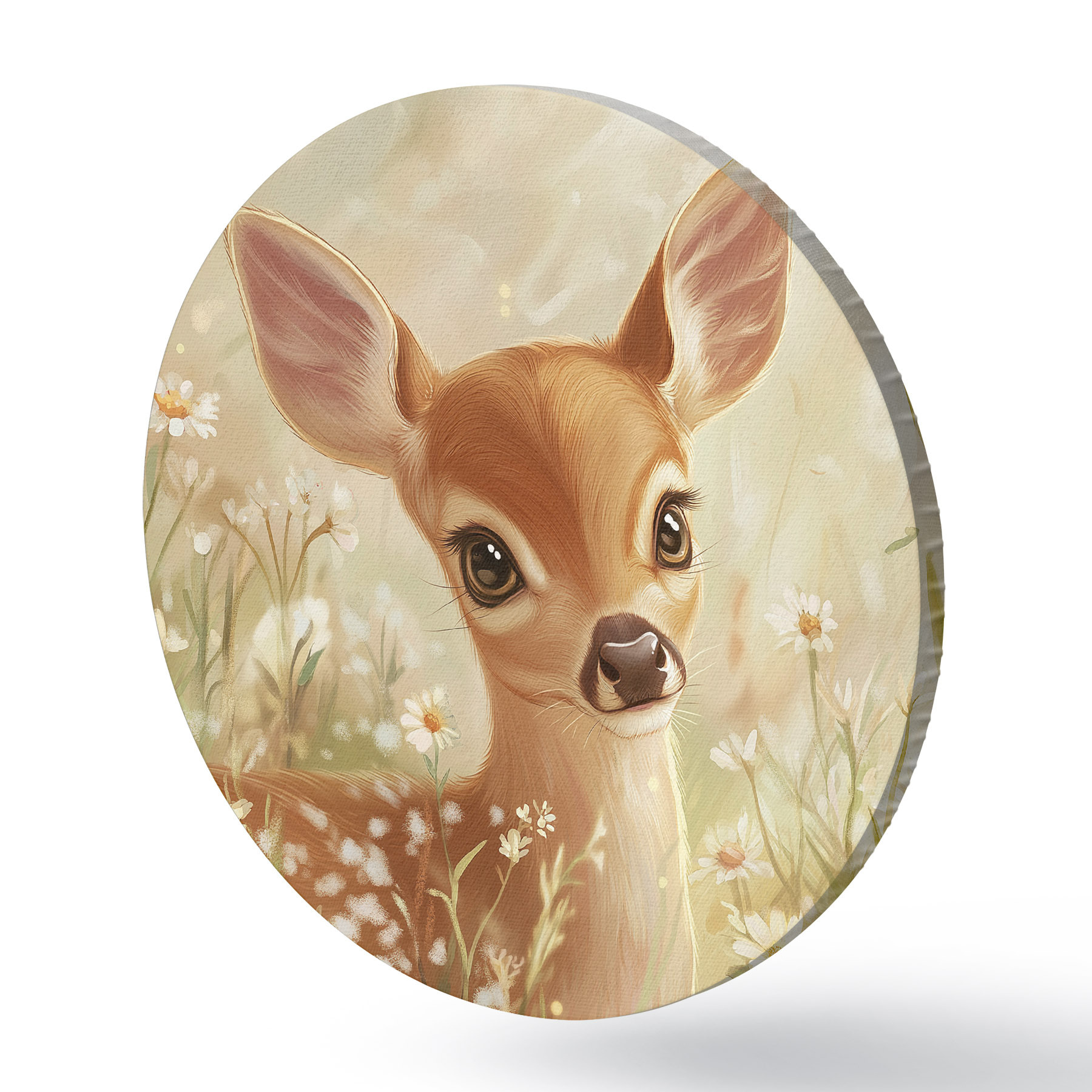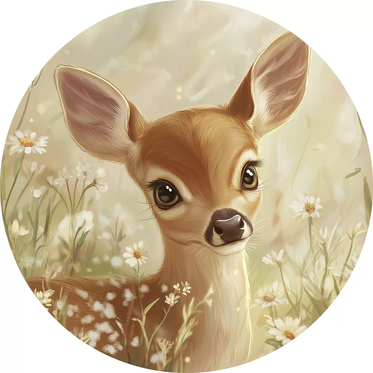 Cuadros redondos Lindo ciervo en el prado con flores de margarita, dibujo al óleo r42780