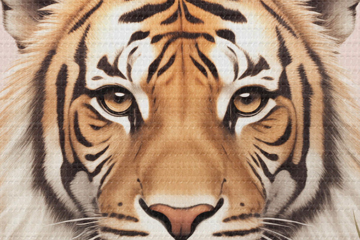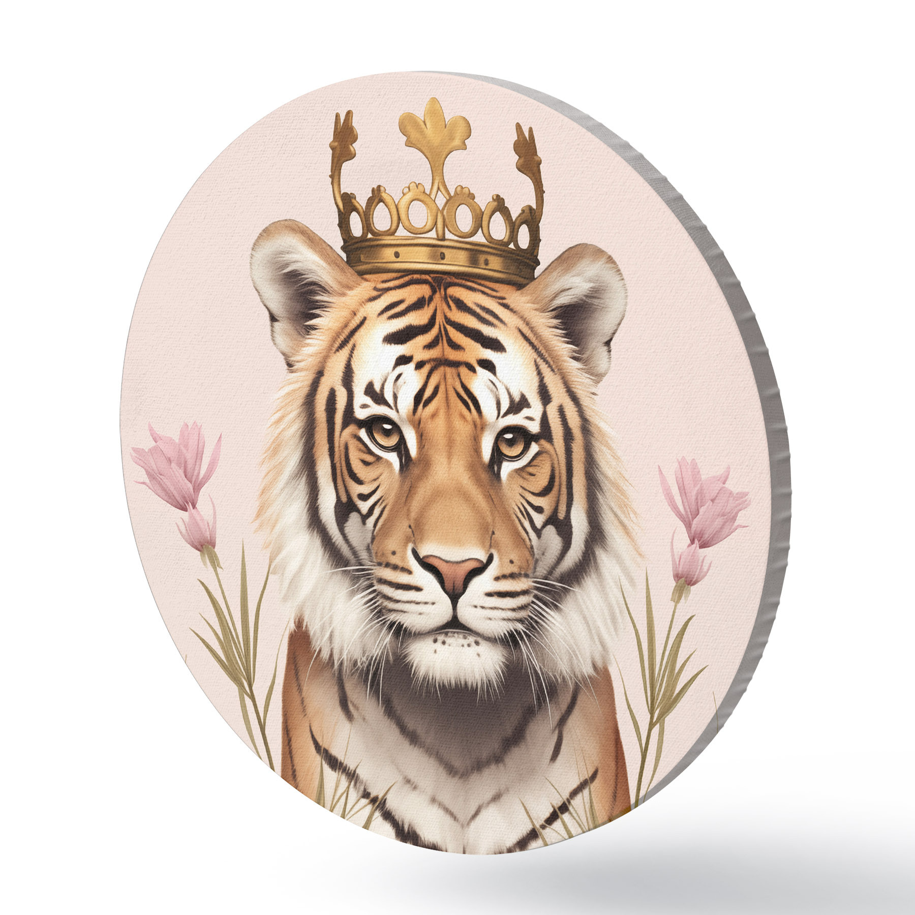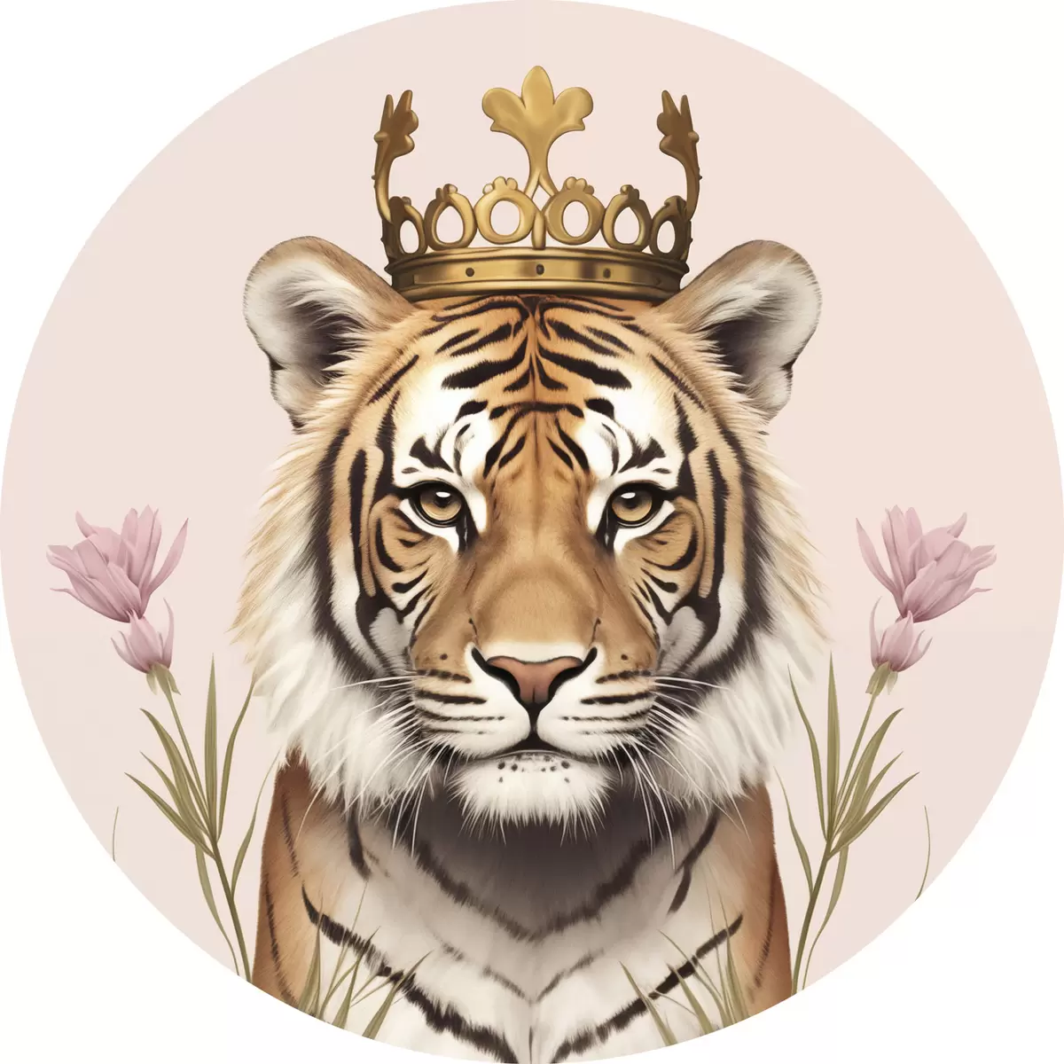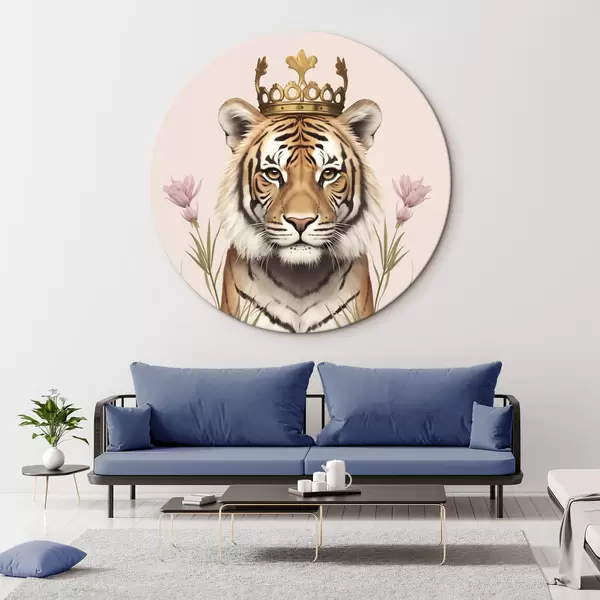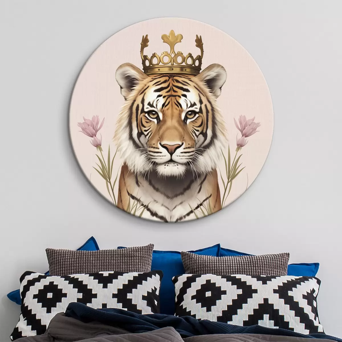 Cuadros redondos Tigre con la corona de oro, fondo rosa, flores de tulipán r42782