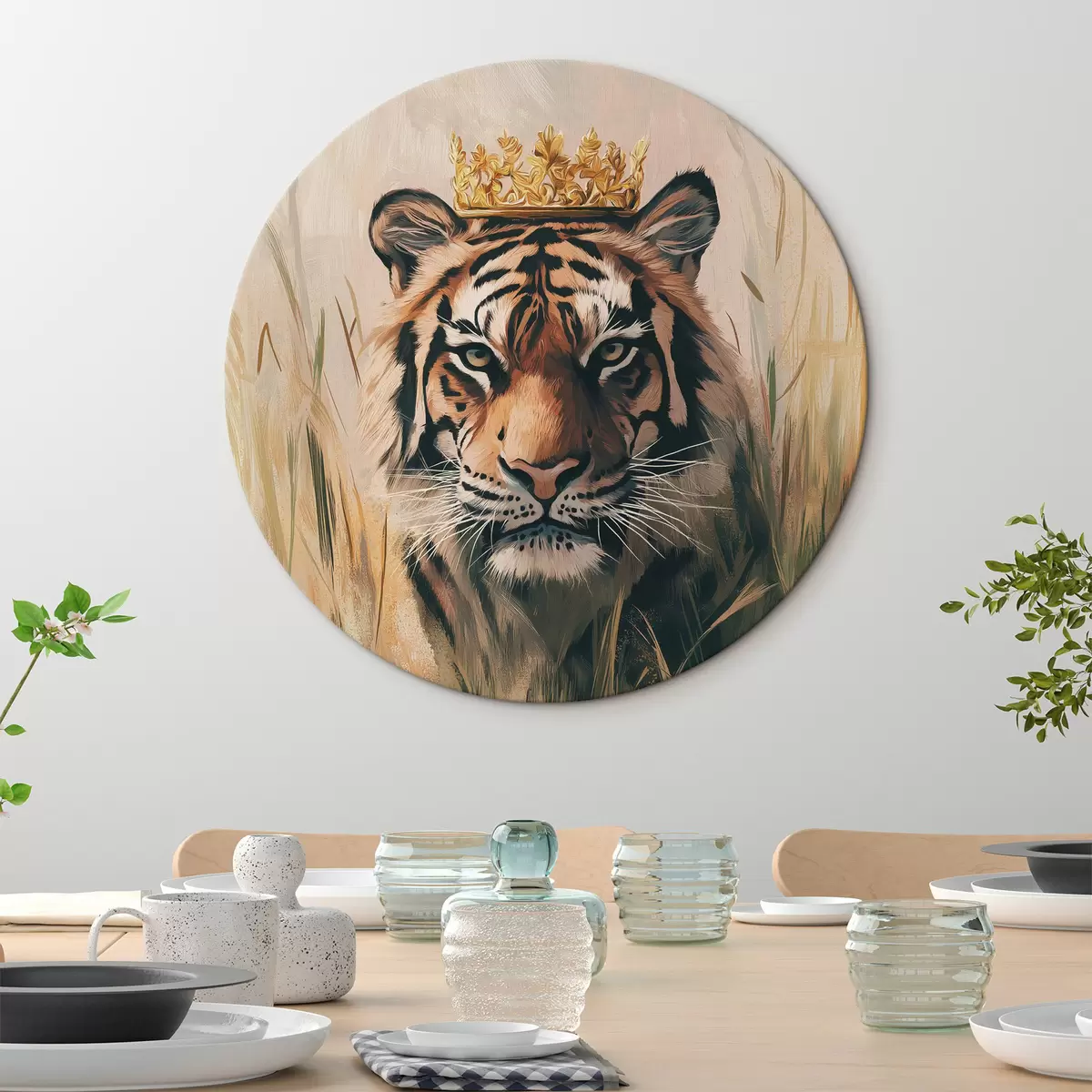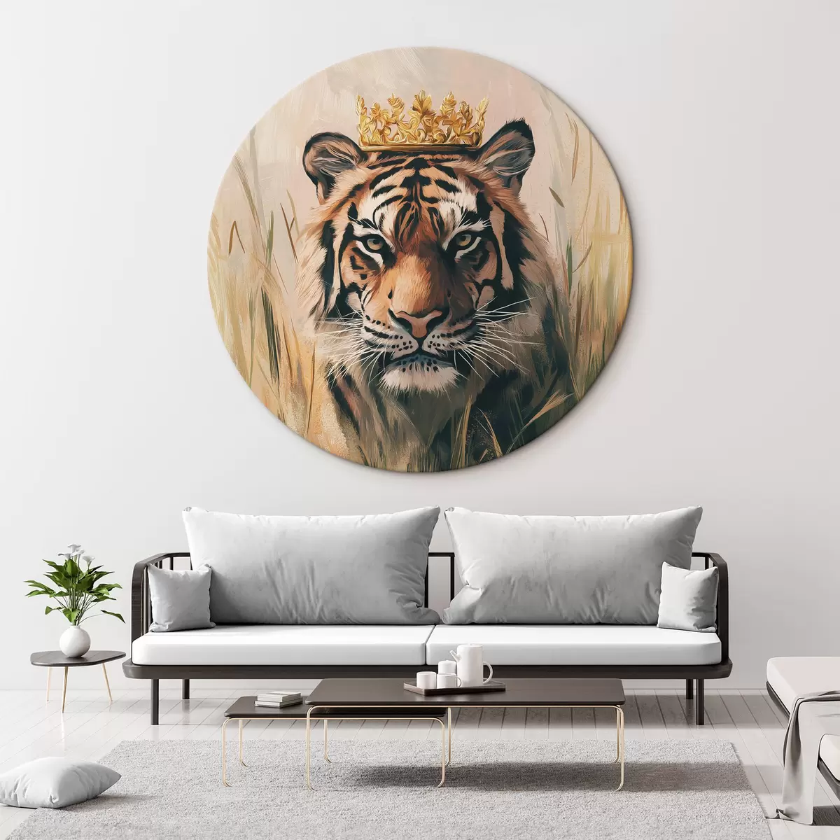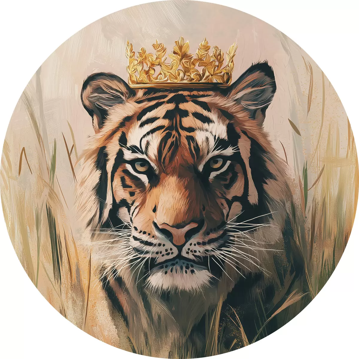 Cuadros redondos Tigre en el prado con hierba, corona dorada, dibujo estilo acrílico r42783