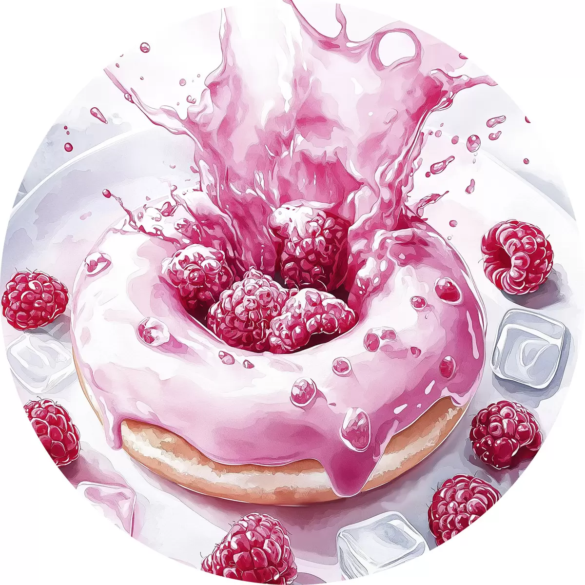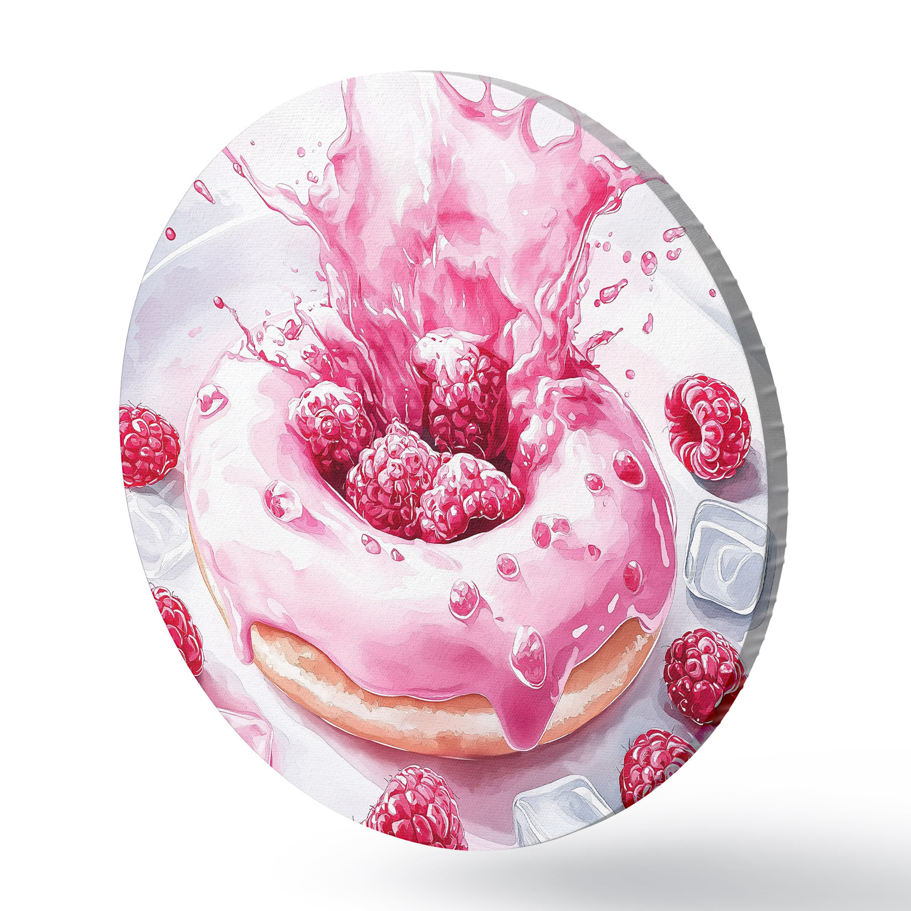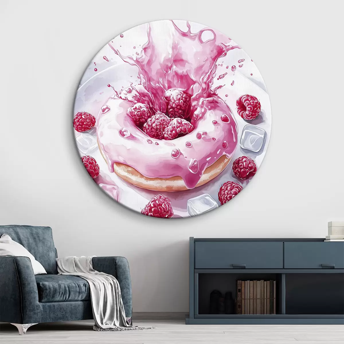 Cuadros redondos Delicioso donut en el plato, nata espumosa, frambuesas, hielo r42788