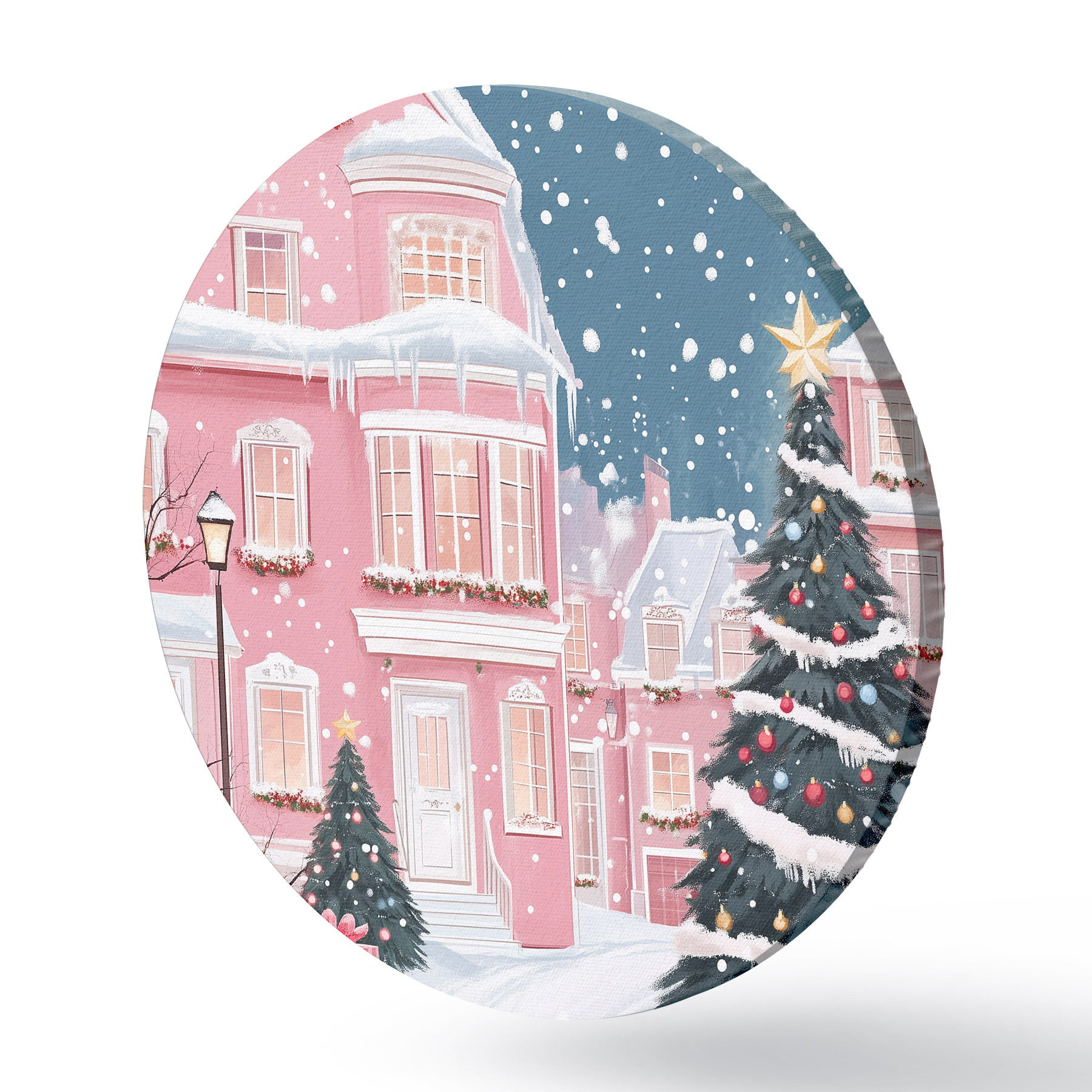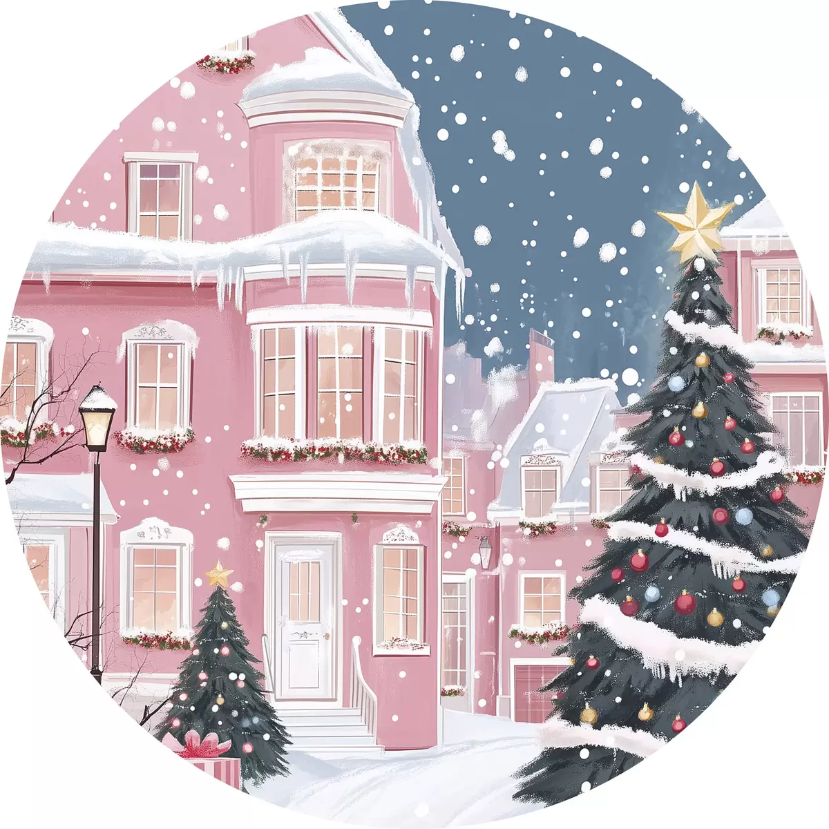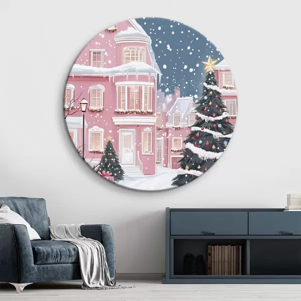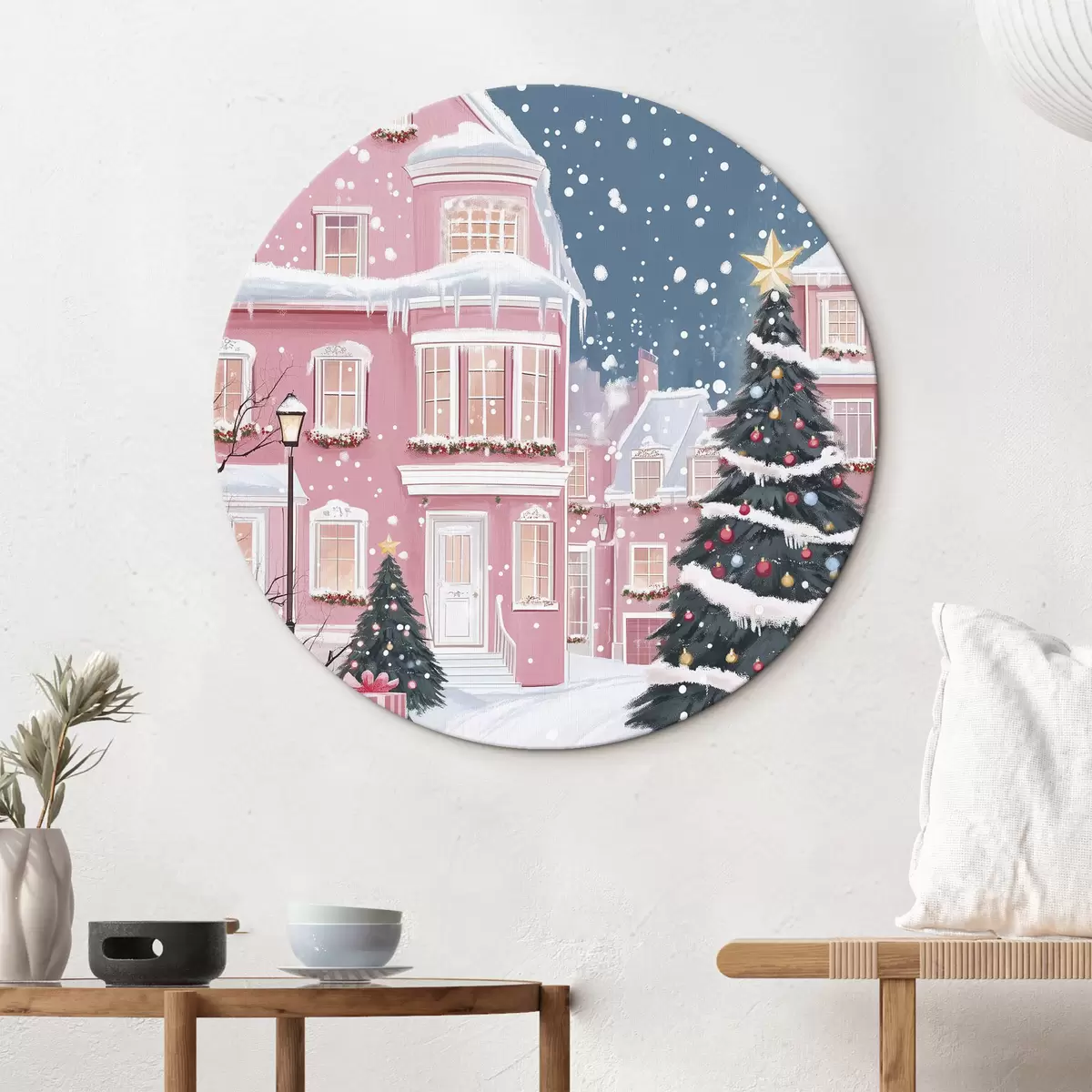 Cuadros redondos Ciudad invernal con casas rosas, árboles de navidad y copos de nieve r42792
