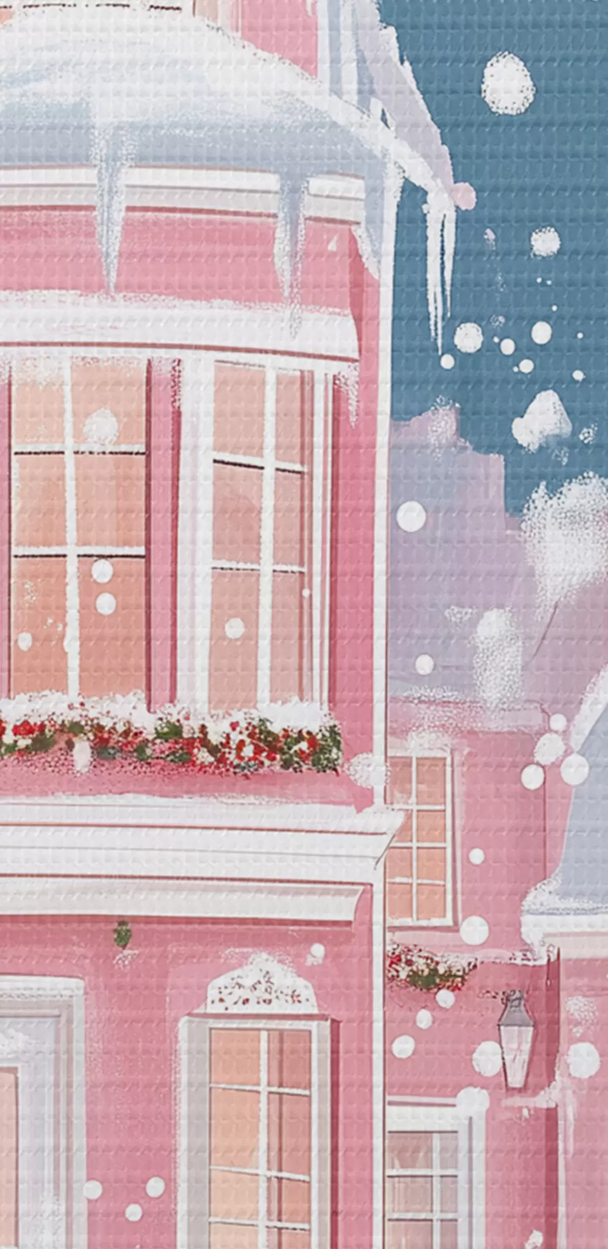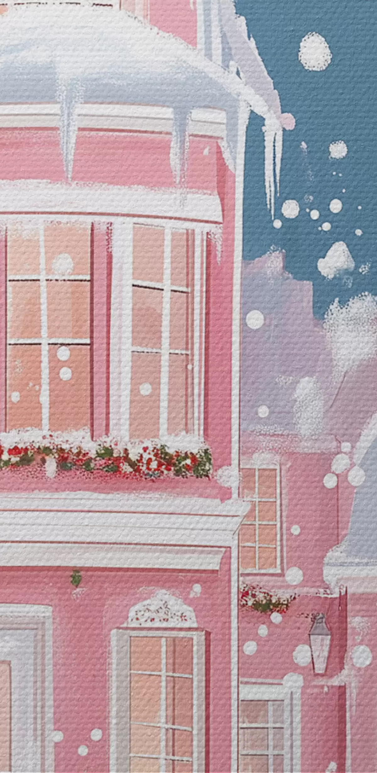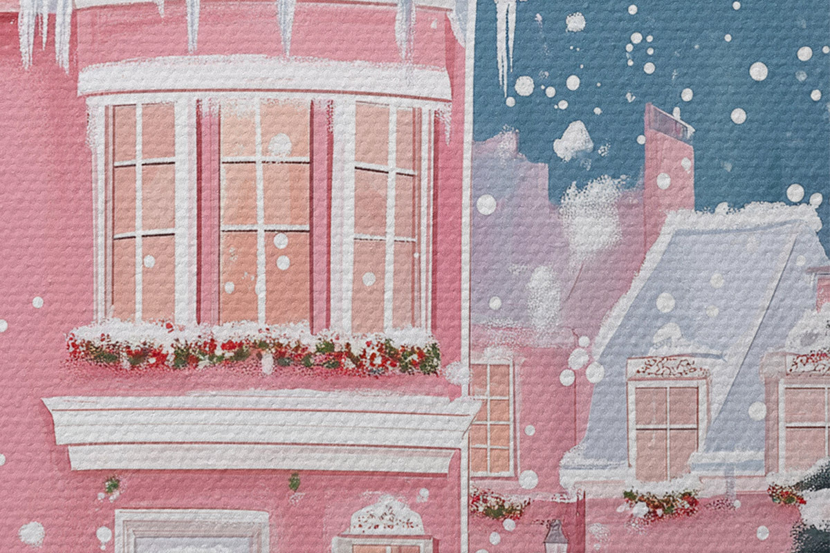 Foto Ciudad invernal con casas rosas, árboles de navidad y copos de nieve Nr r42792