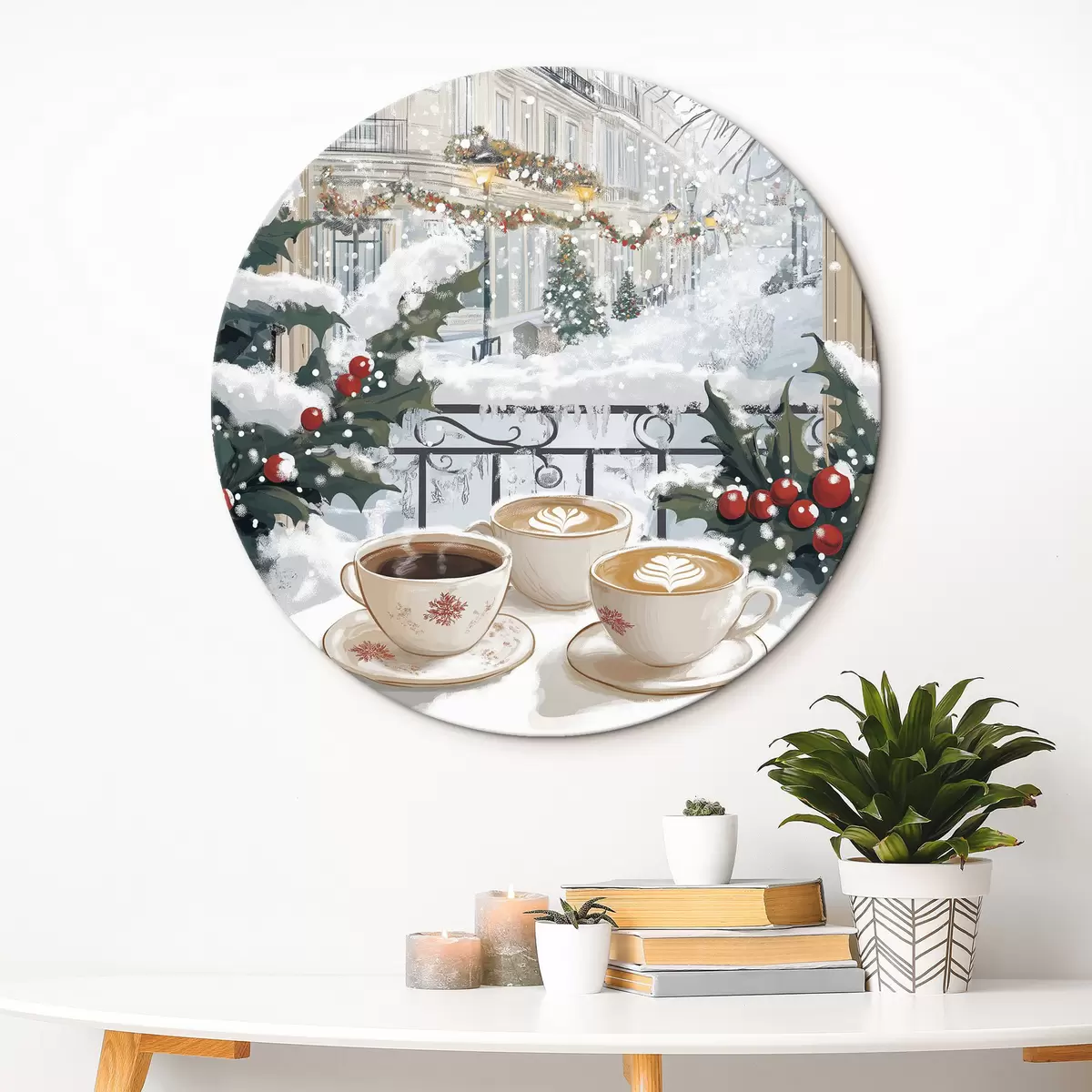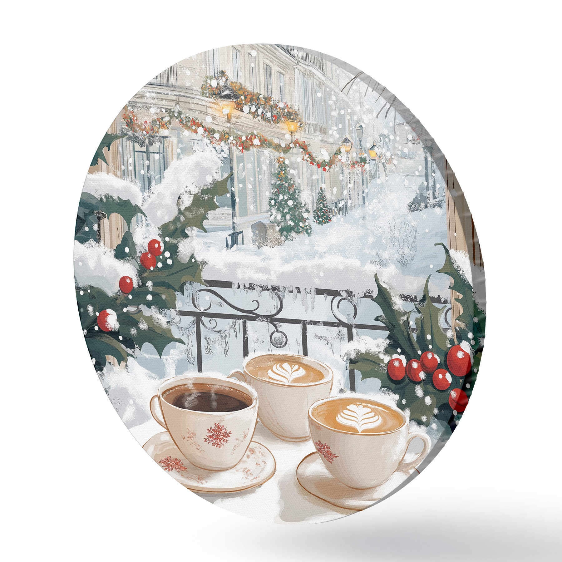 Cuadros redondos Estética invernal, tazas de café, restaurante, calle de la ciudad r42794