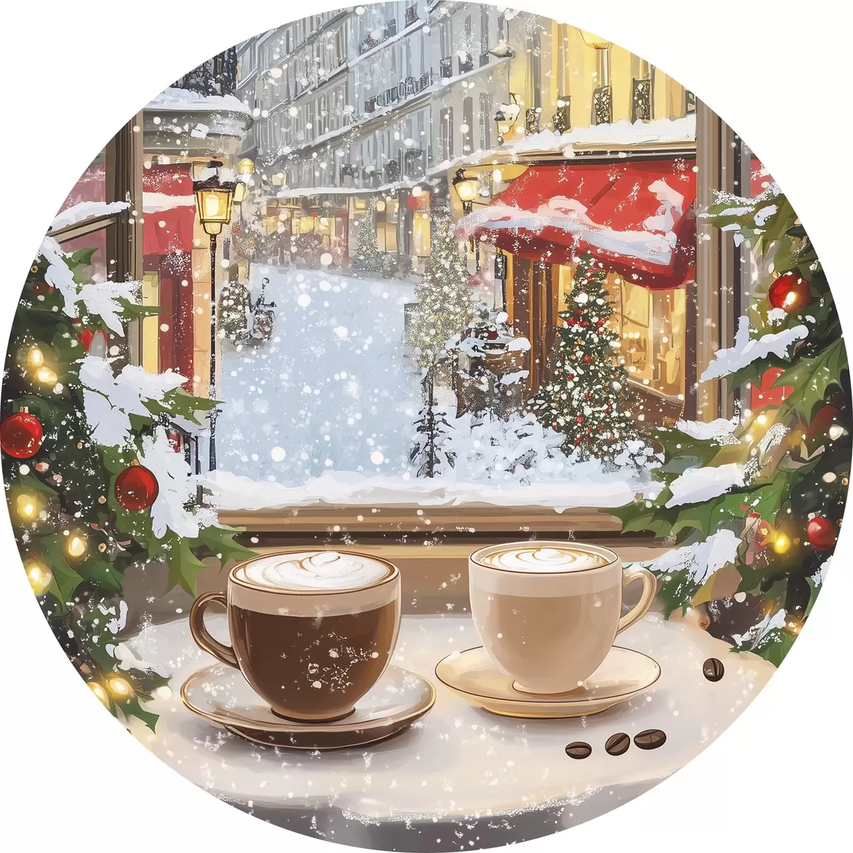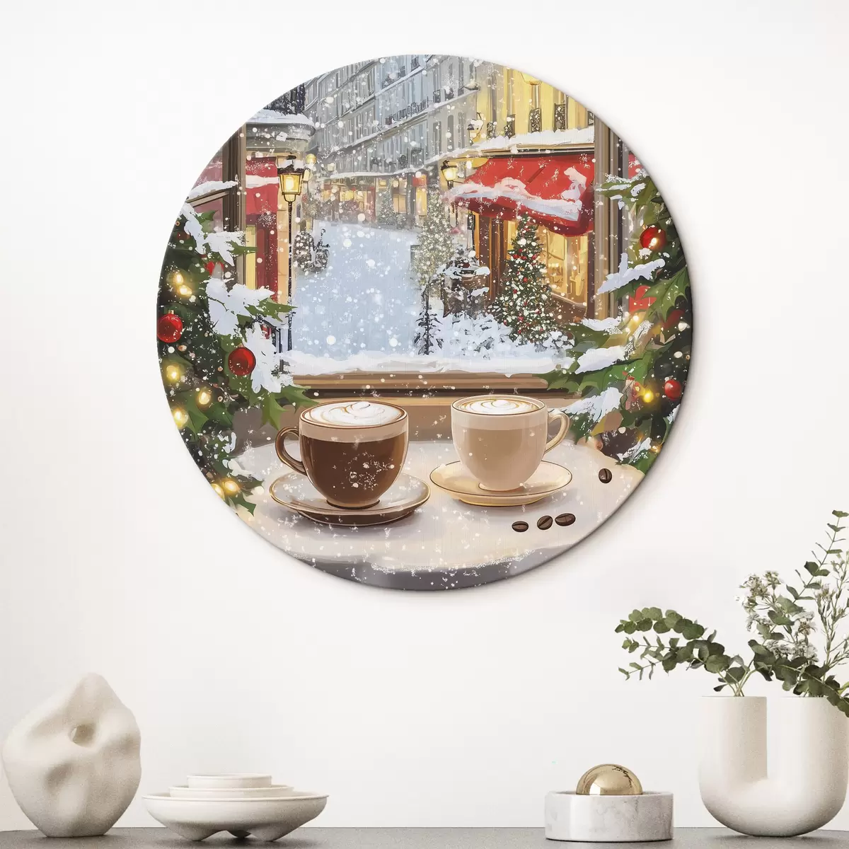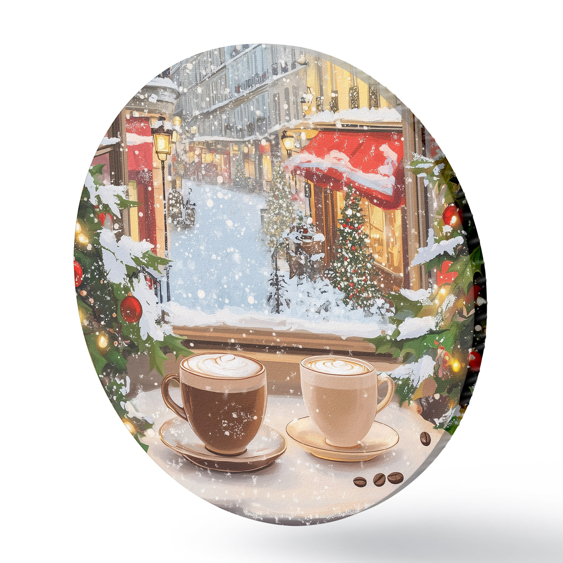 Cuadros redondos Acogedora cafetería de invierno, tazas de café, estilo acrílico, arquitectura antigua de la ciudad r42795