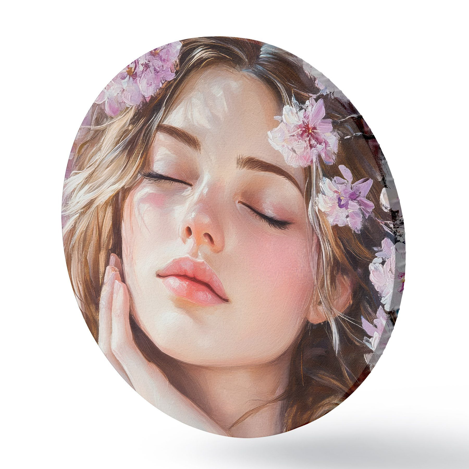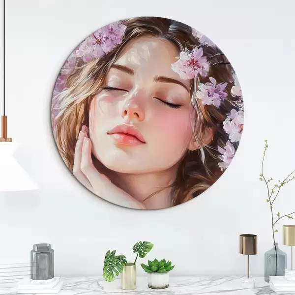 Cuadros redondos Niña cerca de una rama en flor r42857