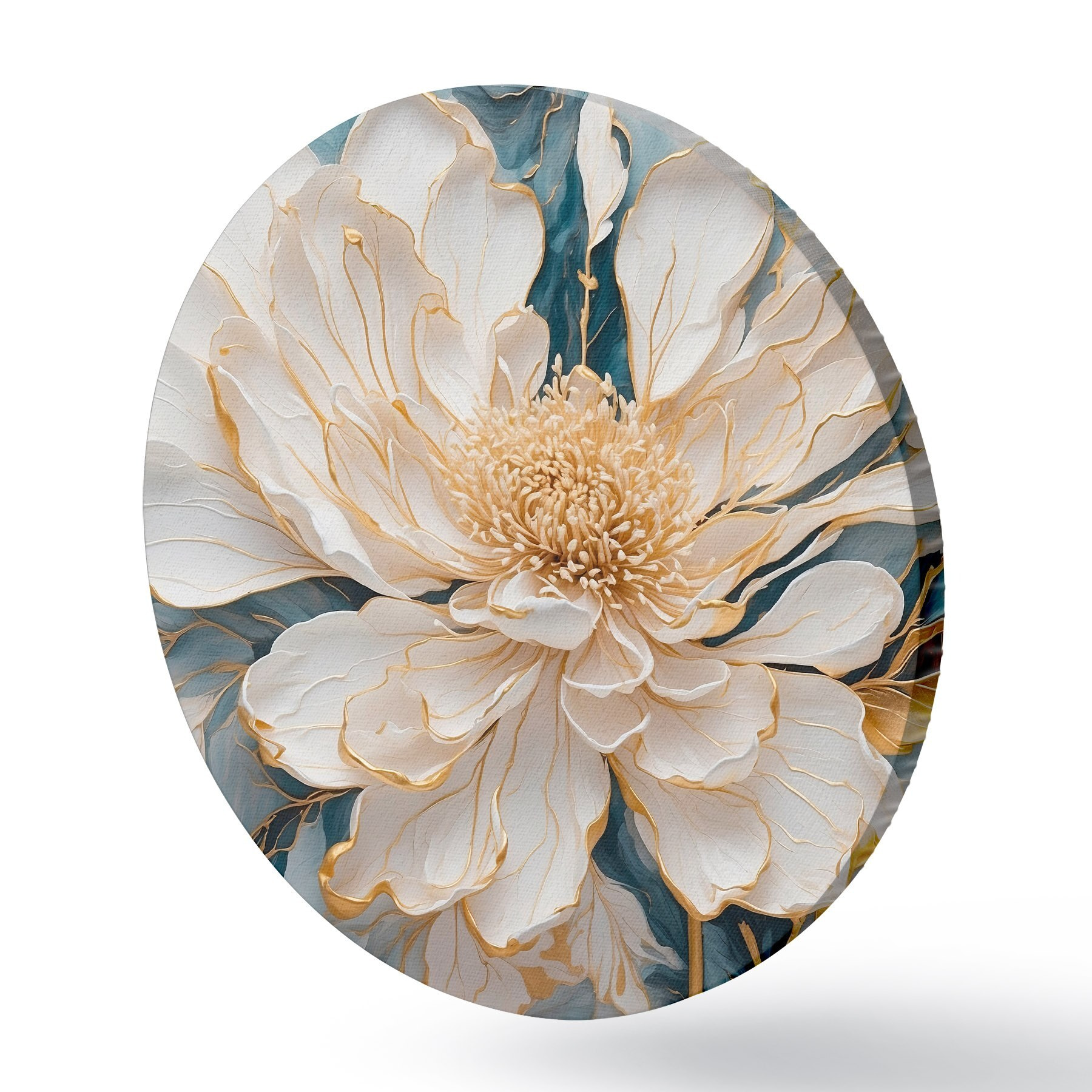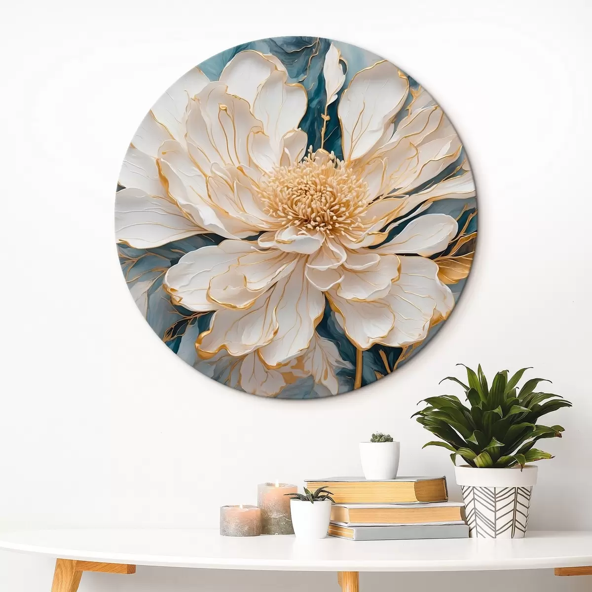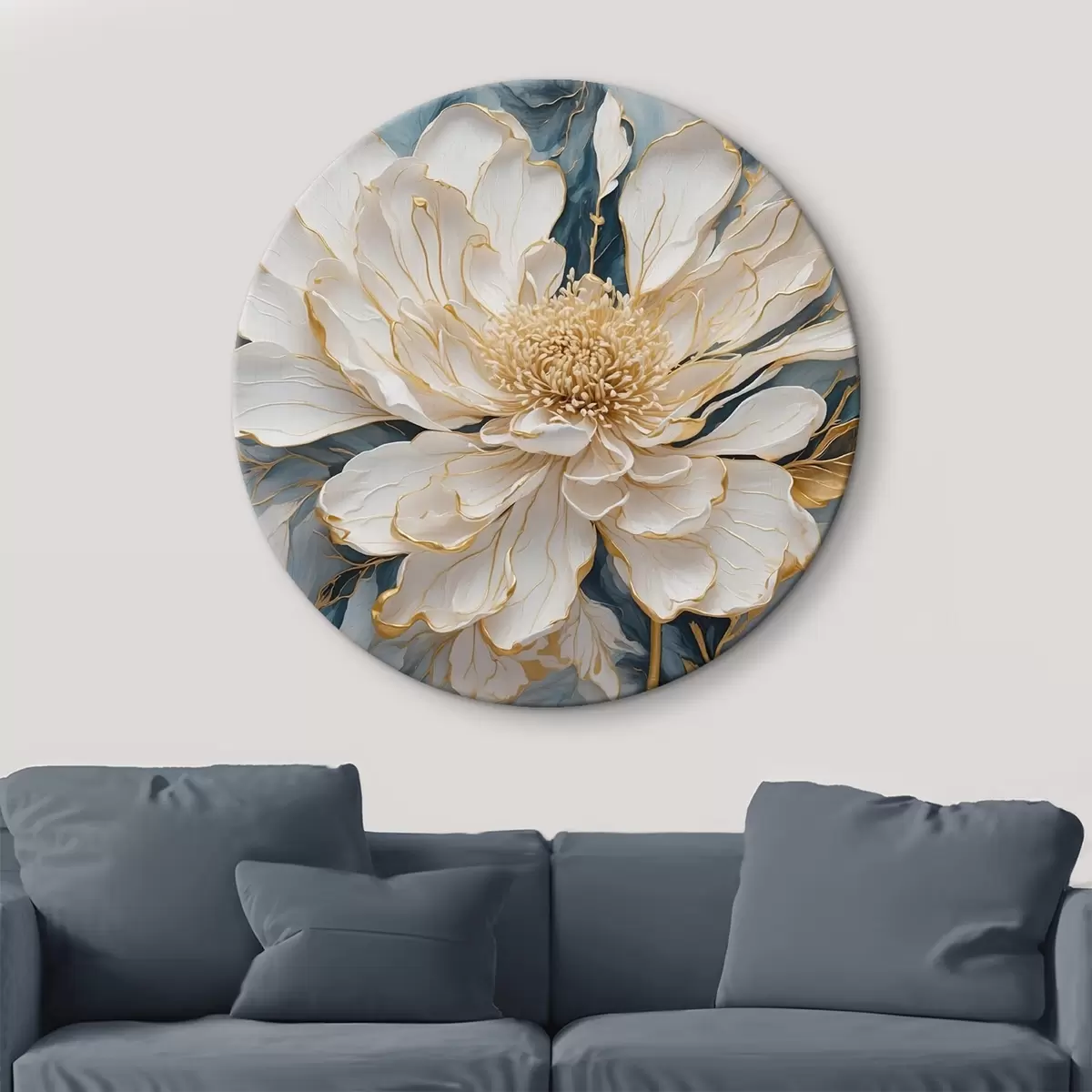 Cuadros redondos Flor blanca con contorno dorado sobre fondo blanco azulado r42923