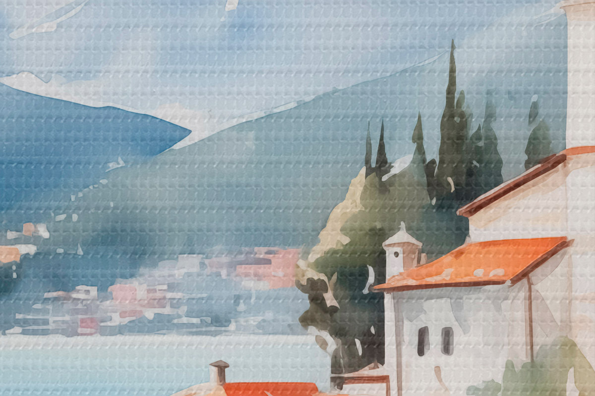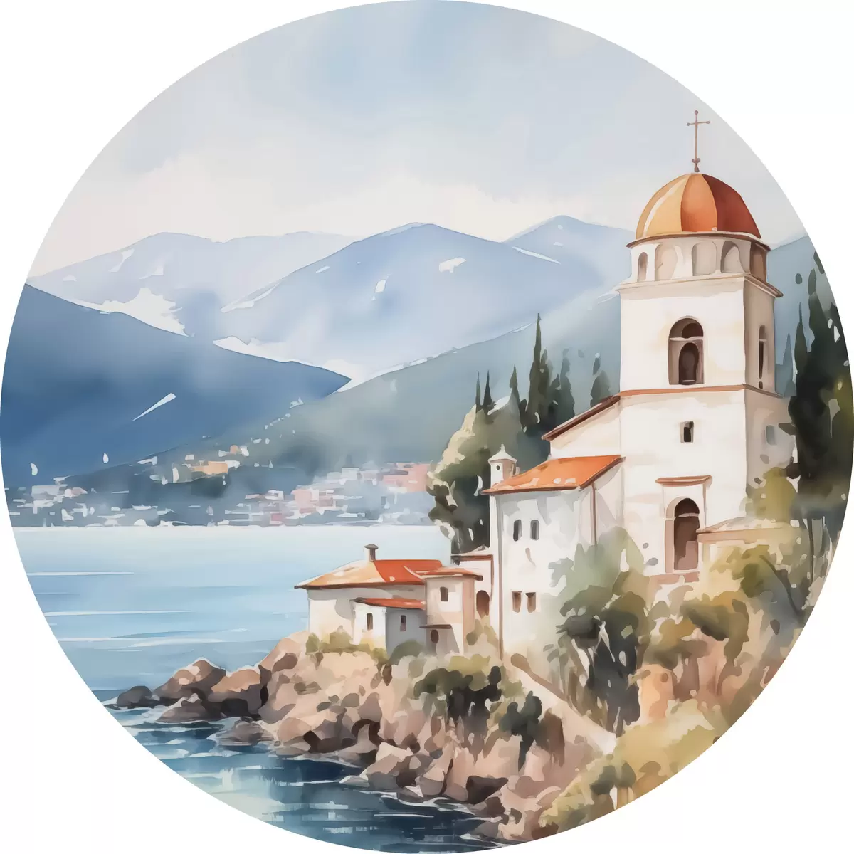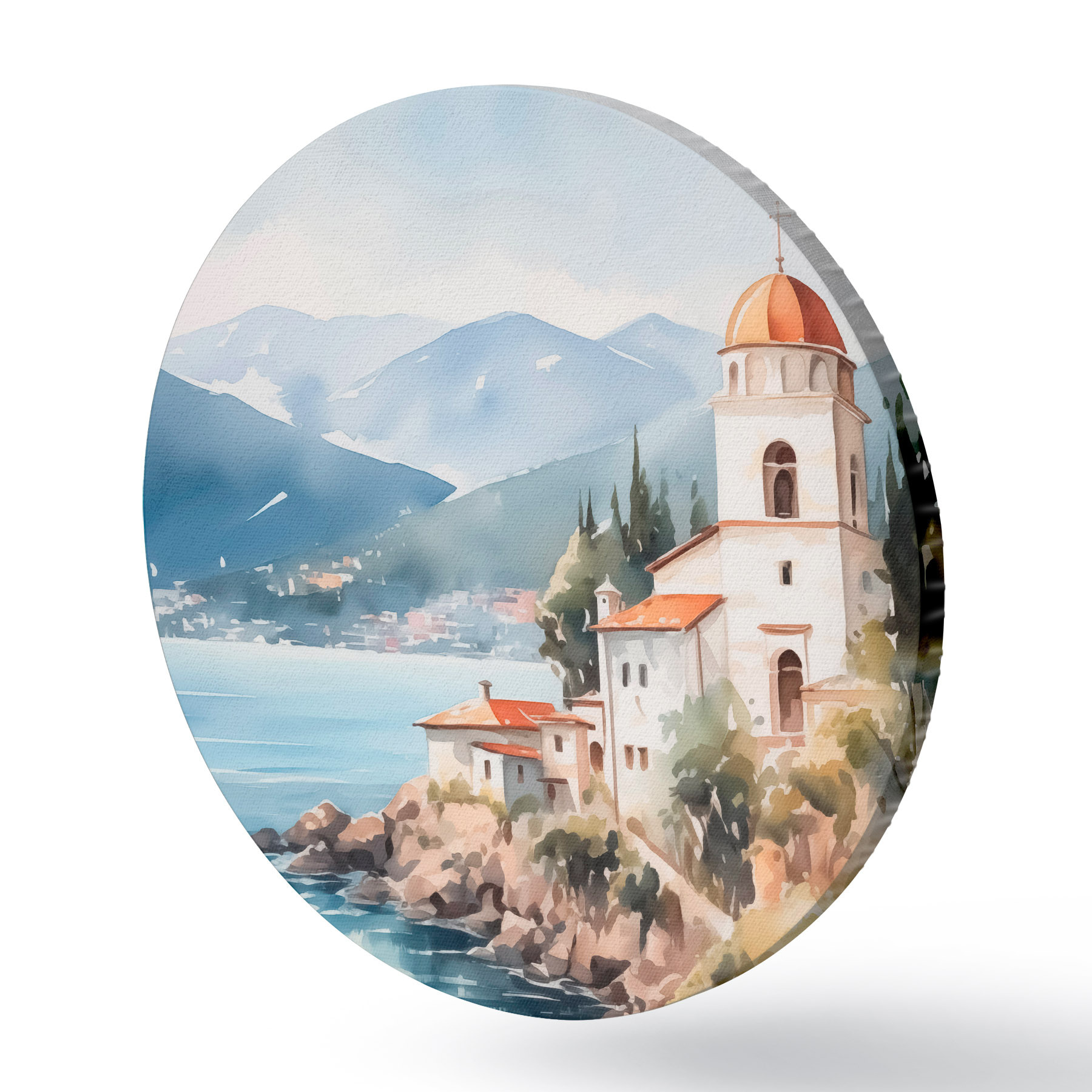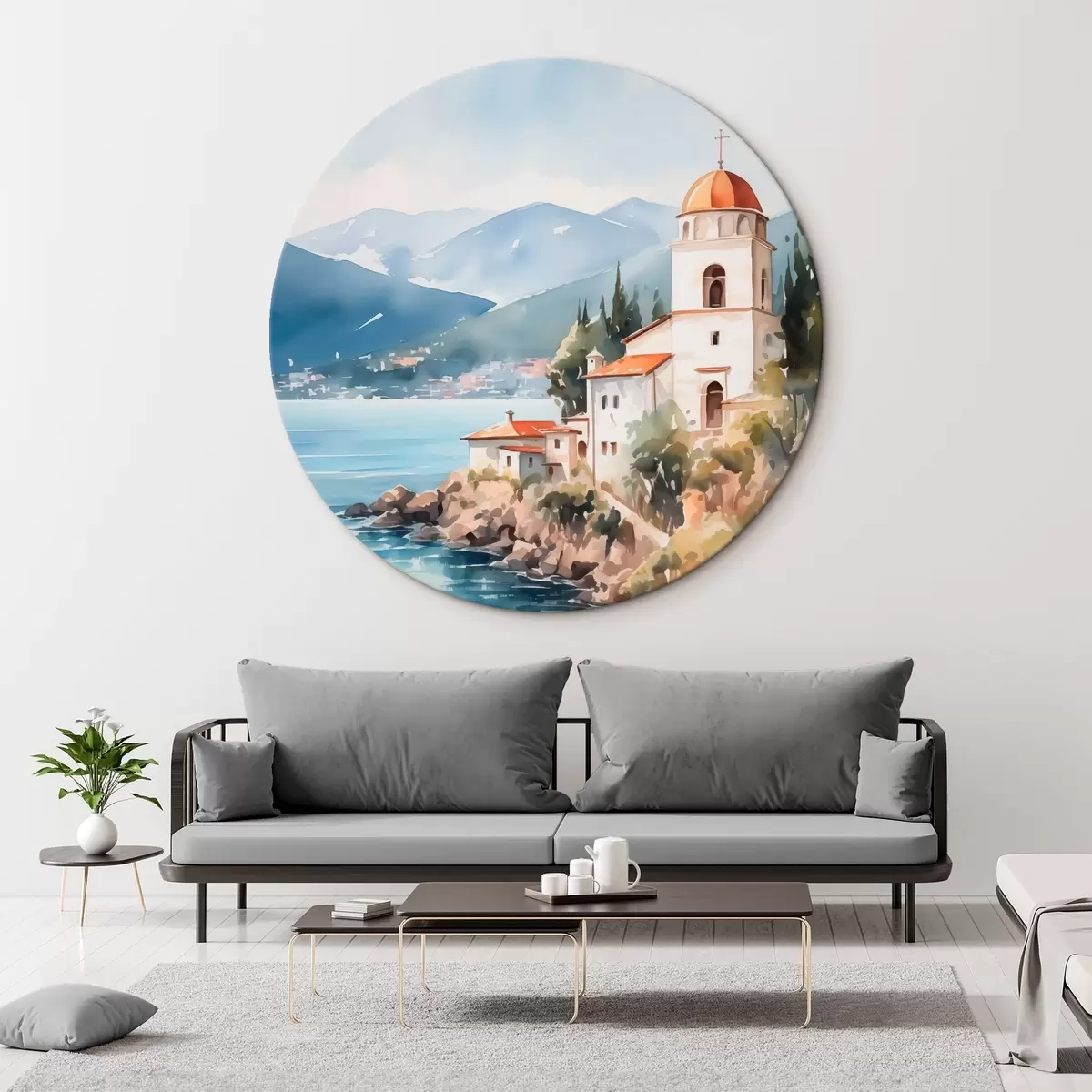 Cuadros redondos Iglesia junto al mar con montañas al fondo r42962