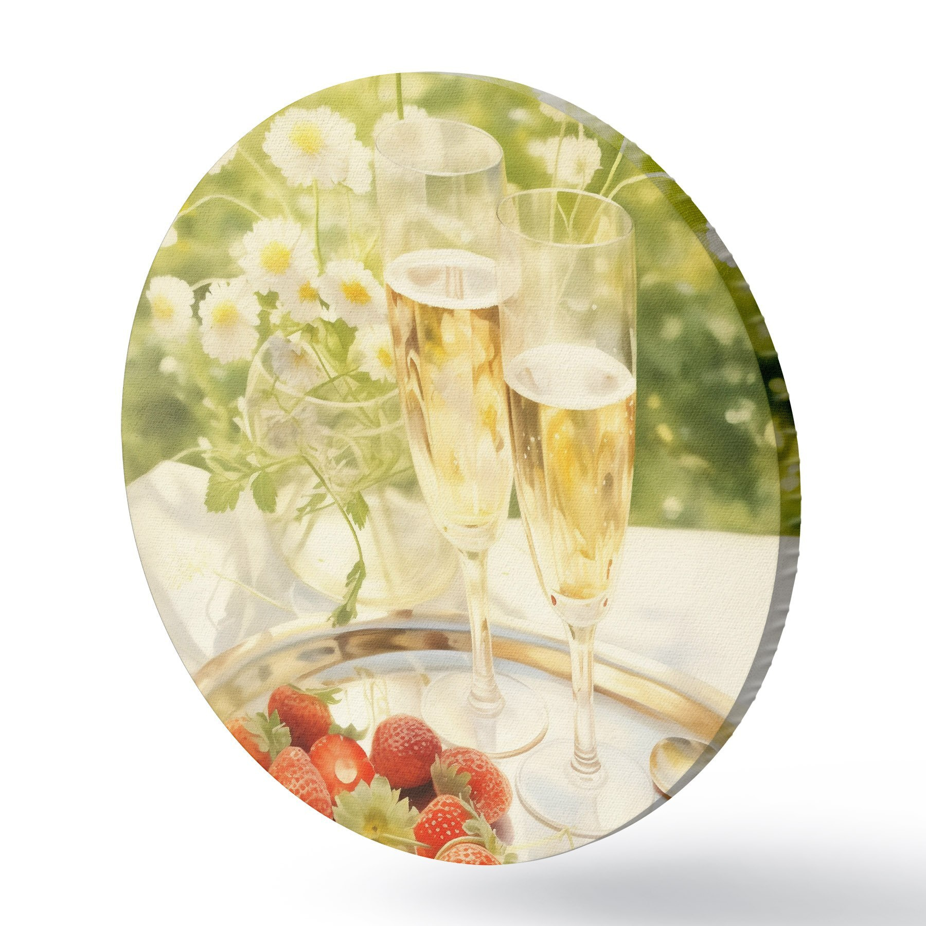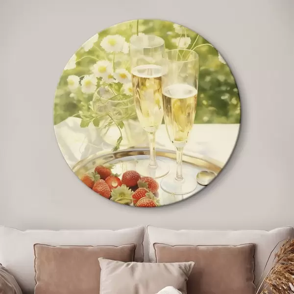 Cuadros redondos Copas de champán con fresas en la bandeja, flores de manzanilla, verano r43054