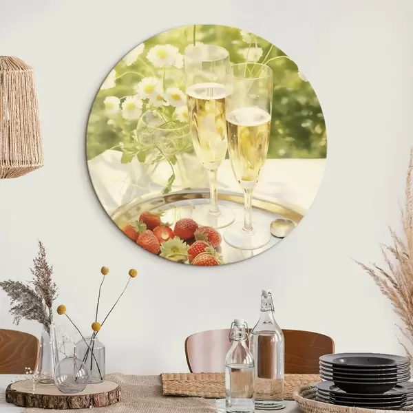 Cuadros redondos Copas de champán con fresas en la bandeja, flores de manzanilla, verano r43054