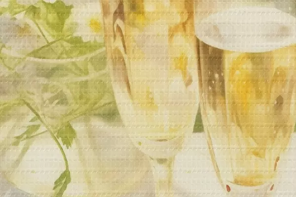 Foto Copas de champán con fresas en la bandeja, flores de manzanilla, verano Nr r43054