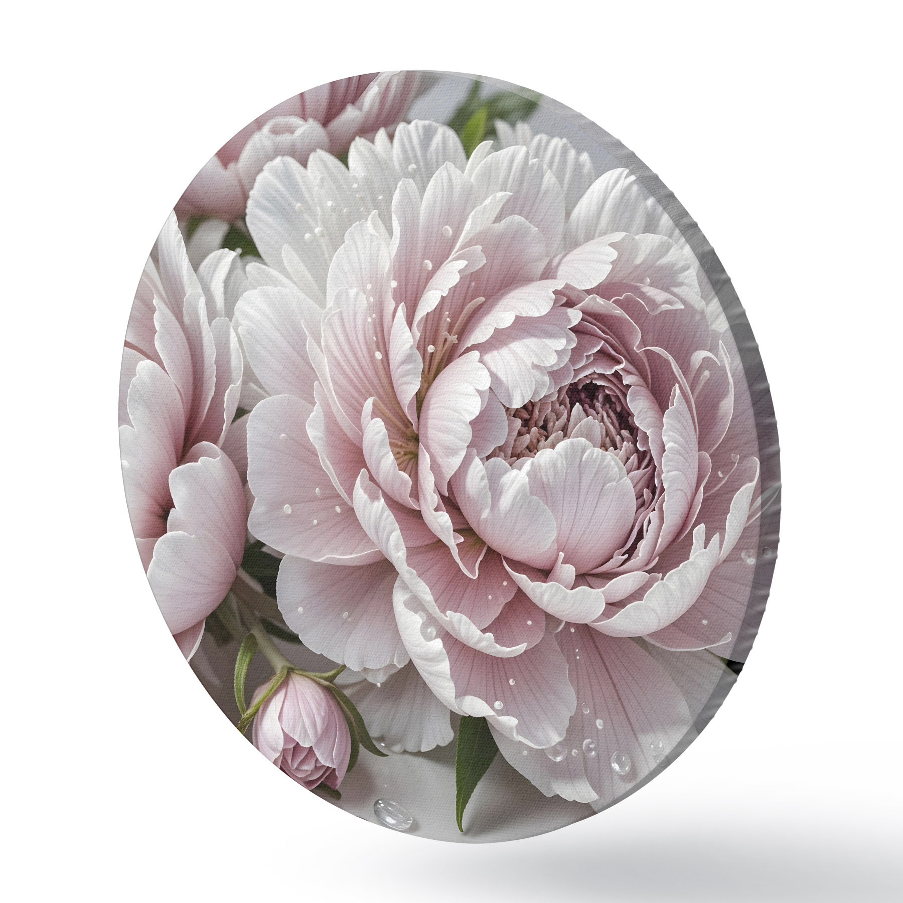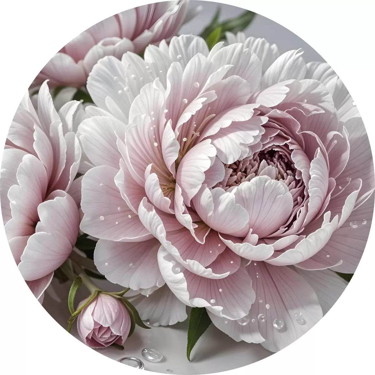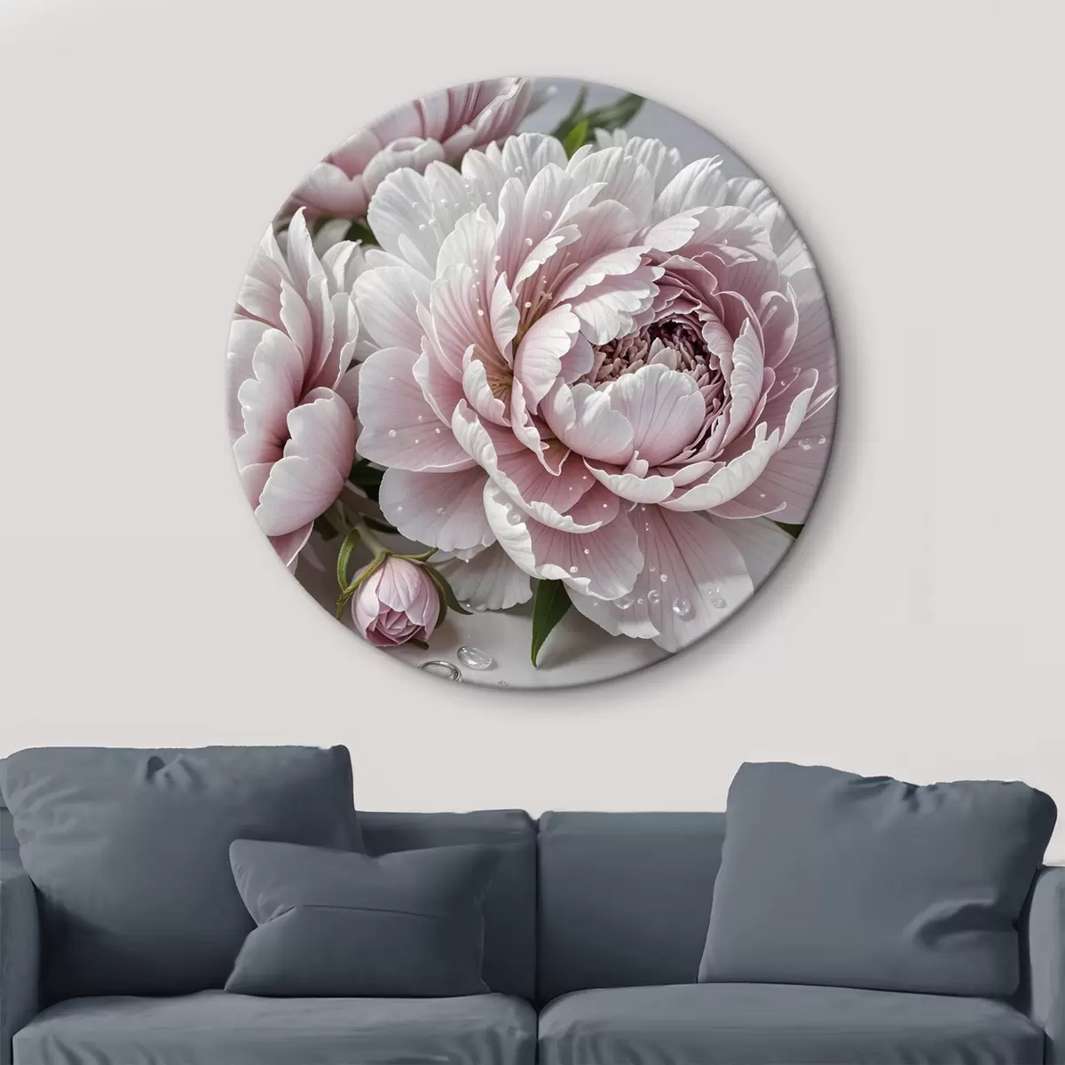 Cuadros redondos Peonías de color rosa claro y blanco con gotas de agua en los pétalos, el fondo es una superficie blanca r43158