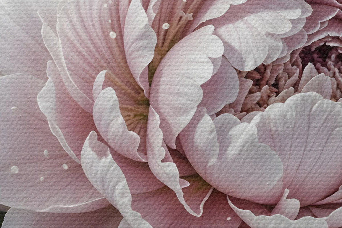 Foto Peonías de color rosa claro y blanco con gotas de agua en los pétalos, el fondo es una superficie blanca Nr r43158