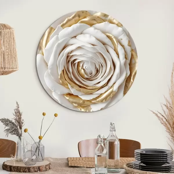 Cuadros redondos Una rosa decorativa minimalista blanca con detalles amarillos, los pétalos están en capas y rizados r43160