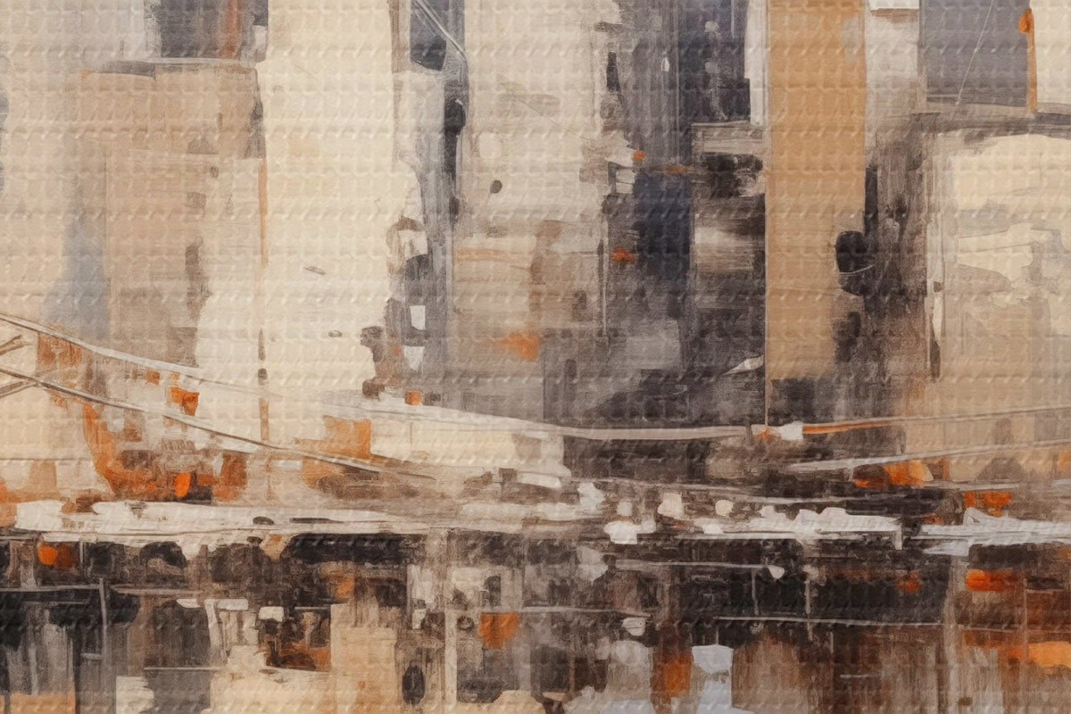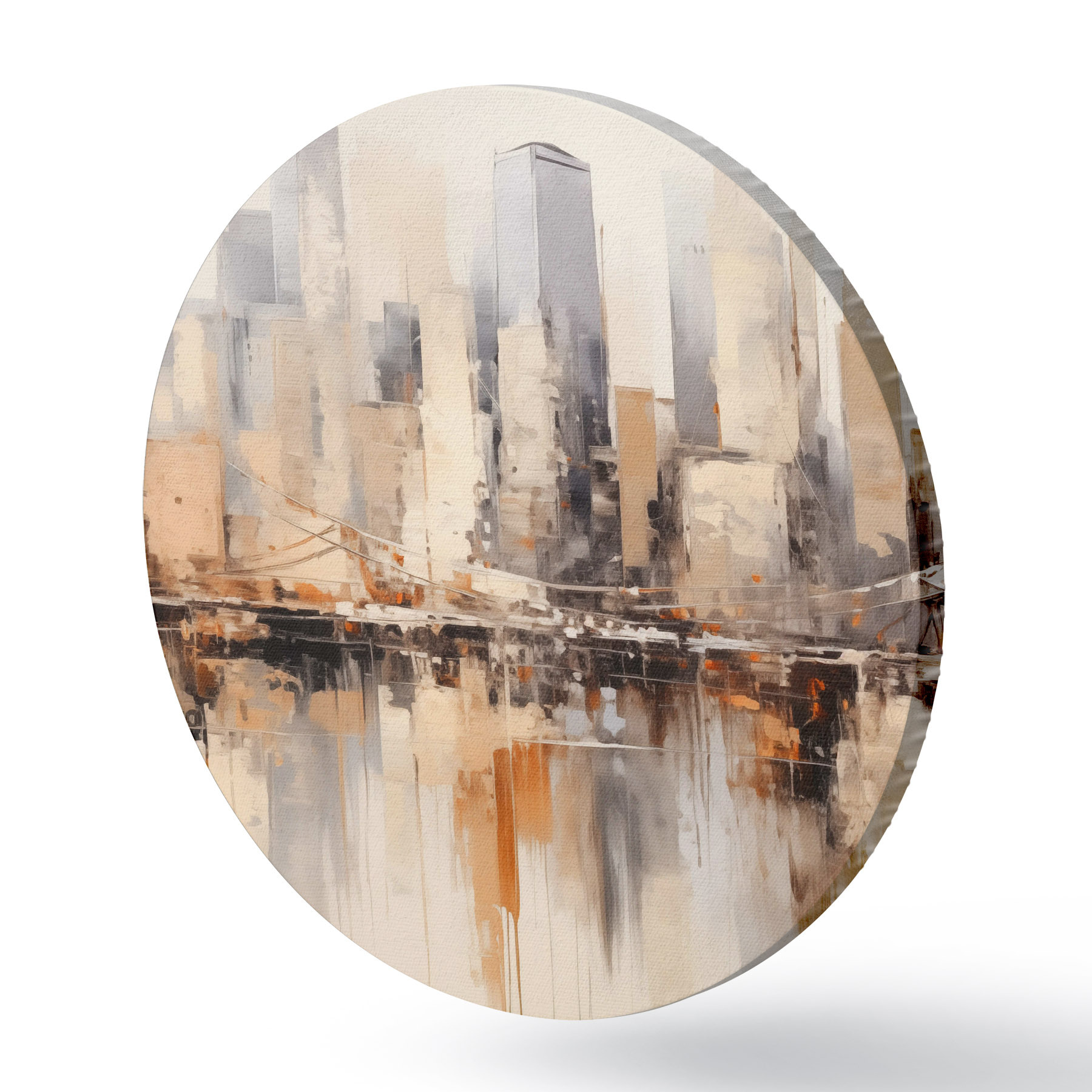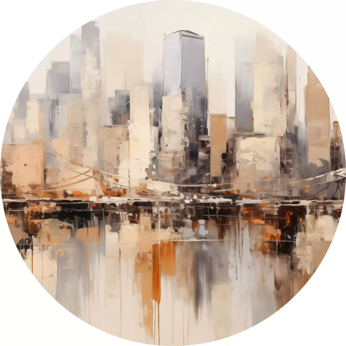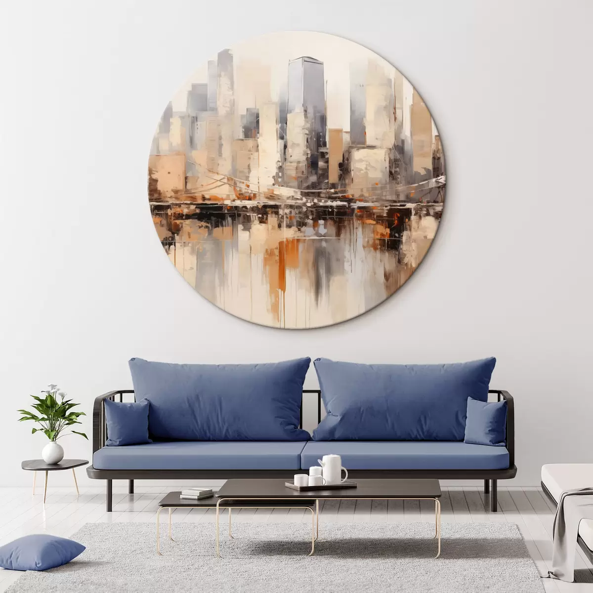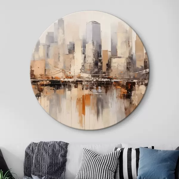 Cuadros redondos Paisaje urbano abstracto con edificios altos en tonos marrones, grises y blancos, reflejados en el agua r43168