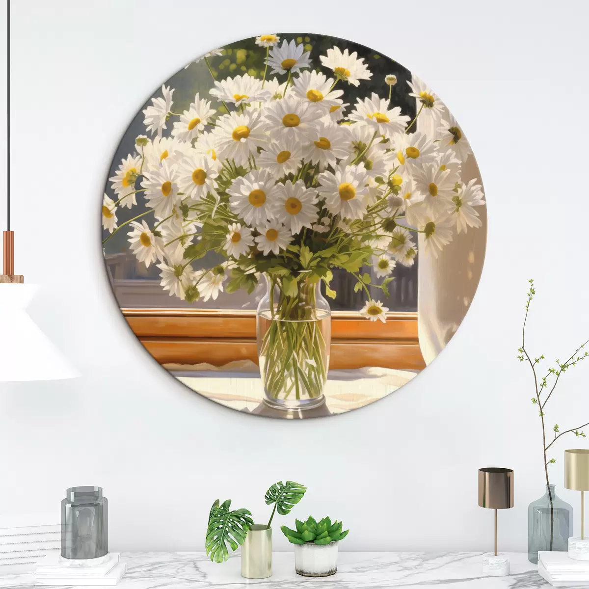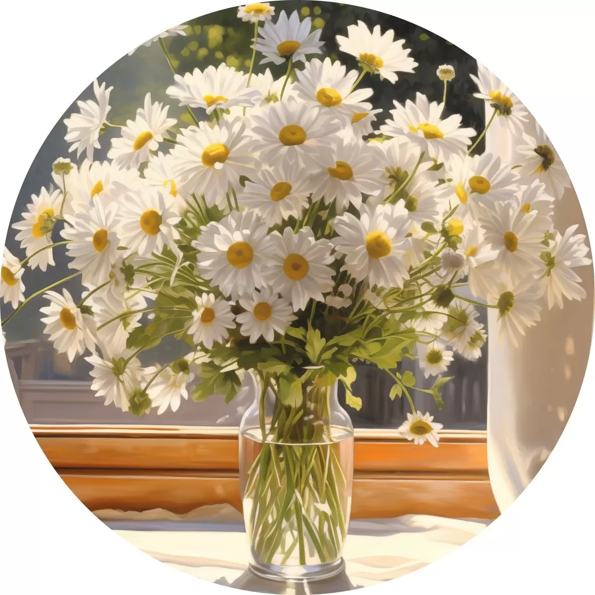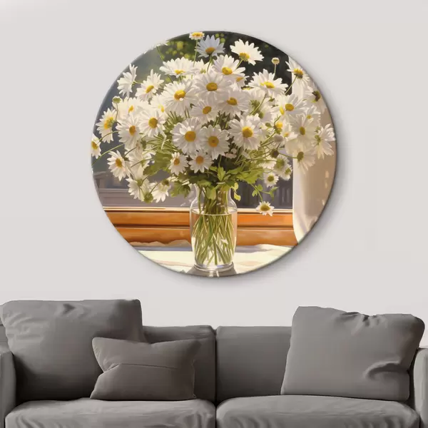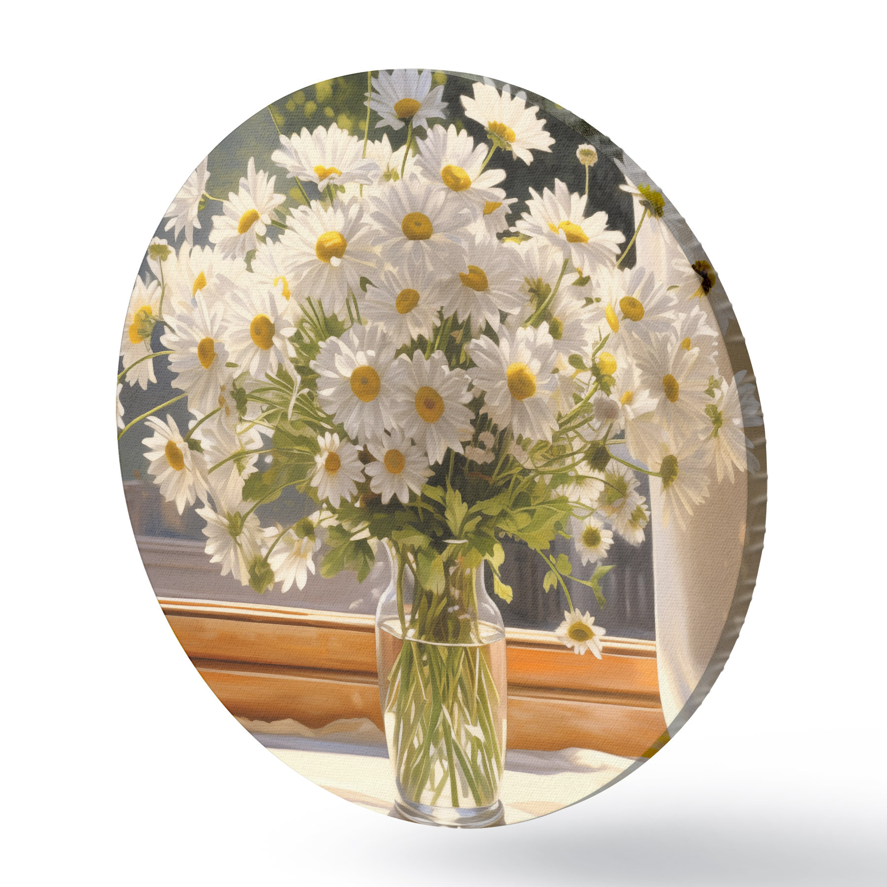 Cuadros redondos Pintura al óleo imitación de un jarrón con margaritas blancas en el alféizar de una ventana, día soleado, paleta de colores cálidos r43171