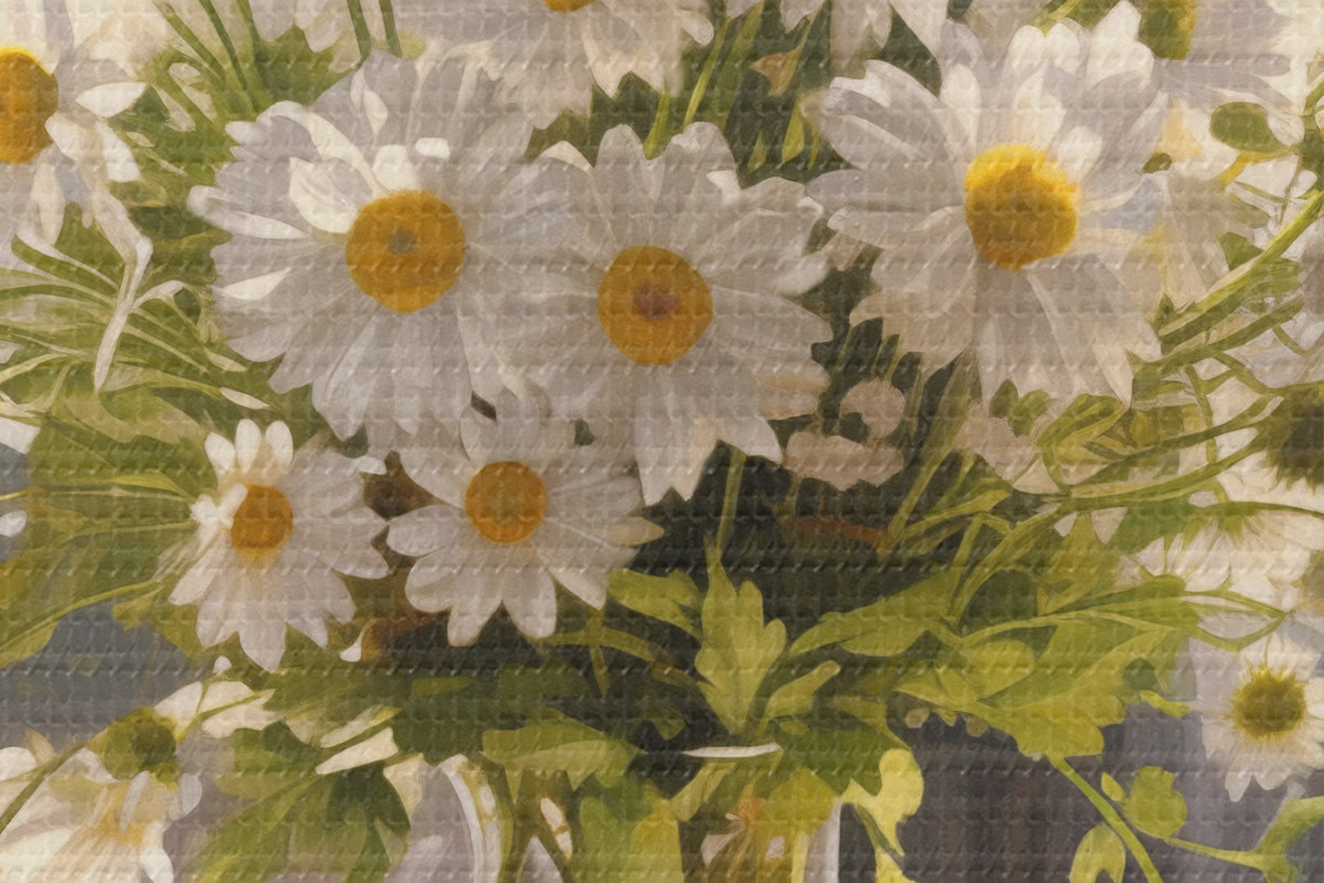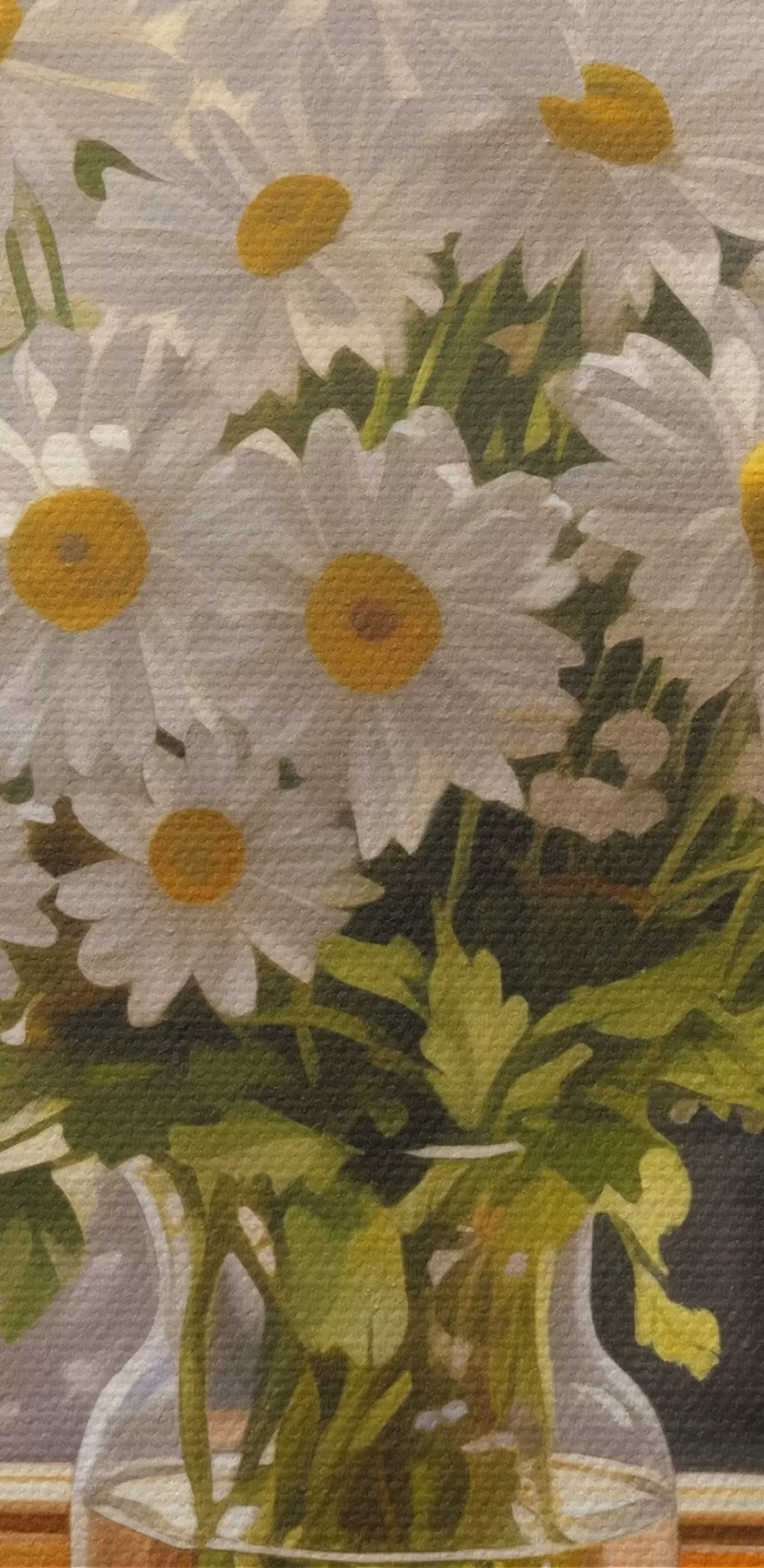 Foto Pintura al óleo imitación de un jarrón con margaritas blancas en el alféizar de una ventana, día soleado, paleta de colores cálidos Nr r43171