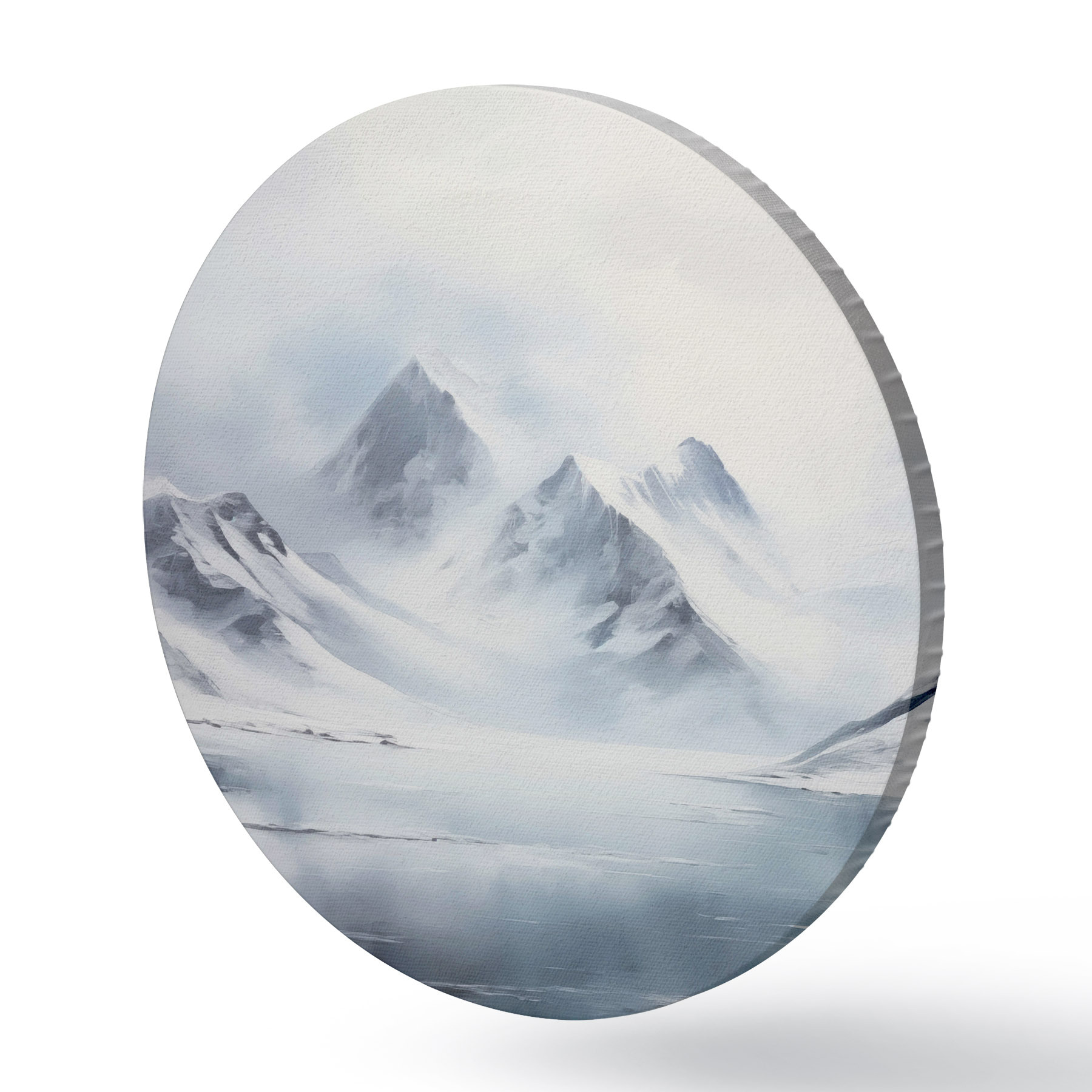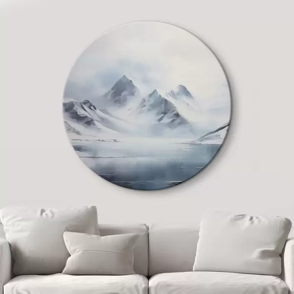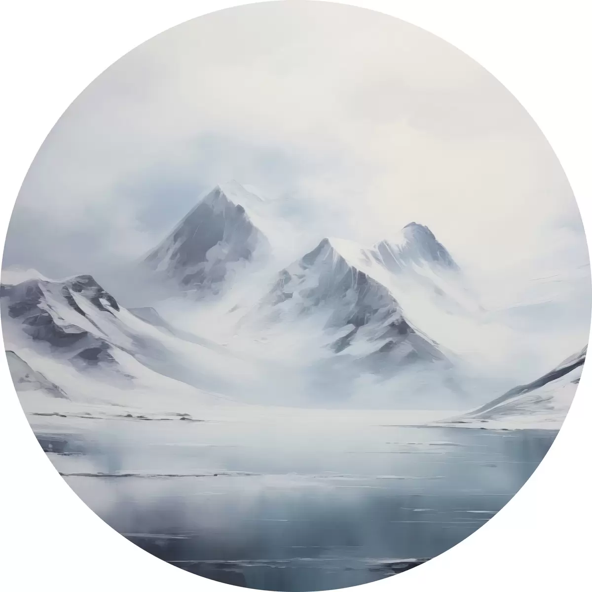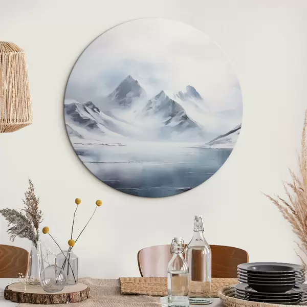 Cuadros redondos Paisaje de montañas nevadas con un lago en primer plano, los picos están cubiertos de nieve y el cielo está nublado r43174